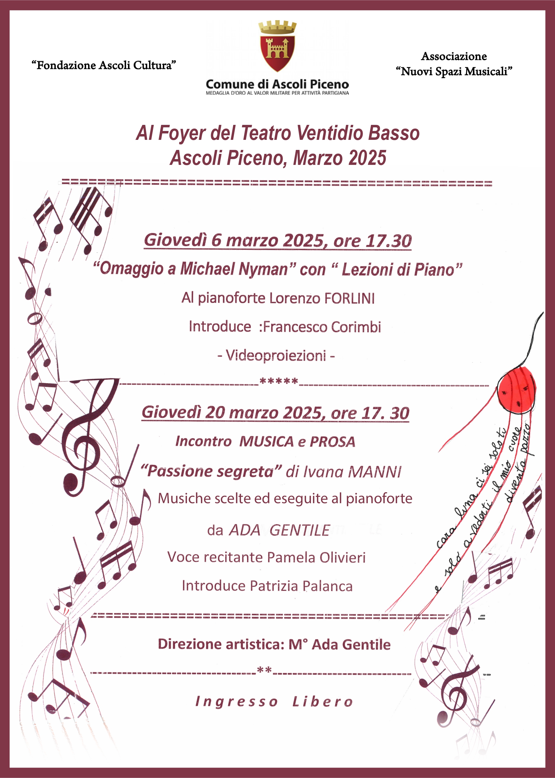 Il secondo appuntamento è fissato per il 20 marzo, sempre alle ore 17.30, al Foyer del Teatro V. Basso, , con un “Incontro Musica e Prosa” con la scrittrice ascolana Ivana Manni che presenta un suo recentissimo lavoro dal titolo “Passione segreta” che verrà letto dall’attrice Pamela Olivieri con l’accompagnamento al pianoforte di Ada Gentile con cui la Manni ha collaborato negli anni realizzando i testi di alcune sue opere. I due eventi sono realizzati dall’Associazione “Nuovi Spazi Musicali” e dalla Fondazione Ascoli Cultura, con il patrocinio del Comune di Ascoli Piceno.