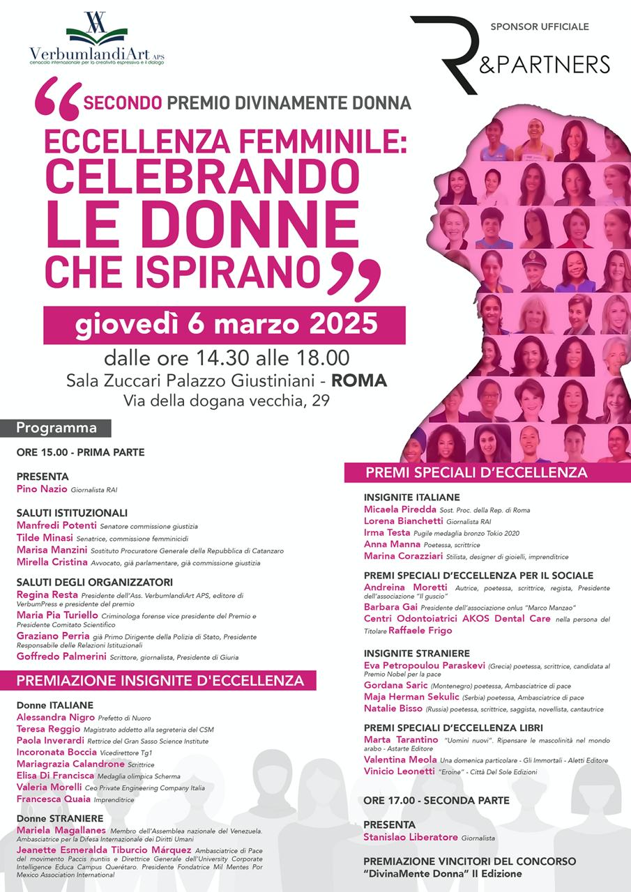 Sono questi, in estrema sintesi, le tematiche di fondo i principi valoriali del progetto DivinaMente Donna alla base del Premio internazionale Eccellenza Femminile “Celebrando le Donne che ispirano”, chel’associazione culturale VerbumlandiArt promuove ed organizza quale riconoscimento al valore, al talento e all’esempio delle Donne impegnate nei diversi campi di attività, che con la loro opera muovono il cambiamento e il progresso della società. Come già la prima edizione, anche quest’anno l’evento celebrativo, in prossimità della Giornata internazionale della Donna, sarà ospitato dal Senato della Repubblica e si svolgerà giovedì 6 marzo 2025 nella splendida Sala Zuccari di Palazzo Giustiniani (Roma, Via della Dogana Vecchia, 29) dalle ore 14:30. Curatore e conduttore della cerimonia di premiazione sarà Pino Nazio, giornalista Rai, sociologo e scrittore.