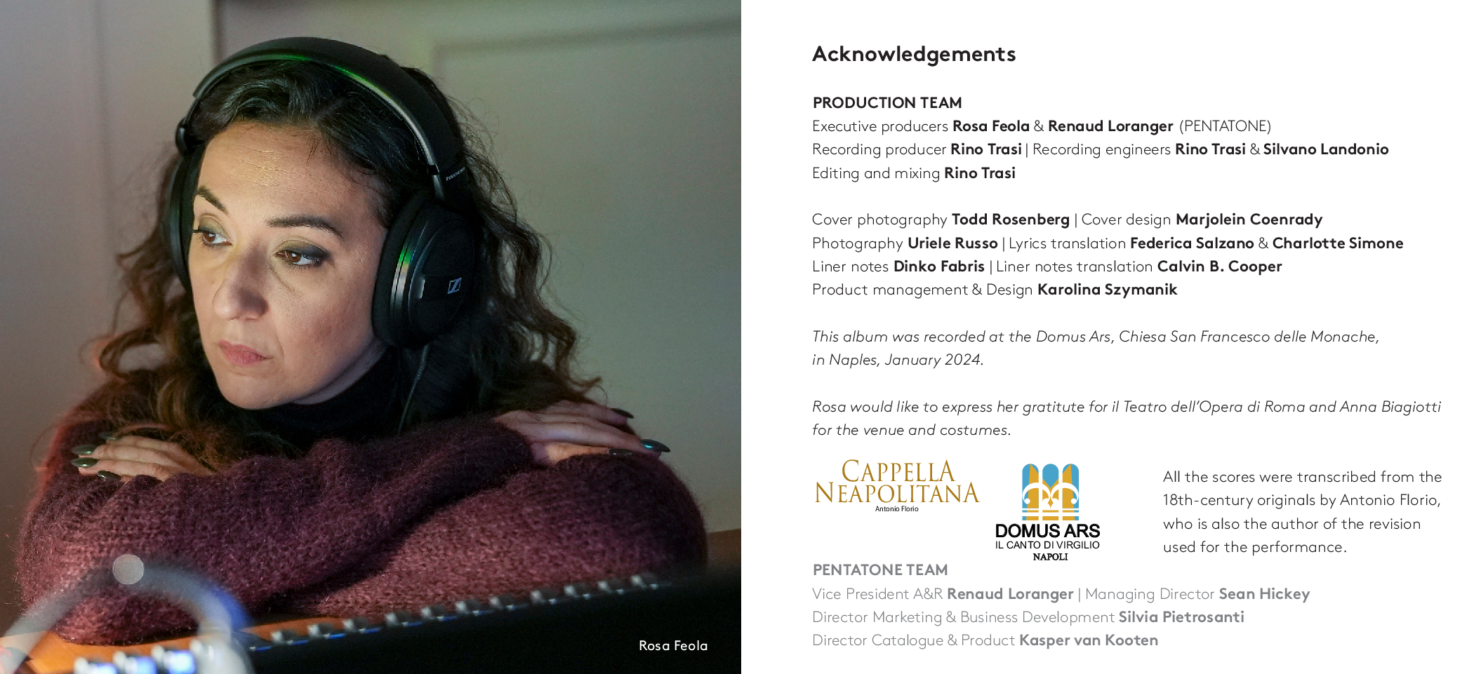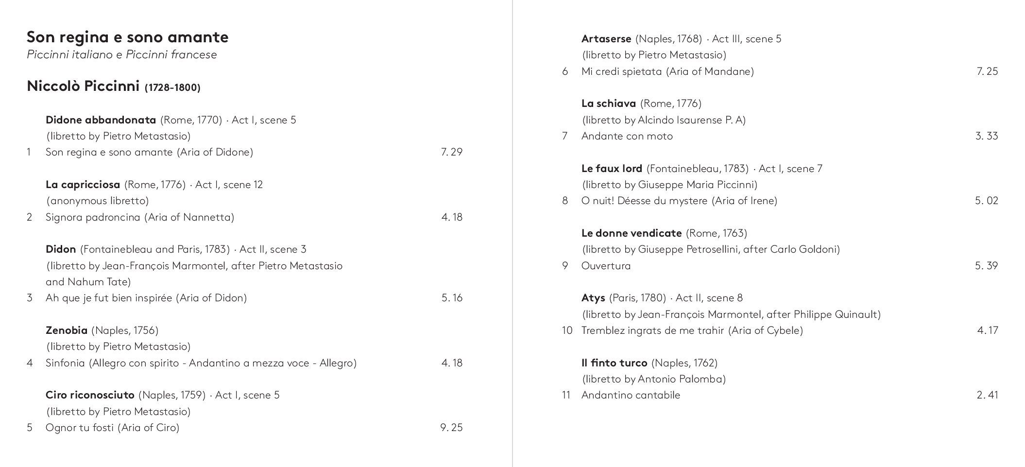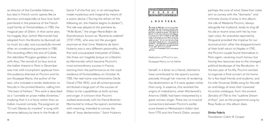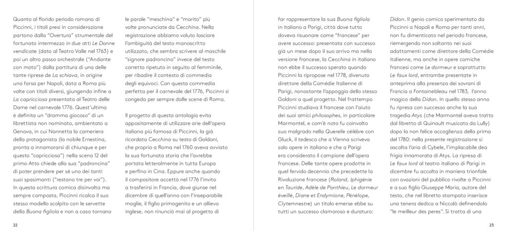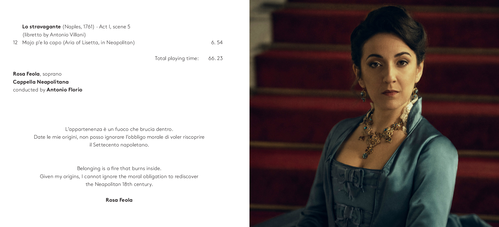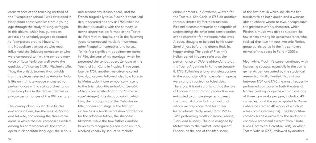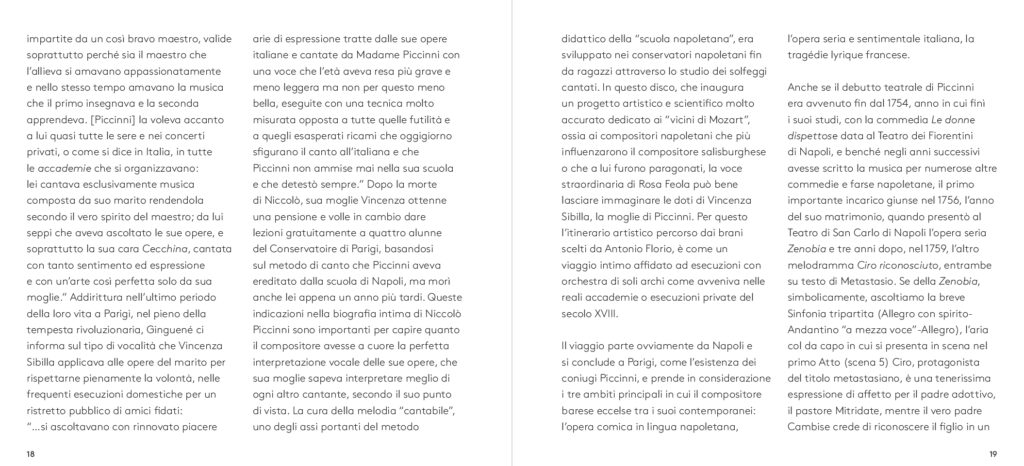 Dalla più celebre Didone Abbandonata su libretto di Metastasio, da cui l’aria di Didone che dà il titolo all’album, alla meno nota operetta comica francese Le faux lord, “Son regina e sono amante” ripercorre dunque l’intera carriera del compositore barese. A guidare la scelta e l’orchestrazione dei brani, accuratamente selezionati da Feola, Florio – che con Piccinni condivide il luogo di nascita – e il musicologo Dinko Fabris e trascritti dagli originali del XVIII secolo, il desiderio di farli rivivere nella loro dimensione più intima: quella delle esecuzioni private dell’epoca che spesso vedevano protagonista la voce della moglie di Piccinni, Vincenza Sibilla, figura preziosa per il successo del grande musicista. L’interpretazione di Rosa Feola, accompagnata da un’orchestra di soli archi, valorizza così la ricchezza espressiva e stilistica del canto settecentesco, quella cura della melodia “cantabile»a fondamento della scuola napoletana, in un tributo che va oltre Piccinni stesso per celebrare la grande tradizione del canto lirico italiano, da poco riconosciuto patrimonio immateriale dell’umanità dall’UNESCO.