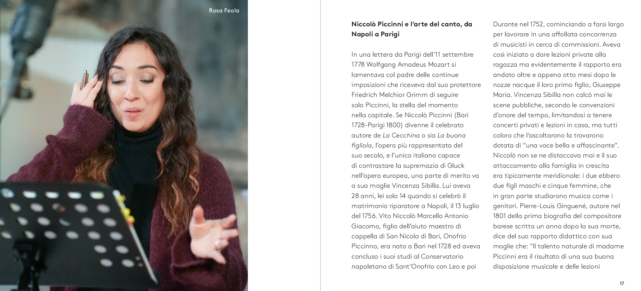 Tra i soprani italiani più apprezzati a livello internazionale, Rosa Feola è ospite abituale dei più prestigiosi teatri d’opera al mondo. Tra i suoi prossimi impegni figurano Le nozze di Figaro (Susanna) al Metropolitan di New York e Rigoletto (Gilda) alla Los Angeles Opera a maggio, la Missa Solemnis di Beethoven al Teatro alla Scala a luglio e, nello stesso mese, La traviata (Violetta) all’Arena di Verona, dove canterà anche ad agosto nel Rigoletto. Nel 2020, le è stato assegnato il Premio Speciale del Festival dei Due Mondi di Spoleto. Allieva di Renata Scotto, ha all’attivo una lunga collaborazione con Riccardo Muti, che all’inizio della sua carriera l’ha resa protagonista della riscoperta del repertorio della scuola napoletana. Molto richiesta anche come concertista, tra le varie occasioni ha partecipato ai BBC Proms alla Royal Albert Hall di Londra, al concerto inaugurale del Ravenna Festival nel 2020 sotto la direzione di Muti, al Concerto di Capodanno 2021 del Teatro La Fenice di Venezia diretto da Daniel Harding e a diversi concerti con la Chicago Symphony Orchestra, sempre con Muti sul podio.