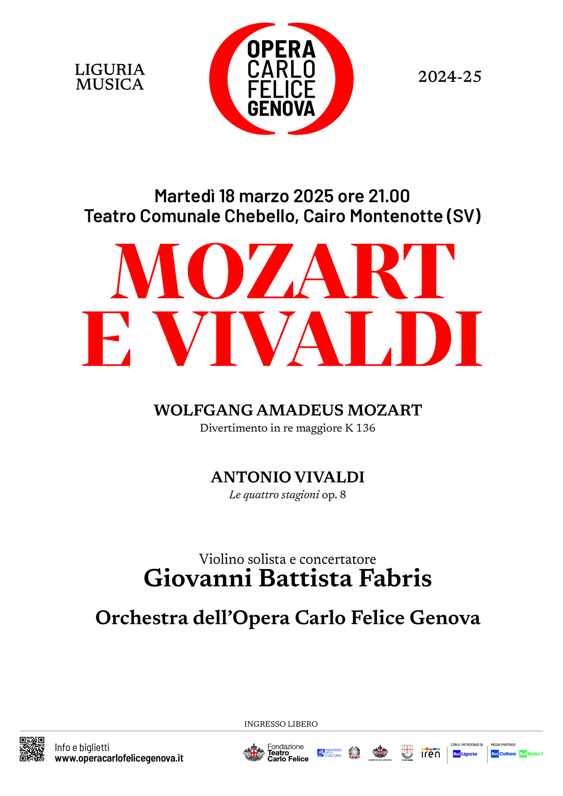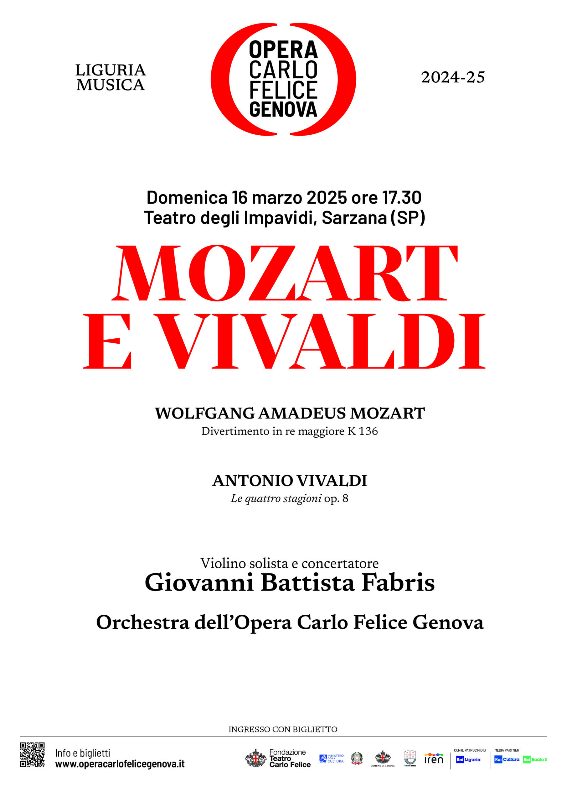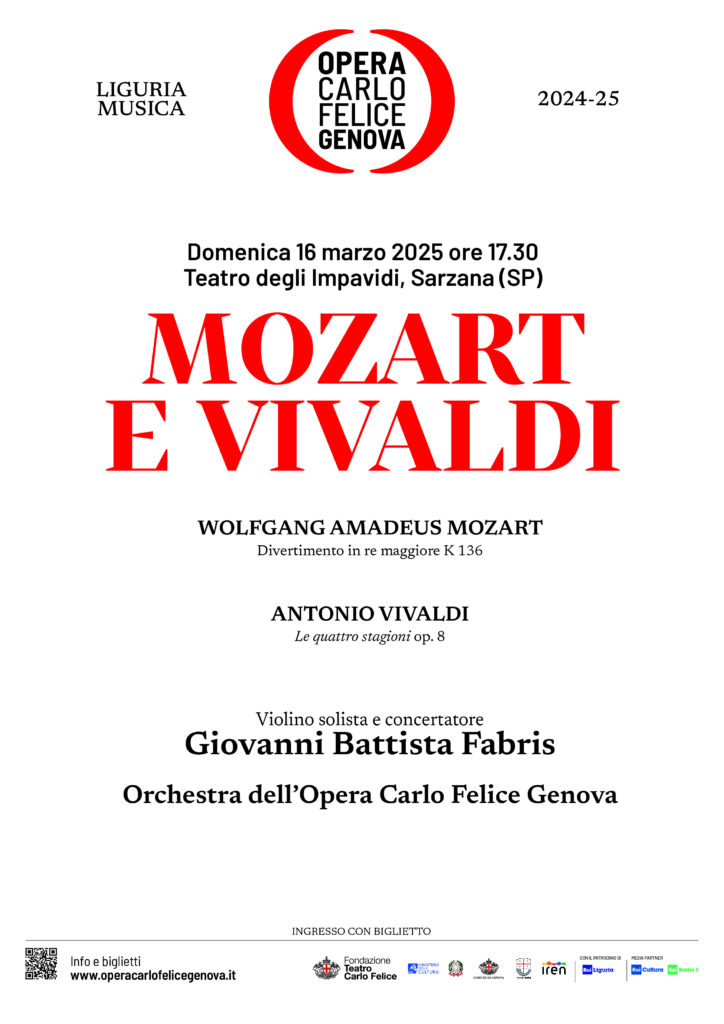 Per la rassegna Liguria Musica, il Violino solista e concertatore Giovanni Battista Fabris e l’Orchestra dell’Opera Carlo Felice saranno protagonisti di Mozart e Vivaldi, un concerto in tre date domenica 16 marzo alle ore 17.30 al Teatro degli Impavidi di Sarzana, martedì 18 marzo alle ore 21.00 al Teatro Comunale Chebello di Cairo Montenotte e mercoledì 19 marzo alle ore 21.00 alla Chiesa di Sant’Anna di Rapallo.