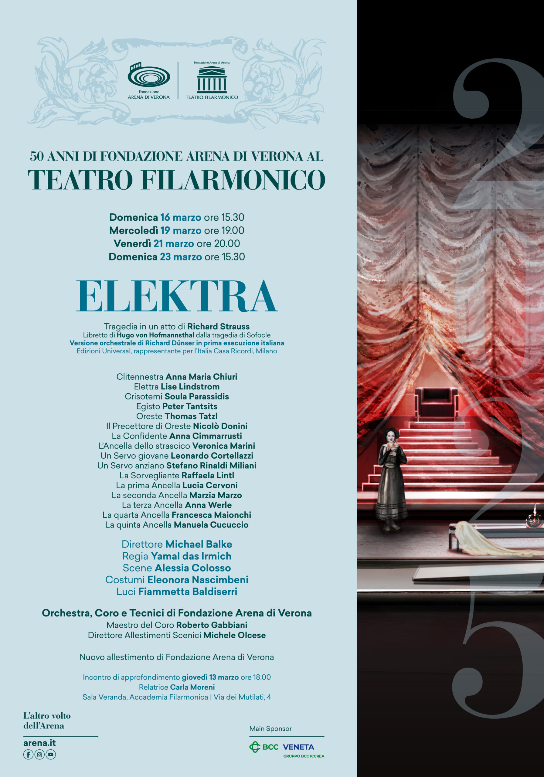 Inserita all’interno della programmazione ufficiale del Comune di Verona per l’8 marzo, “Il Potere delle donne”, Elektra è il terzo titolo della Stagione Lirica 2025, ricca di capolavori rari e prime esecuzioni al Teatro Filarmonico: è ancora possibile acquistare nuovi carnet e biglietti singoli per ogni data al link https://www.arena.it/it/teatro-filarmonico, alla Biglietteria dell’Arena e, due ore prima di ogni recita, alla Biglietteria stessa del Teatro Filarmonico in via Mutilati.