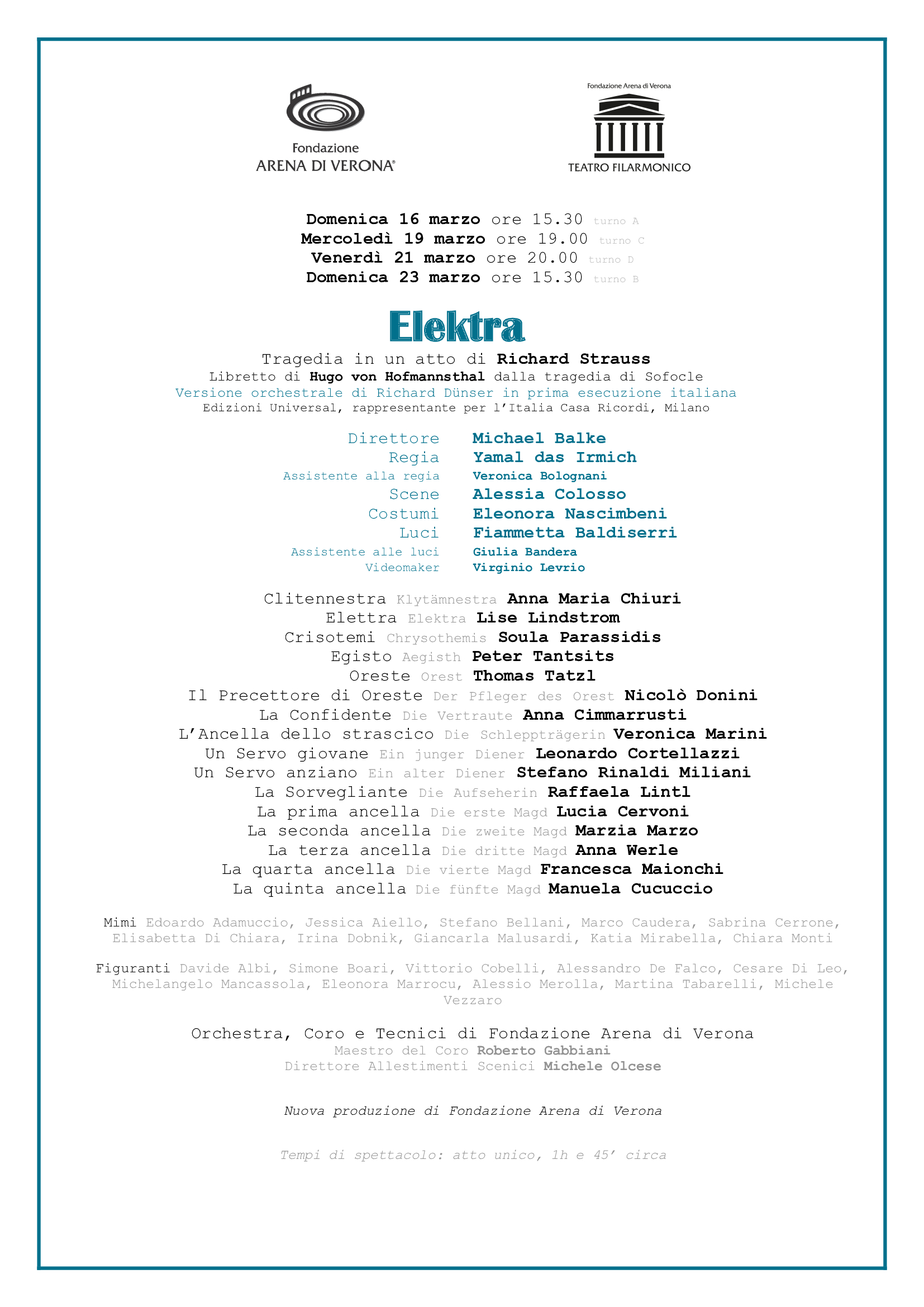 Per questo ruolo titanico serve una protagonista di rango, come soprano e attrice: a Verona sarà Lise Lindstrom, specialista del ruolo, già applaudita anche in Arena, come Anna Maria Chiuri che vestirà i panni della tormentata Clitennestra. Crisotemi, voce lirica, è affidata a Soula Parassidis, al debutto veronese come il baritono Thomas Tatzl quale Oreste e il tenore Peter Tantsits quale Egisto. Completano il folto cast giovani artisti emergenti della scena internazionale: Nicolò Donini (Precettore), Anna Cimmarrusti (Confidente), Veronica Marini (Caudataria), Leonardo Cortellazzi e Stefano Rinaldi Miliani (Servi), Raffaela Lintl (Sorvegliante), Lucia Cervoni, Marzia Marzo, Anna Werle, Francesca Maionchi e Manuela Cucuccio (Ancelle). I servi e la corte di Micene sono voci fuori scena, affidate al Coro di Fondazione Arena di Verona diretto da Roberto Gabbiani. La densissima e lussureggiante strumentazione è realizzata dall’Orchestra di Fondazione Arena guidata da Michael Balke (direttore dell’anno agli Opus Klassik Awards 2020 e già sul podio veronese per Salome nel 2018). Per l’occasione, per la prima volta in Italia, si utilizzerà la nuovissima versione orchestrale di Richard Dünser (edita in Italia da Ricordi), che adatta lo smisurato organico straussiano (il quale richiederebbe un’orchestra di oltre 120 elementi) alle forze e all’acustica di un teatro d’opera oggi, quale è il Filarmonico, rendendo giustizia ed equilibrio sonoro alle trasparenze e alle elaborazioni tematiche originali di Strauss, altrimenti perdute nella semplice riduzione d’organico.