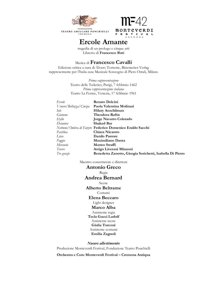Per comprendere appieno il contesto storico e il legame fra i due giganti della scuola veneziana non poteva mancare in cartellone un’opera di Francesco Cavalli, fra le principali novità di questa edizione.Antonio Greco, Direttore musicale principale del Festival, dirige la nuova produzione di Ercole Amante, che ha la regia del “Premio Abbiati” 2024 Andrea Bernard. Il raro capolavoro barocco, interpretato da “Coro e Orchestra del Monteverdi Festival – Cremona Antiqua”, è in scena al Teatro Ponchielli venerdì 27 e domenica 29 giugno.