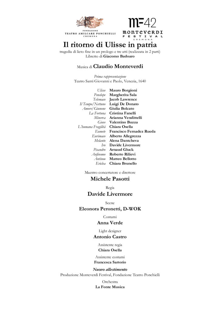 Apre il Festival al Teatro Ponchielli, venerdì 13 e sabato 14 giugno, proprio quella che è considerata l’opera più commovente di Monteverdi. Il nuovo allestimento del Ritorno di Ulisse in patria, che vede sul podio de “La Fonte Musica” Michele Pasotti, è firmato da Davide Livermore, che oltre ai panni di regista torna eccezionalmente anche nelle vesti di tenore, interpretando il parassita Iro.