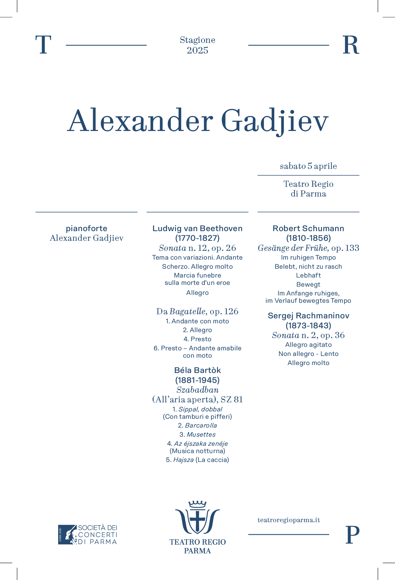 Il pluripremiato artista italo-sloveno interpreta la Sonata n. 12, op. 26, e le Bagatelle op.126 nn. 1, 2, 4, 6 di Ludwig van Beethoven, All’aria aperta di Béla Bartók, Gesänge der Frühe op. 133 di Robert Schumann e la Sonata n.2 op. 36 di Sergej Rachmaninov.