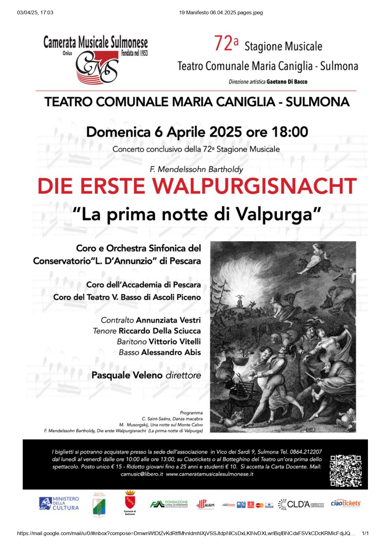 “Quest’anno più che mai una stagione fortunata “ dice il Direttore Artistico Gaetano Di Bacco che si è adoperato per rendere possibile la realizzazione di questa produzione, frutto dell’accordo tra alcune delle più importanti realtà ed istituzioni musicali del territorio. Il Conservatorio Musicale e la Società Luigi Barbara di Pescara, in sinergia con la Camerata Musicale Sulmonese, portano in scena per la prima volta in Abruzzo un capolavoro di Felix Mendelssohn poco eseguito e anche poco conosciuto: la Cantata per Soli, Coro e Orchestra Die erste Walpurgisnacht (La prima notte di Valpurga) su Testo di J. W. von Goethe.
