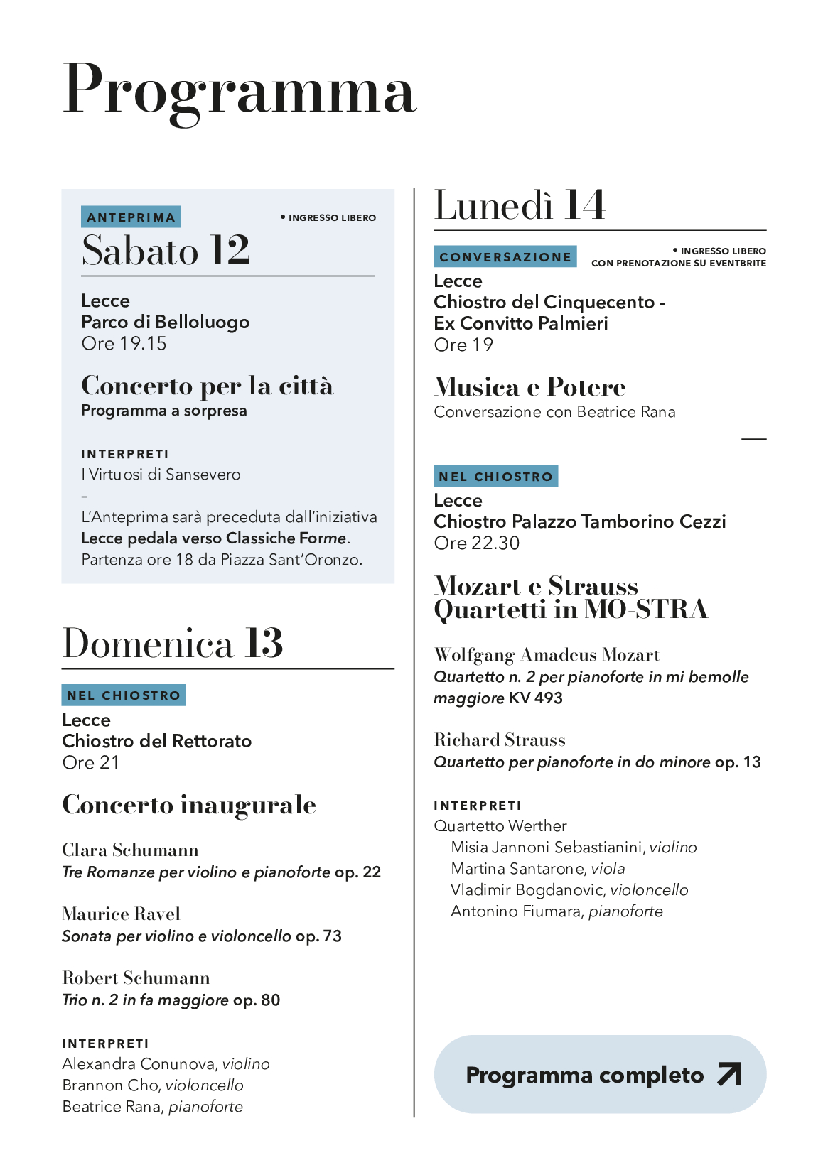 Il festival avrà un’anteprima internazionale alla Wigmore Hall di Londra, venerdì 11 luglio, dove l’originale trio composto da Beatrice Rana (pianoforte), Alexandra Conunova (violino) e Brannon Cho (violoncello) proporrà al pubblico lo stesso programma musicale che sarà presentato a Lecce nella serata inaugurale del 13 luglio (musiche di Clara Schumann, Maurice Ravel e Robert Schumann).