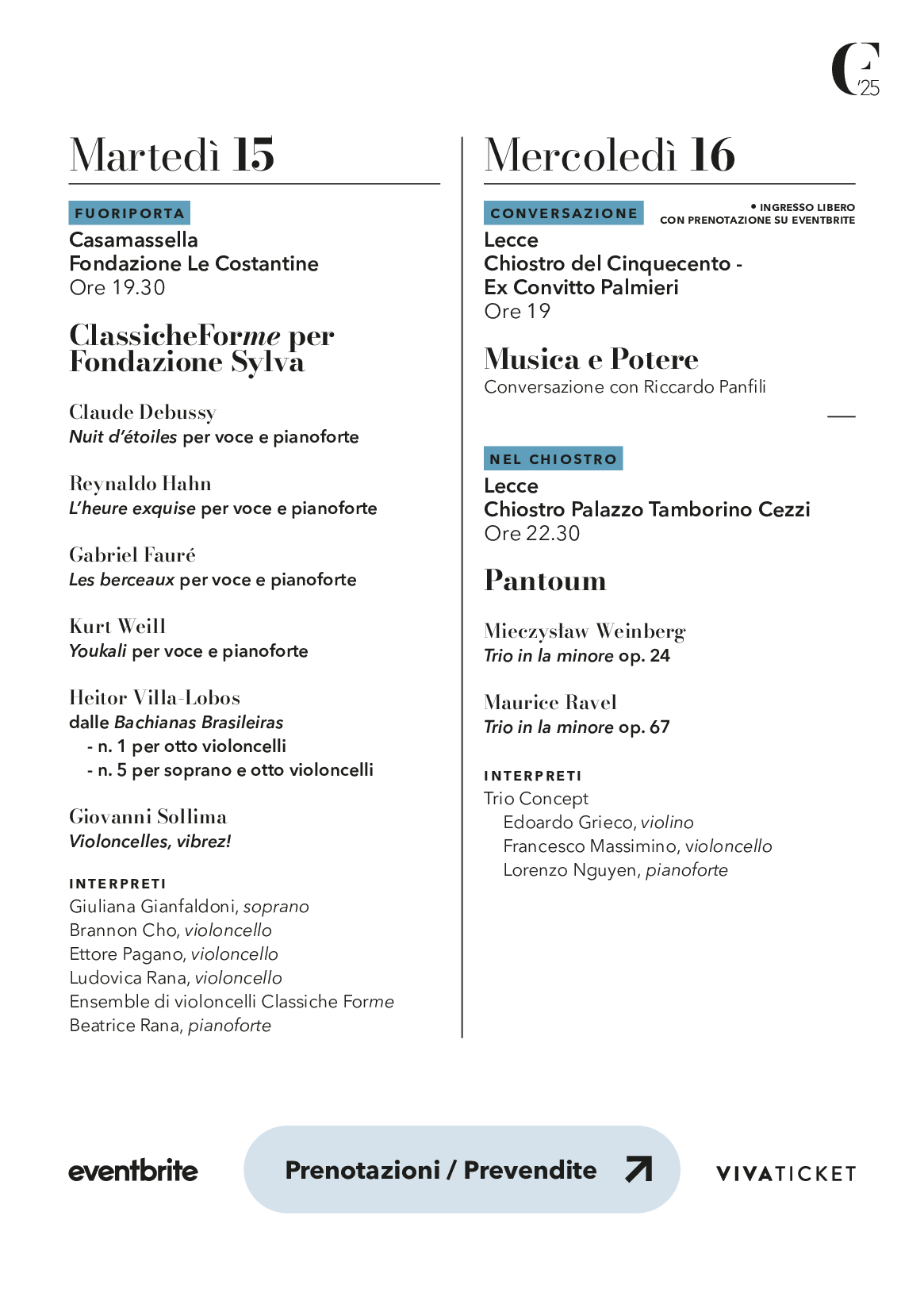 Partner tecnici Noteinviaggio, Le Stanzìe, Le Costantine, Palazzo Tamborrino Cezzi, Vivaticket, Marea, Lecce Pedala, Fabbrini, Farina pianoforti, Audiogrill Classic.