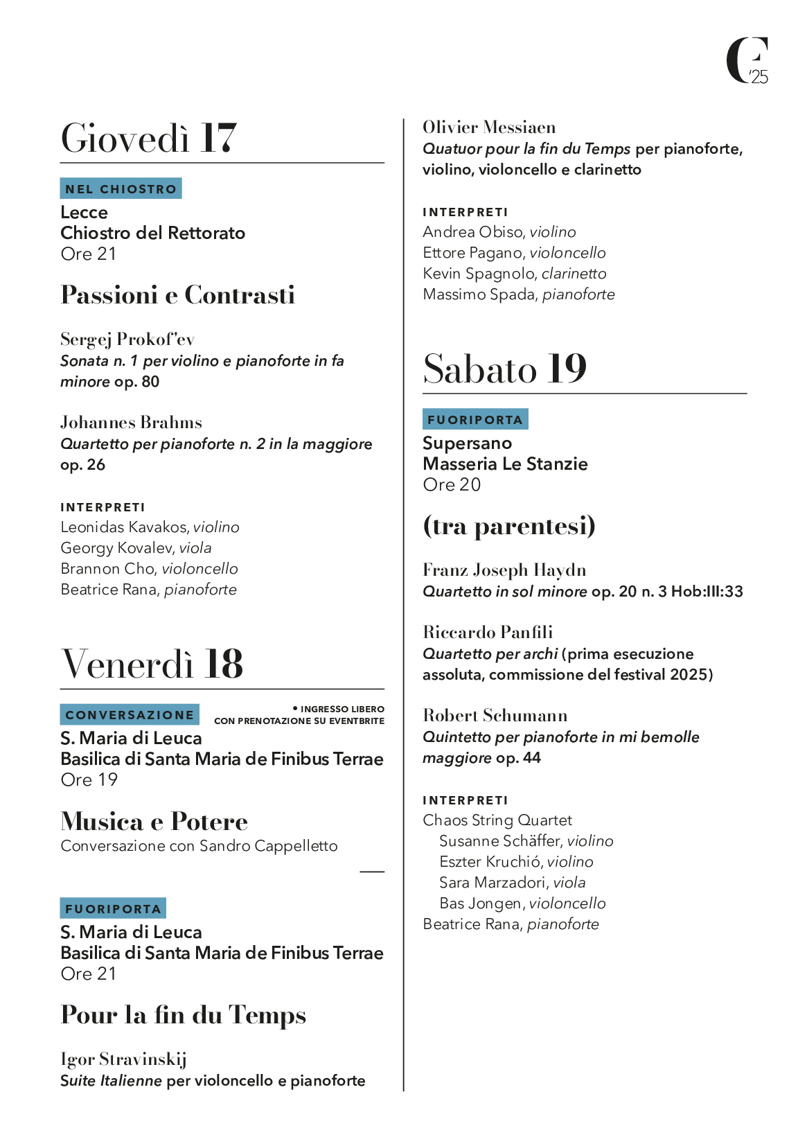 Nel 2025, accanto alla pianista salentina, ci saranno il violinista Leonidas Kavakos, già riconosciuto come figura storica dell’interpretazione violinistica e artista Sony Classical (giovedì 17 luglio); Alexandra Conunova, anche lei violinista virtuosa, vincitrice del Concorso “Joseph Joachim” di Hannover (domenica 13 luglio); Andrea Obiso, trentenne, dapprima enfant prodige e oggi violino di spalla dell’Orchestra dell’Accademia Nazionale di Santa Cecilia oltre che concertista di rilievo (venerdì 18 e domenica 20 luglio); torna il violista Georgy Kovalev (giovedì 17 e domenica 20 luglio); partecipa per la prima volta Brannonn Cho, violoncellista statunitense vincitore di prestigiosi concorsi come il Queen Elisabeth e il Cassadò, e borse di studio (domenica 13, martedì 15 e giovedì 17 luglio); Ettore Pagano, violoncellista rivelazione di questo ultimo anno, che ad appena 21 anni ha conquistato il Premio ICMA-Classeek e il Premio Abbiati dell’Associazione nazionale critici musicali (martedì 15 e venerdì 18 luglio); tra i violoncellisti non può mancare poi Ludovica Rana (martedì 15 e domenica 20 luglio), mentre Massimo Spada sarà impegnato al pianoforte, anche al fianco della direttrice artistica (venerdì 18 e domenica 20 luglio). Kevin Spagnolo è considerato tra i migliori giovani clarinettisti di oggi per profonda musicalità e abilità tecnica (venerdì 18 e domenica 20 luglio). È pugliese e in grande ascesa sui palcoscenici di tutto il mondo il soprano Giuliana Gianfaldoni (martedì 15 luglio), protagonista – insieme alla stessa Beatrice Rana al pianoforte e a un inedito gruppo di giovani star del violoncello – del concerto alla Fondazione Le Costantine a Casamassella. Tre gli organici cameristici ospiti: il Chaos String Quartet, fondato a Vienna nel 2019 e nominato BBC Radio 3 New Generation Artists per il triennio 2023-2025; il Quartetto Werther, considerato tra le più interessanti formazioni italiane vincitore del Premio Farulli / Premio Abbiati come miglior giovane ensemble del 2020 e Premio del Presidente della Repubblica alla memoria di Giuseppe Sinopoli, oltre che allievi dei Corsi dell’Accademia Nazionale di Santa Cecilia; il Trio Concept, divenuto in poco più che un decennio uno degli ensemble cameristici più premiati nella storia della musica italiana, ECHO Rising Star per la stagione 2025/2026 e ensemble in residence della 31ª edizione del Verbier Festival. È stata affidata al compositore Riccardo Panfili – già allievo di Azio Corghi e collaboratore di Hans Werner Henze – la commissione di una nuova opera (caratteristica che da sempre contraddistingue il festival ) che quest’anno è un pezzo per quartetto d’archi. La prima esecuzione avrà luogo a Supersano (Masseria Le Stanzie) sabato 19 luglio, affidata al Chaos String Quartet. I programmi musicali saranno oggetto di approfondimenti con tre conversazioni intorno alla tematica “Musica e Potere”, con Beatrice Rana (14 luglio), Riccardo Panfili (16 luglio) e Sandro Cappelletto (18 luglio).