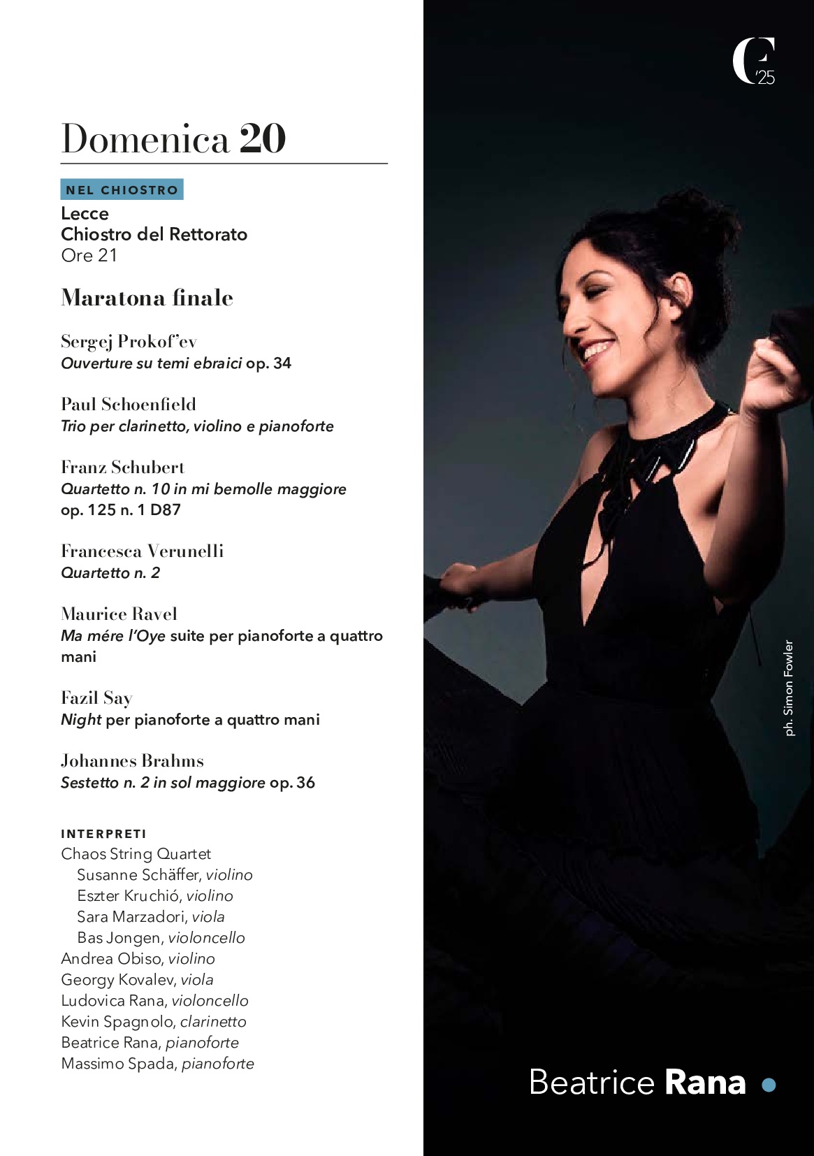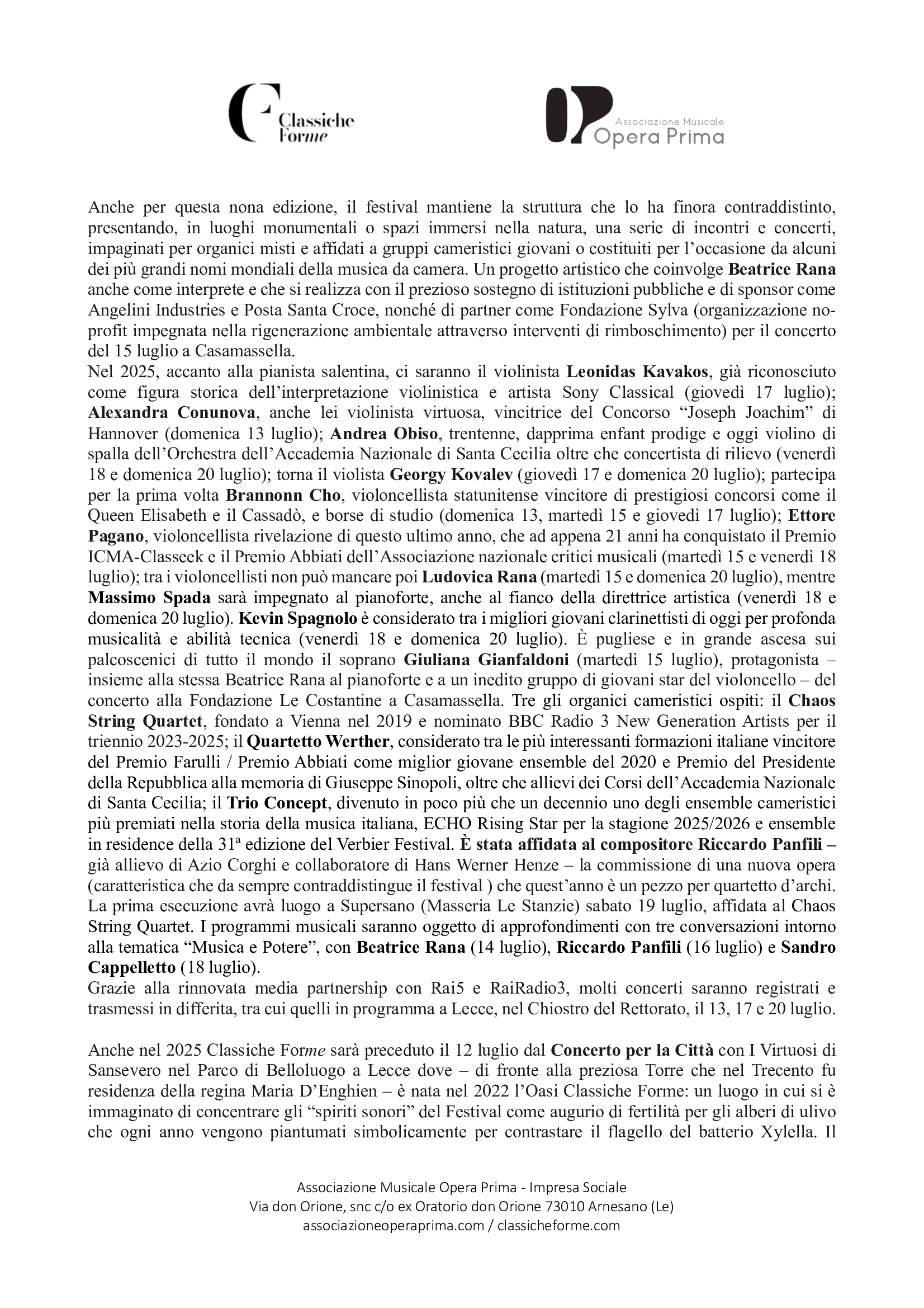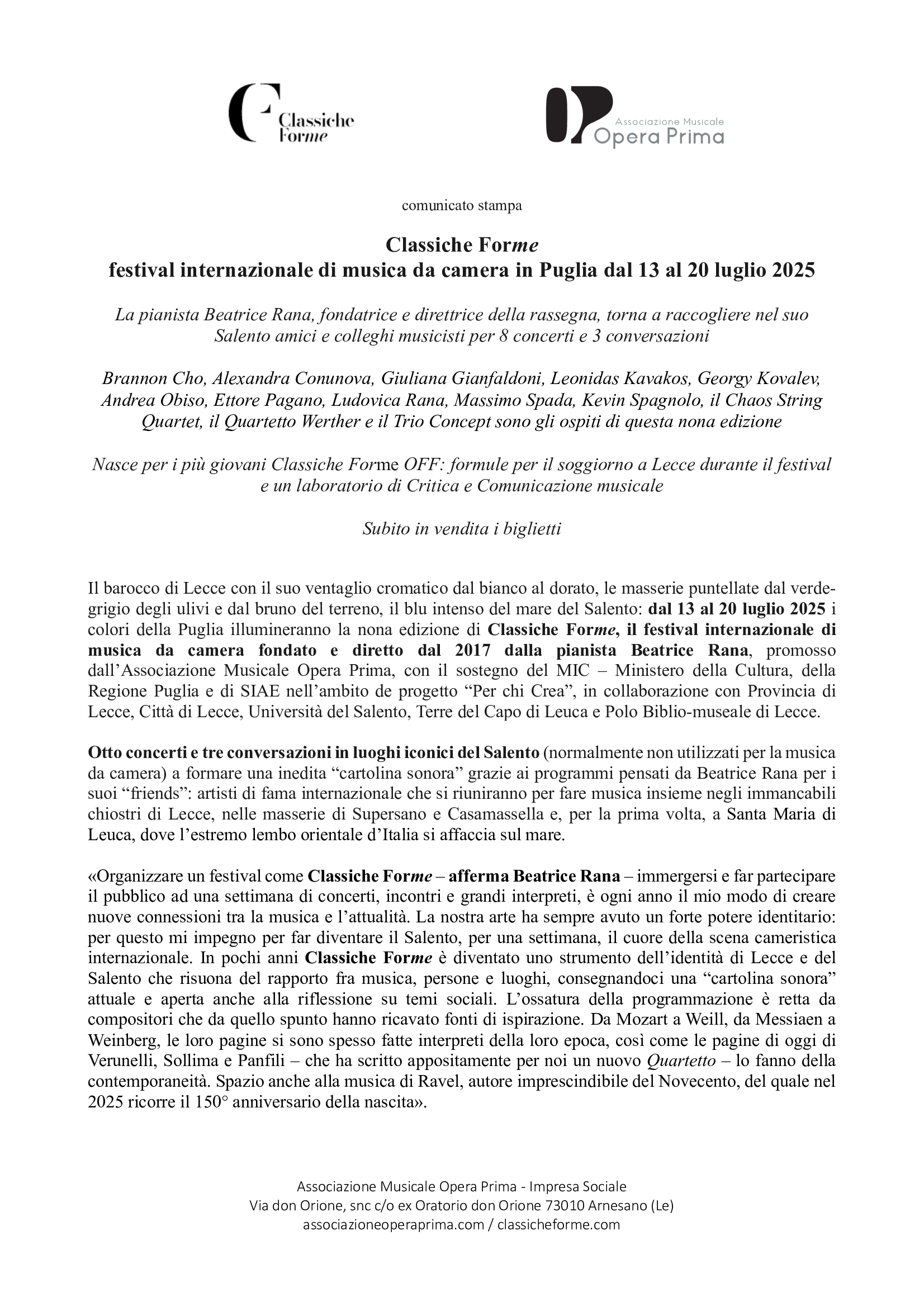 «Organizzare un festival come Classiche Forme – afferma Beatrice Rana – immergersi e far partecipare il pubblico ad una settimana di concerti, incontri e grandi interpreti, è ogni anno il mio modo di creare nuove connessioni tra la musica e l’attualità. La nostra arte ha sempre avuto un forte potere identitario: per questo mi impegno per far diventare il Salento, per una settimana, il cuore della scena cameristica internazionale. In pochi anni Classiche Forme è diventato uno strumento dell’identità di Lecce e del Salento che risuona del rapporto fra musica, persone e luoghi, consegnandoci una “cartolina sonora” attuale e aperta anche alla riflessione su temi sociali. L’ossatura della programmazione è retta da compositori che da quello spunto hanno ricavato fonti di ispirazione. Da Mozart a Weill, da Messiaen a Weinberg, le loro pagine si sono spesso fatte interpreti della loro epoca, così come le pagine di oggi di Verunelli, Sollima e Panfili – che ha scritto appositamente per noi un nuovo Quartetto – lo fanno della contemporaneità. Spazio anche alla musica di Ravel, autore imprescindibile del Novecento, del quale nel 2025 ricorre il 150° anniversario della nascita».