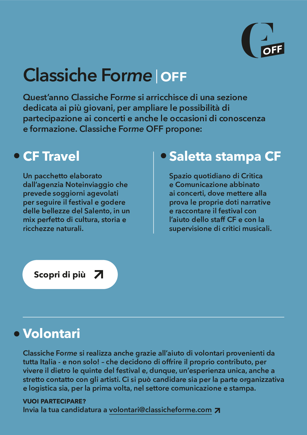 Coloro che invece desiderano seguire “dall’interno” il festival, possono presentare la propria candidatura per diventare volontario e seguire il dietro le quinte dell’edizione n. 9 di Classiche Forme, sia nella parte organizzativa e logistica sia, per la prima volta, nel settore comunicazione e stampa.