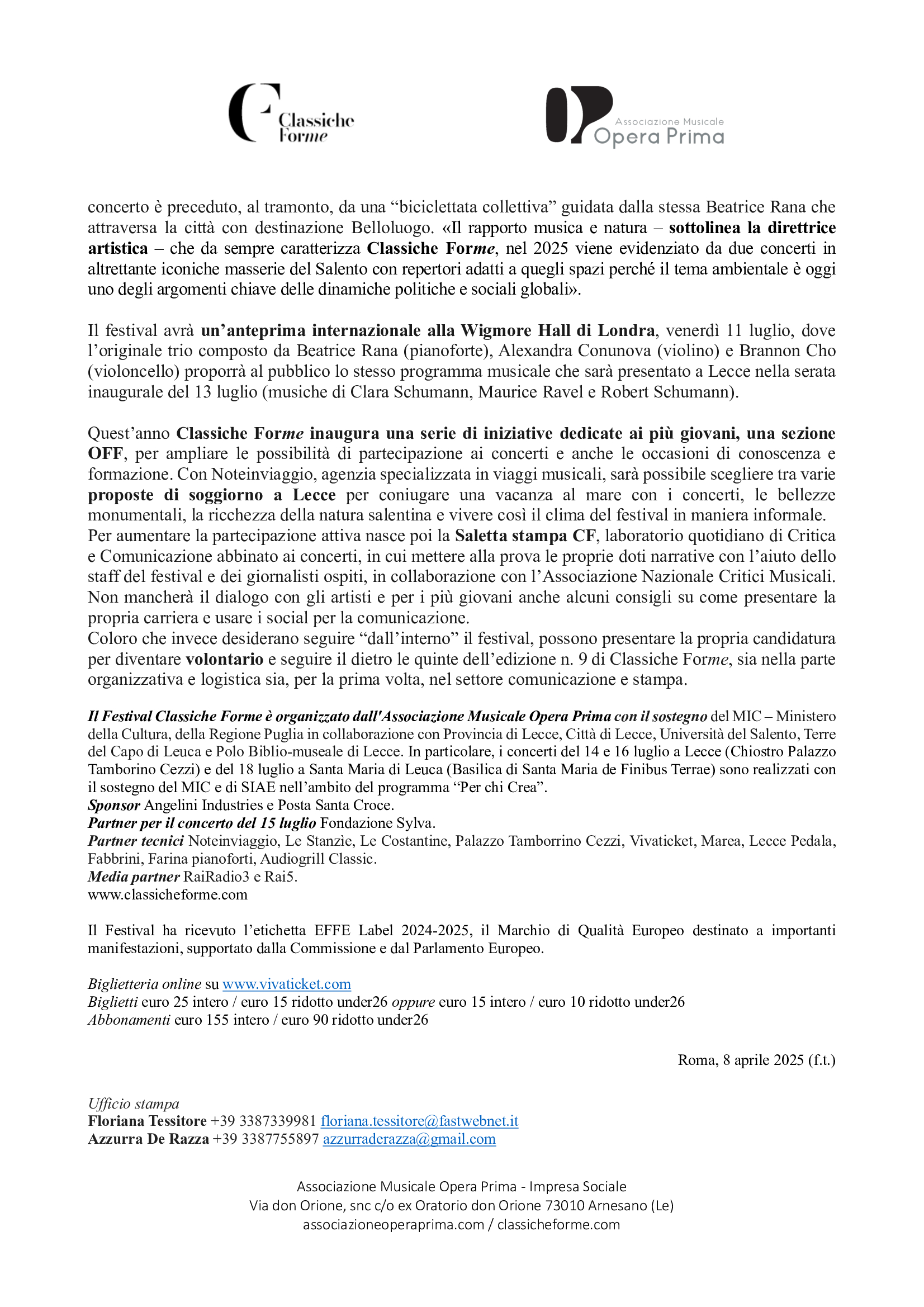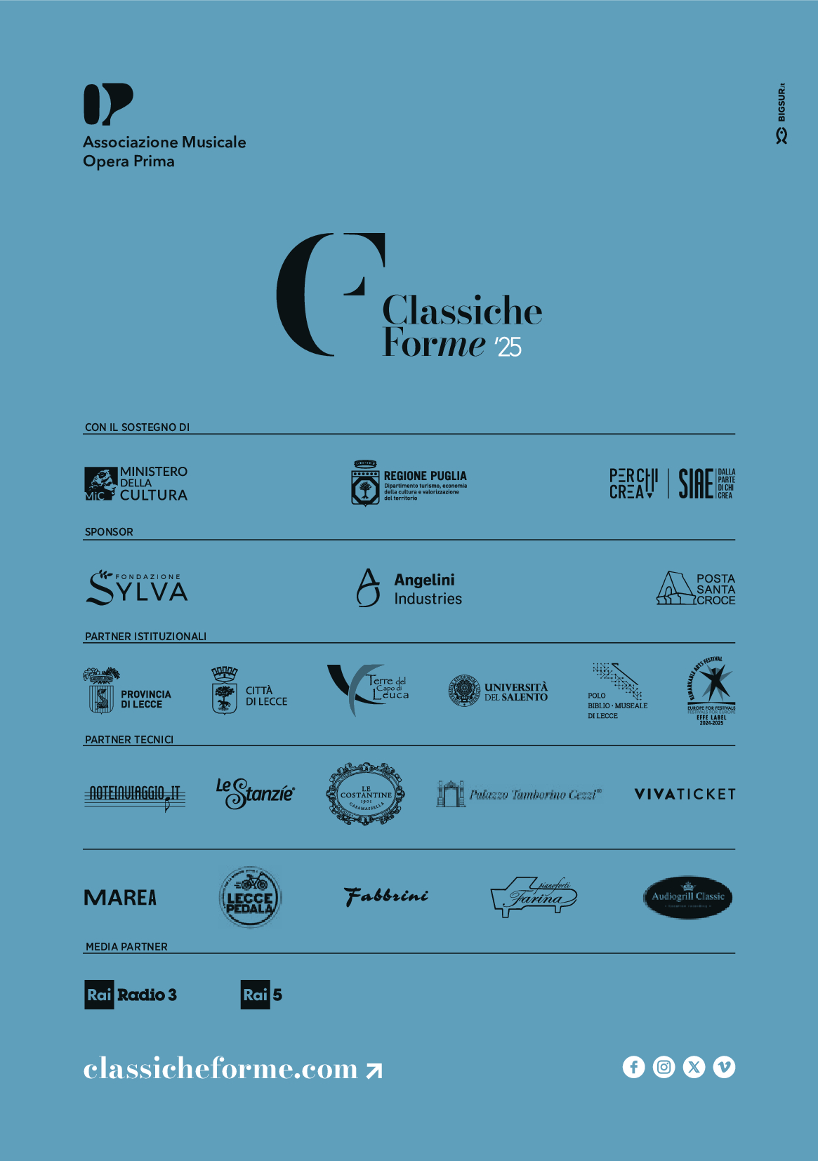 Il Festival Classiche Forme è organizzato dall’Associazione Musicale Opera Prima con il sostegno del MIC – Ministero della Cultura, della Regione Puglia in collaborazione con Provincia di Lecce, Città di Lecce, Università del Salento, Terre del Capo di Leuca e Polo Biblio-museale di Lecce. In particolare, i concerti del 14 e 16 luglio a Lecce (Chiostro Palazzo Tamborino Cezzi) e del 18 luglio a Santa Maria di Leuca (Basilica di Santa Maria de Finibus Terrae) sono realizzati con il sostegno del MIC e di SIAE nell’ambito del programma “Per chi Crea”.