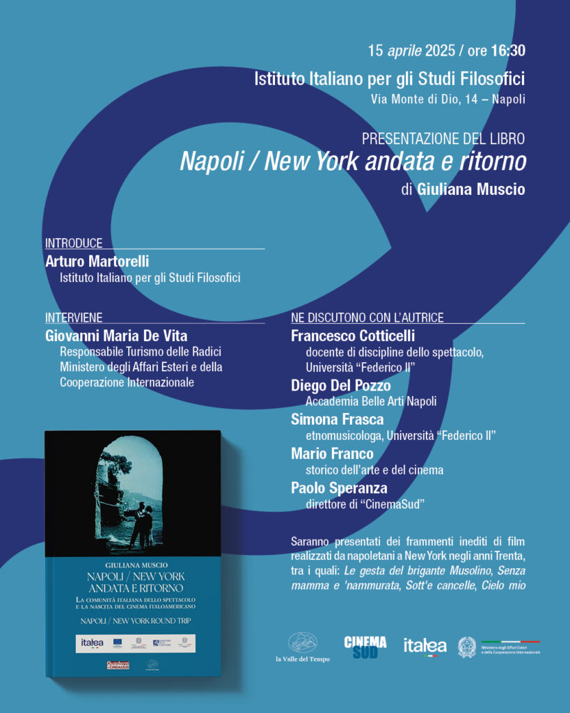 Napoli, 11 aprile 2025 – E’ in programma martedì 15 aprilealle ore 16.30 presso l’Istituto Italiano per gli Studi Filosofici di Napoli (via Monte di Dio, 14) la presentazione del libro “Napoli/New York andata e ritorno. La comunità italiana dello spettacolo e la nascita del cinema italoamericano” della professoressa Giuliana Muscio, docente presso l’Università di Padova. Al centro del dibattito il tentativo di far rientrare in Italia alcuni titoli “napoletani” realizzati a New York negli anni Trenta. Sarà l’occasione per parlare di cinema, emigrazione, talento italiano nel mondo e di turismo delle radici.