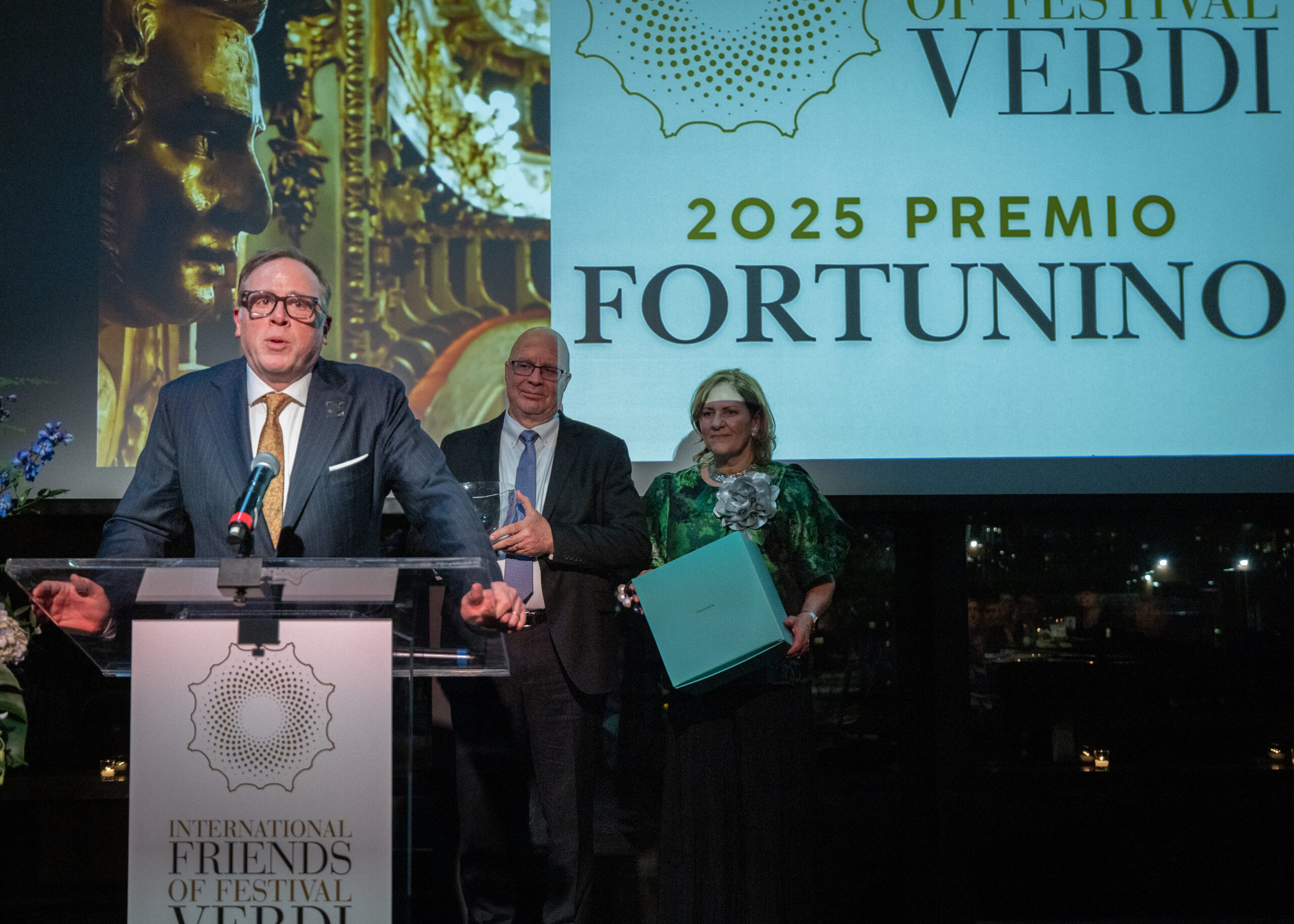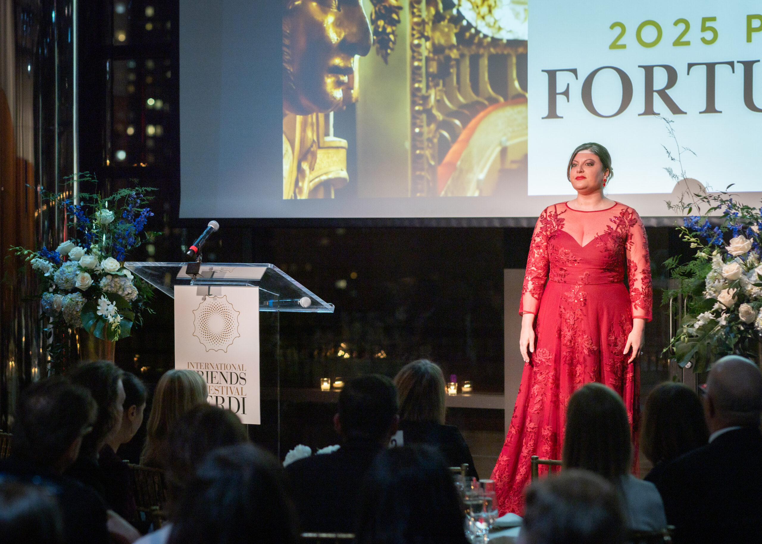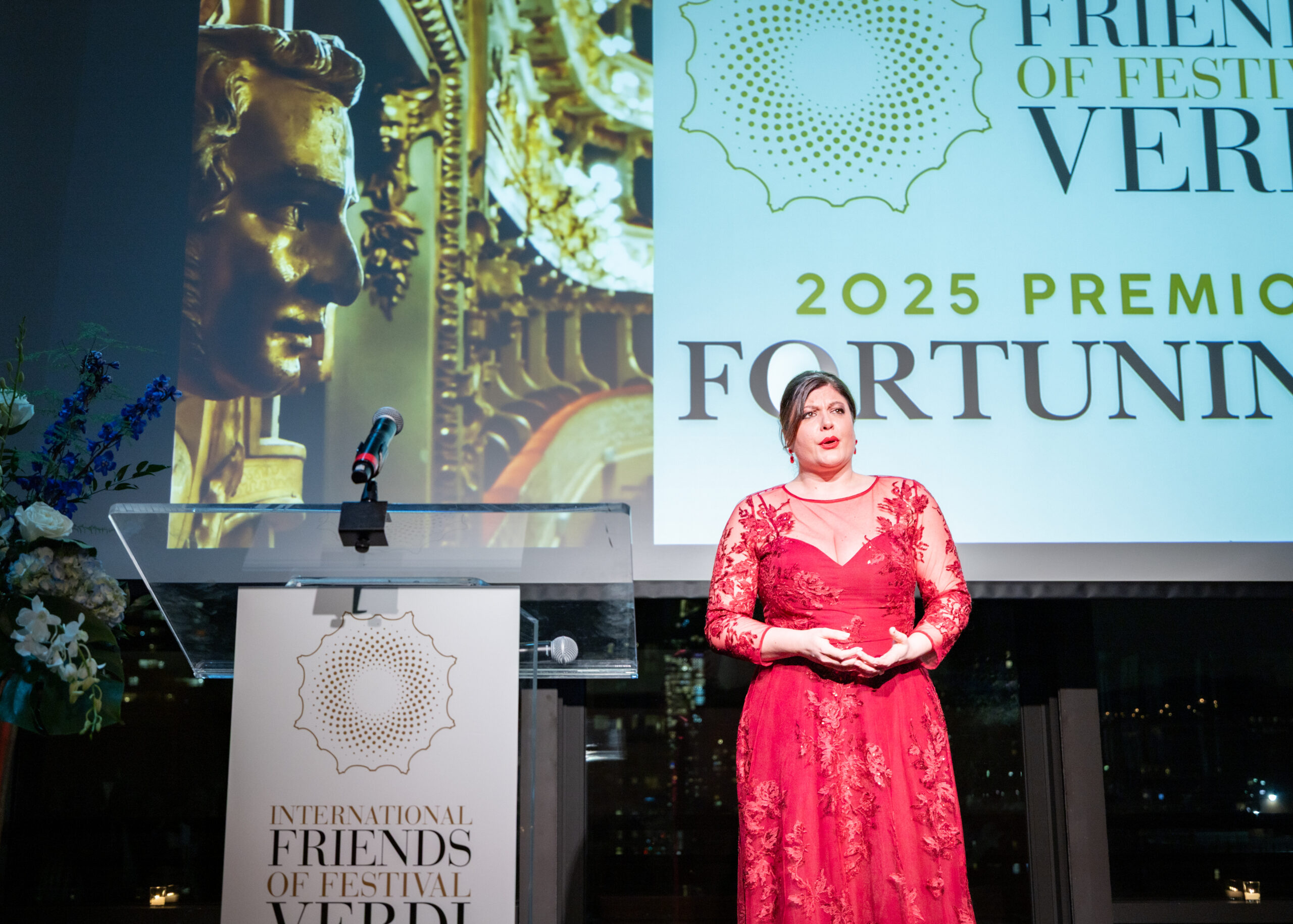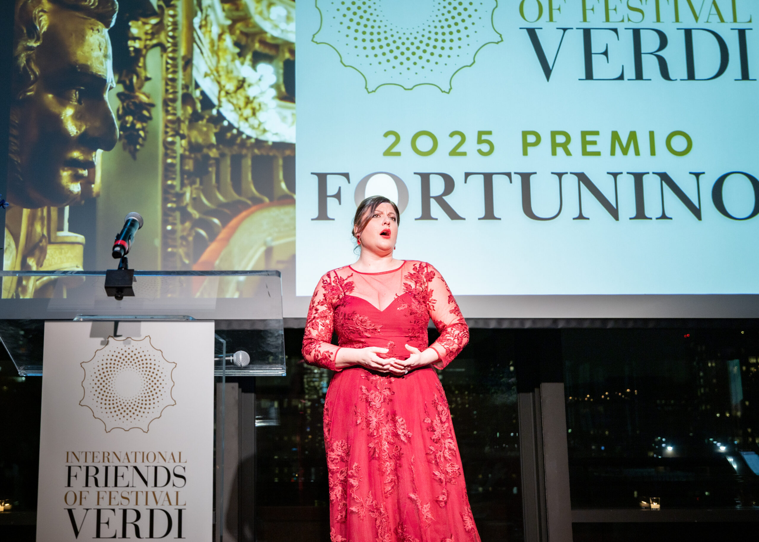 Nel corso della serata, Marta Torbidoni ha ricevuto il Fortunino Award, seconda edizione del premio che gli IFFV dedicano a giovani talenti protagonisti al Festival Verdi e che le è stato tributato in onore della sua interpretazione del ruolo di Odabella in Attila lo scorso anno. Nel recital tenuto dal soprano, accompagnato al pianoforte da Francesco Izzo, Marta Torbidoni si è esibita per la prima volta a New York interpretando arie verdiane da Attila, Otello e Nabucco.