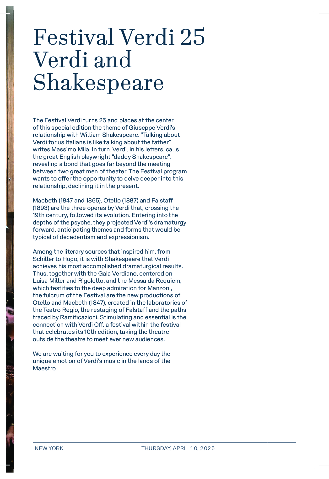 È grande l’attesa del pubblico, dei media e dei sostenitori statunitensi per l’International Friends of Festival Verdi Spring Gala dedicato al Maestro Giuseppe Verdi, a Parma e Busseto, e alle eccellenze del territorio, in programma a New York giovedì 10 aprile 2025. La serata è realizzatadal Teatro Regio di Parma insieme a ENIT, Regione Emilia-Romagna, APT Servizi Regione Emilia-Romagna, International Friends of Festival Verdi, Parma Creative City of Gastronomy, Parma Food Valley e Parma Quality Restaurants.
