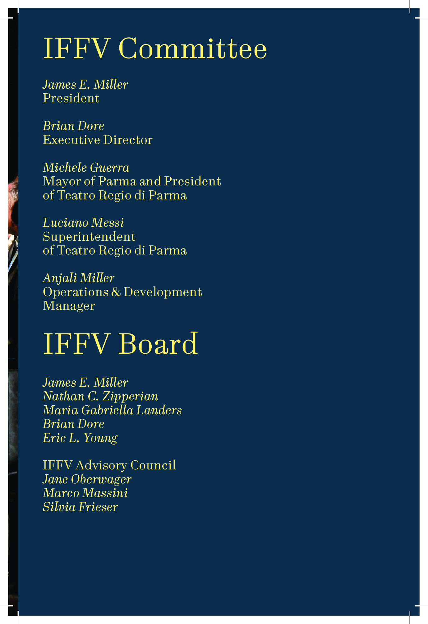 Al IFFV Spring Gala sono attesi, tra gli altri, James E. Miller, Presidente degli International Friends of Festival Verdi, Brian Dore, Direttore esecutivo IFFV