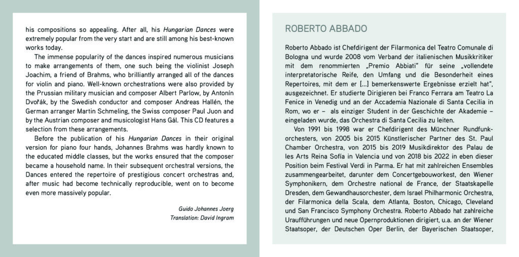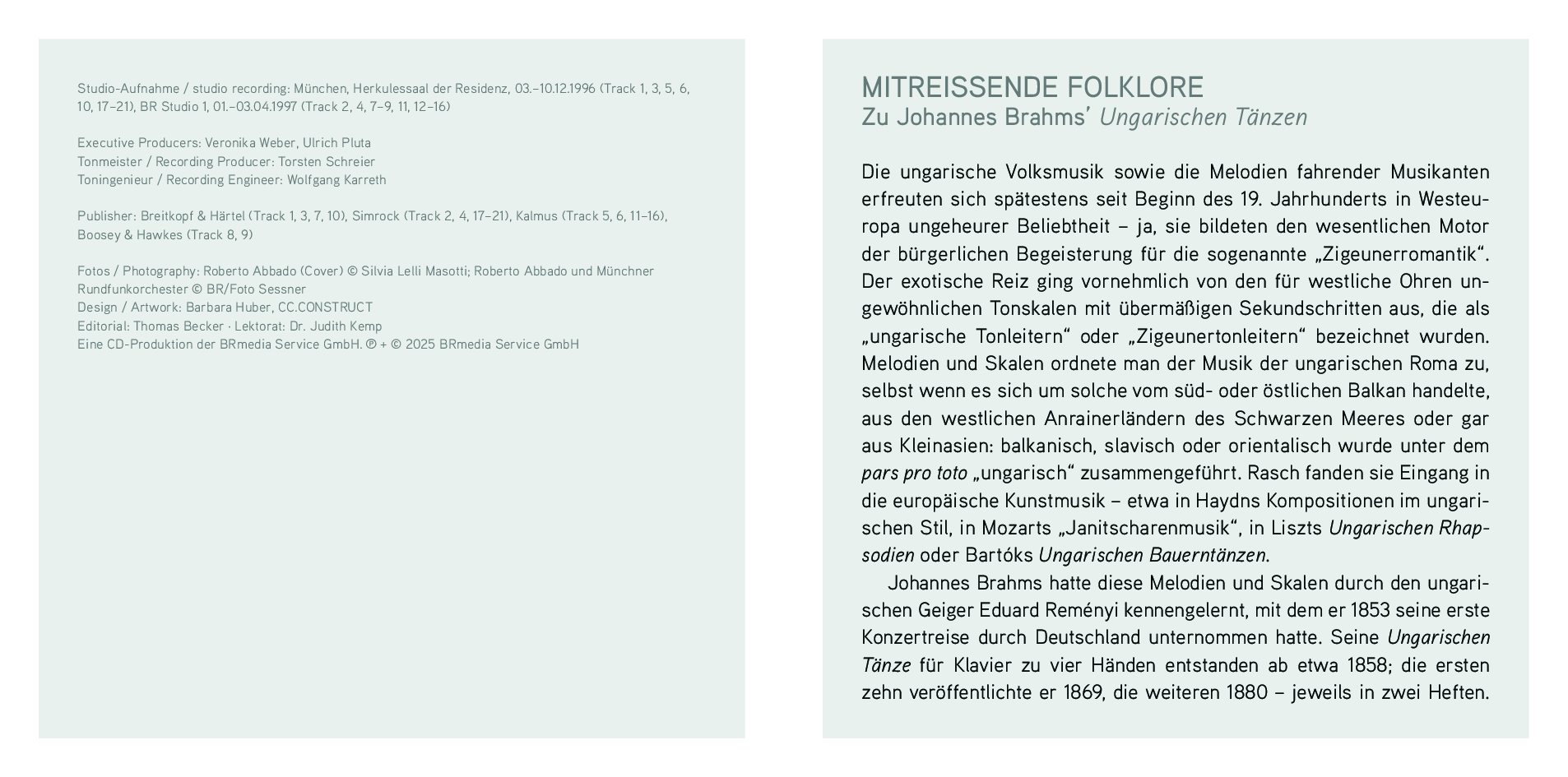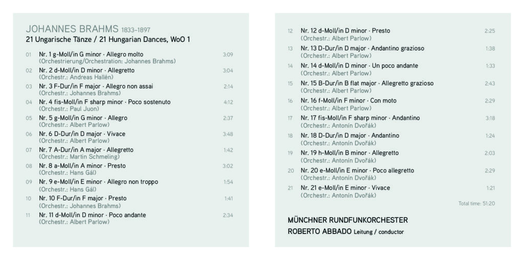 Il fascino delle melodie popolari che Johannes Brahms raccolse sotto il nome di Danze ungheresi è protagonista di un nuovo disco BR-KLASSIK: l’etichetta, a quasi trent’anni di distanza dall’incisione in studio avvenuta con la Münchner Rundfunkorchester nel 1996, pubblica le 21 Danze ungheresi di Brahms in versione orchestrale dirette da Roberto Abbado, allora direttore principale della compagine musicale tedesca. L’album è disponibile da oggi, 2 maggio, nei negozi e in formato digitale per lo streaming e download. Oltre agli originali arrangiamenti per orchestra scritti da Brahms per le sole danze n. 1, 3 e 10, il disco include orchestrazioni di Antonín Dvořák, Andreas Hallén, Paul Juon, Albert Parlow, Martin Schmeling e Hans Gál.