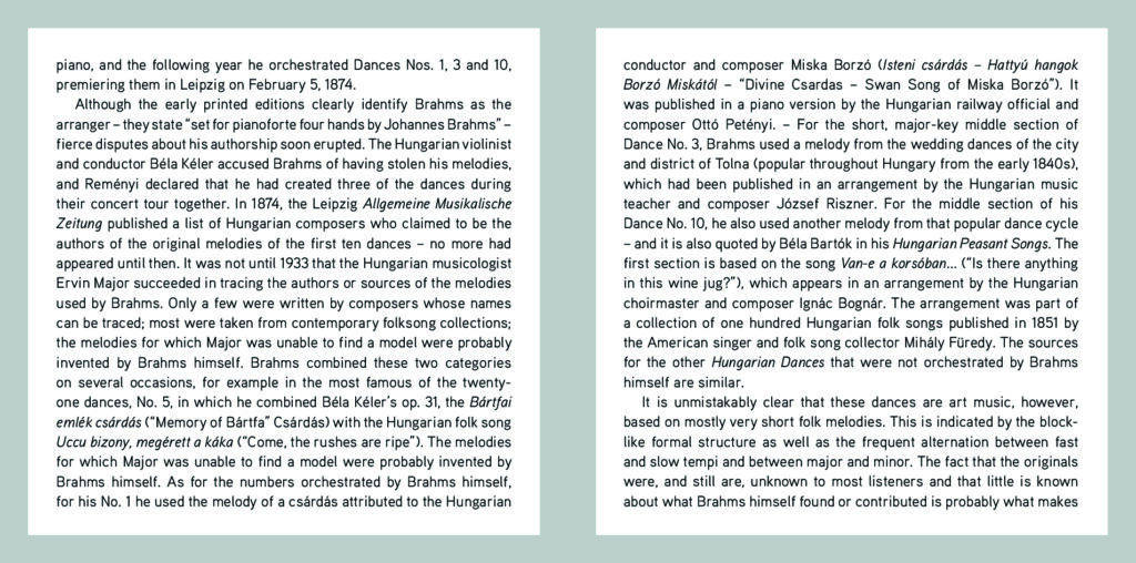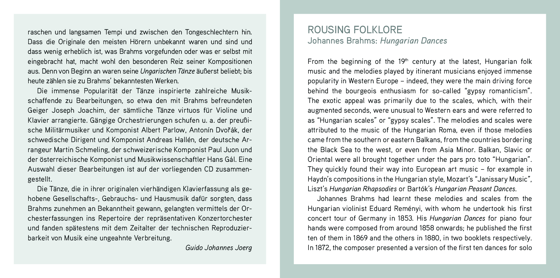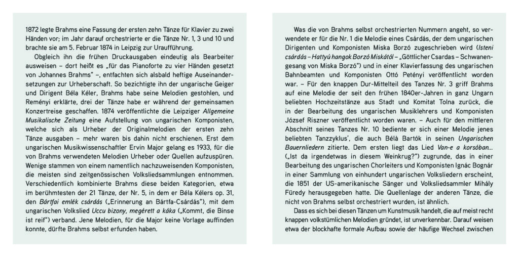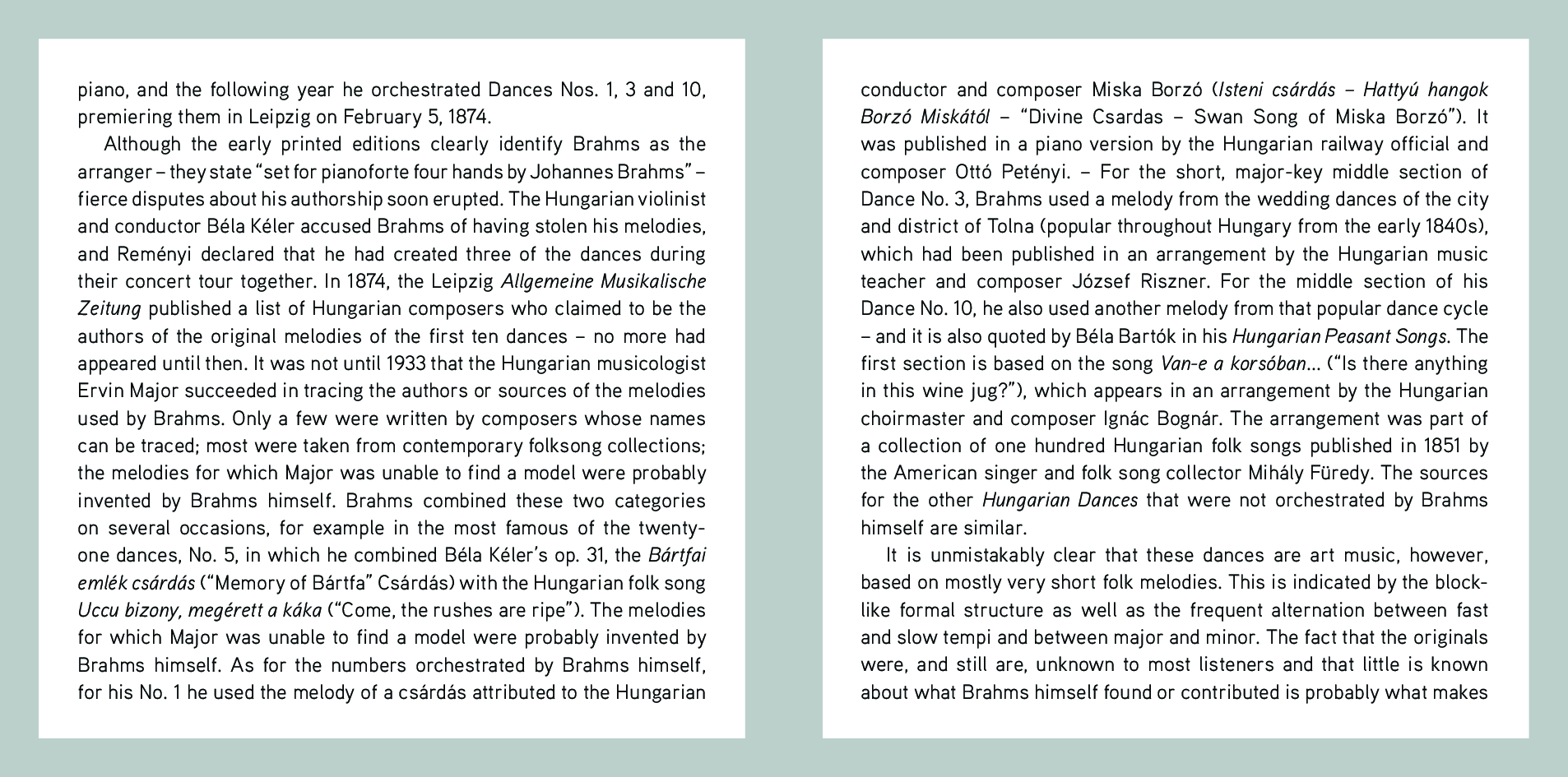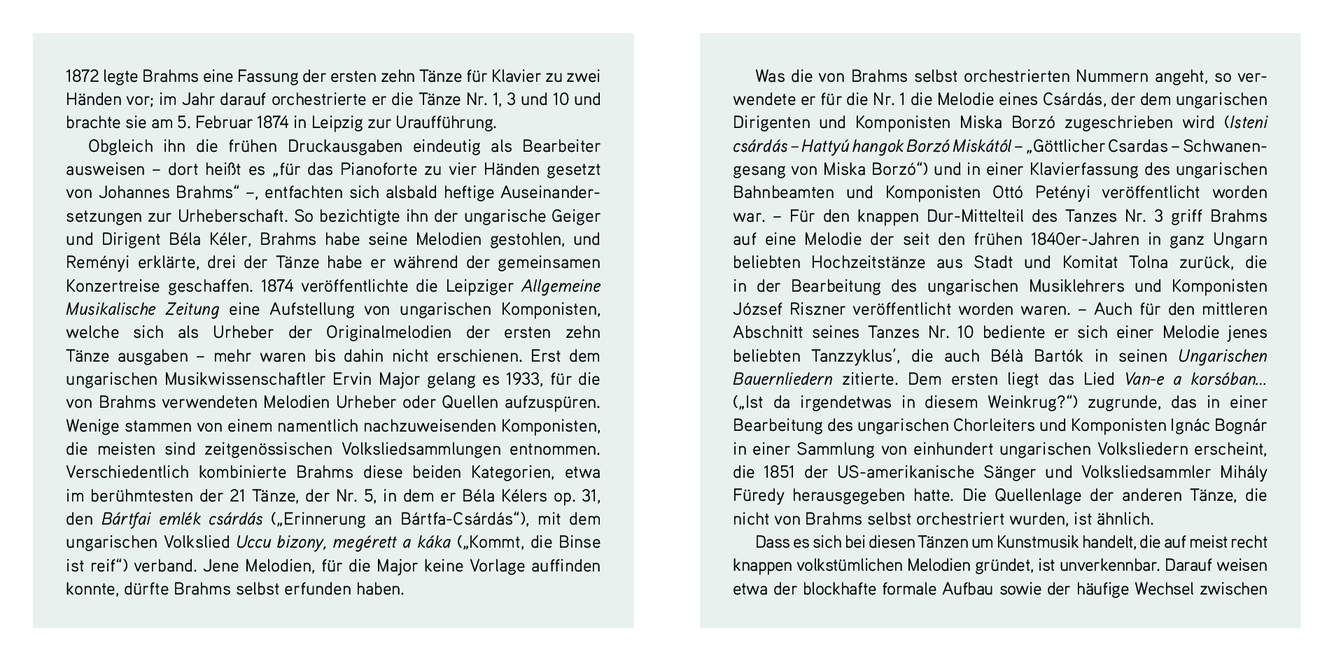 Combinando melodie di canti popolari ad alcune di propria invenzione, Brahms compose le Danze ungheresi inizialmente per pianoforte a quattro mani, dopo essere entrato in contatto con la tradizione musicale cosiddetta ‘ungherese’ o ‘zigana’ attraverso il violinista Eduard Reményi nel 1853. Le prime dieci danze furono pubblicate nel 1869, le altre nel 1880. Pochi anni dopo, Brahms presentò a Lipsia anche una versione orchestrale della n. 1, 3 e 10. Estremamente popolari fin dal loro debutto, le 21 Danze ungheresi contribuirono in modo determinante alla notorietà di Brahms, ispirando anche numerosi musicisti – come Dvořák, Hallén e Parlow – a realizzarne personali arrangiamenti.