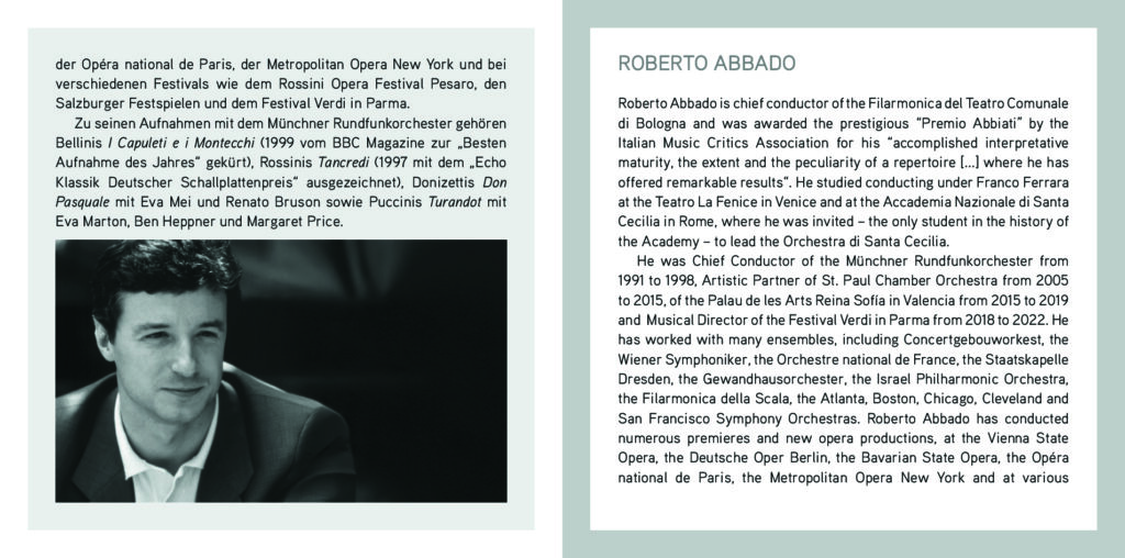 Recentemente nominato direttore musicale della Korean National Symphony Orchestra a partire da gennaio 2026, Roberto Abbado è oggi alla guida della Filarmonica del Teatro Comunale di Bologna. Dal 1991 al 1998, è stato direttore principale della Münchner Rundfunkorchester. Insignito di un Premio Abbiati, ha diretto numerose prime esecuzioni e nuove produzioni operistiche nei più prestigiosi teatri, tra cui il Teatro alla Scala, la Wiener Staatsoper, la Bayerische Staatsoper di Monaco di Baviera, l’Opéra National de Paris e il Metropolitan Opera di New York. Tra le sue registrazioni con la Rundfunkorchester di Monaco figurano I Capuleti e i Montecchi di Bellini, nominato Miglior Registrazione dell’Anno da BBC Magazine nel 1999, Tancredi di Rossini, premiato con l’Echo Klassik German Record Award nel 1997, Don Pasquale di Donizetti e Turandot di Puccini.