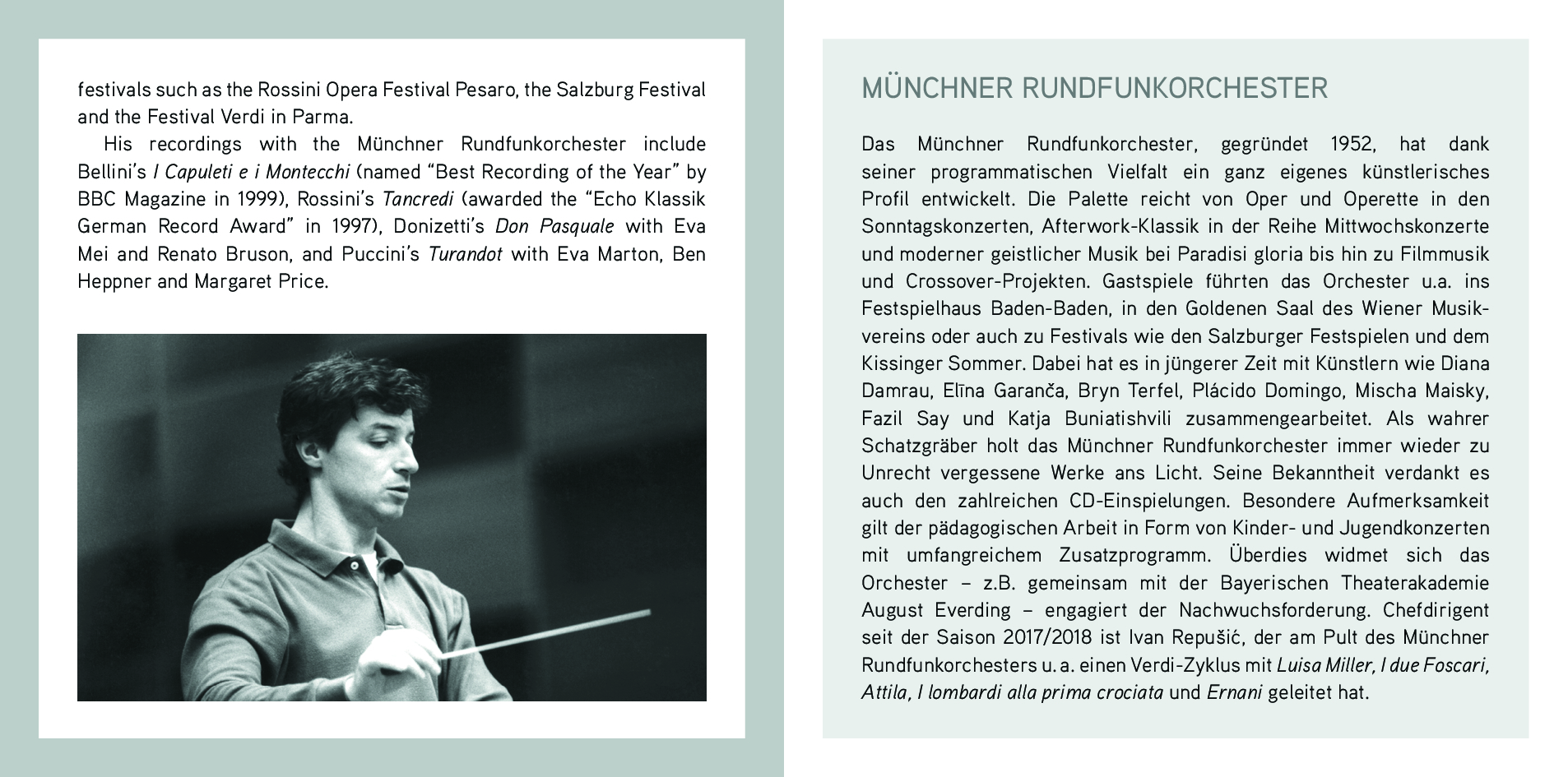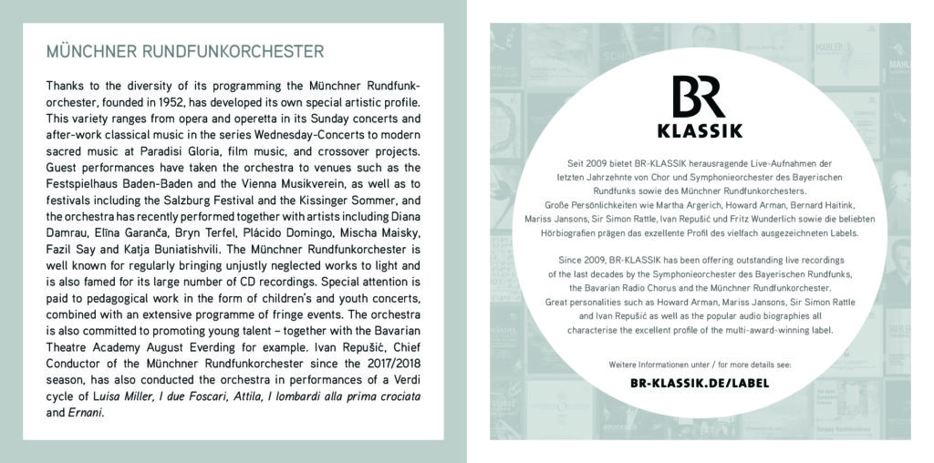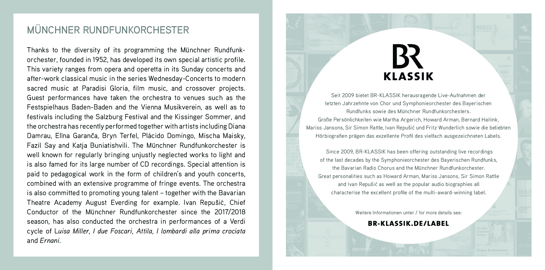 Fondata nel 1952, la Münchner Rundfunkorchester si impegna nel riportare alla luce opere dimenticate e vanta un’ampia produzione discografica. Con un repertorio che spazia dall’opera all’operetta, dalla musica classica a quella sacra contemporanea, passando per la musica da film, l’orchestra si è esibita in sedi prestigiose come il Festspielhaus di Baden-Baden, il Musikverein di Vienna e il Festival di Salisburgo. Recentemente, ha inoltre collaborato con artisti quali Diana Damrau, Elīna Garanča, Plácido Domingo, Mischa Maisky e Khatia Buniatishvili. Direttore principale dal 2017 è Ivan Repušić.