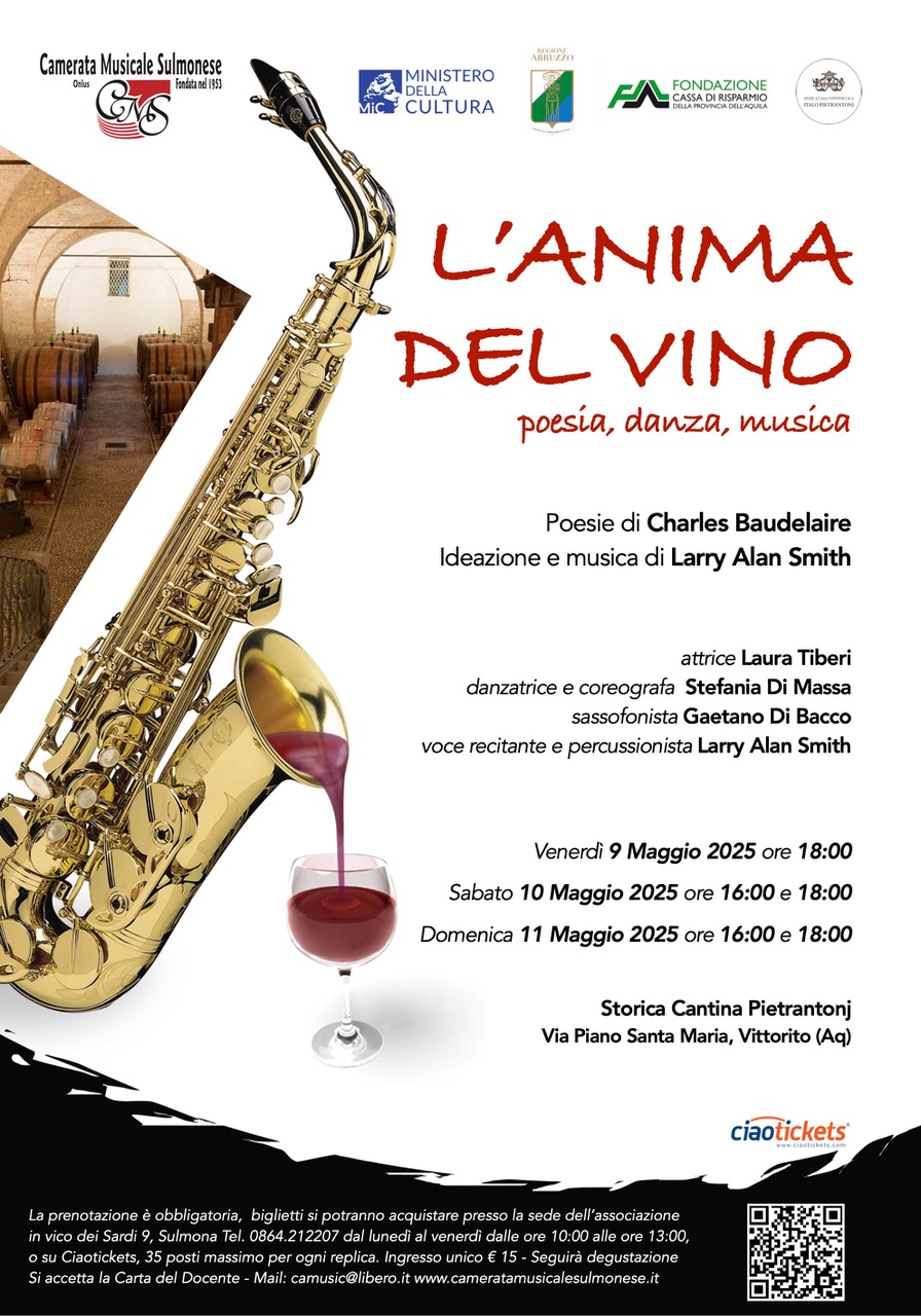 Musica elettronica, improvvisazioni dal vivo di sax e percussioni che si accompagnano al testi di Baudelaire con interpretazioni anche coreografiche e un pizzico di intelligenza artificiale, sabato 10 e domenica 11, con anteprima venerdì 9 maggio alle ore 18.00, a Vittorito (AQ), in via Piano S.Maria, debutta lo spettacolo ”L’anima del Vino”: appuntamento con poesia, musica e danza proposto dalla Camerata Musicale Sulmonese con il patrocinio del Ministero della Cultura, della Regione Abruzzo e della Fondazione CARISPAQ e con la collaborazione della Storica Cantina Pietrantonj dove sarà ospitato l’evento.