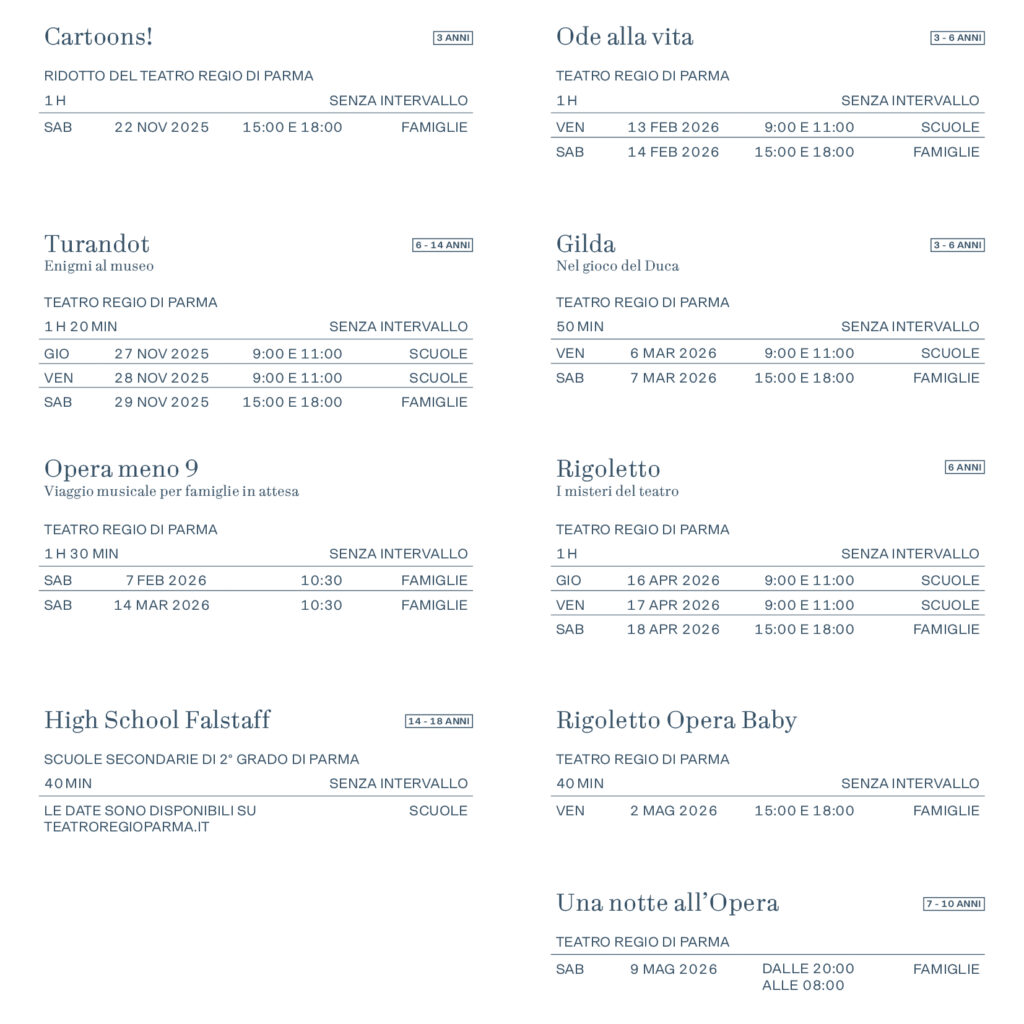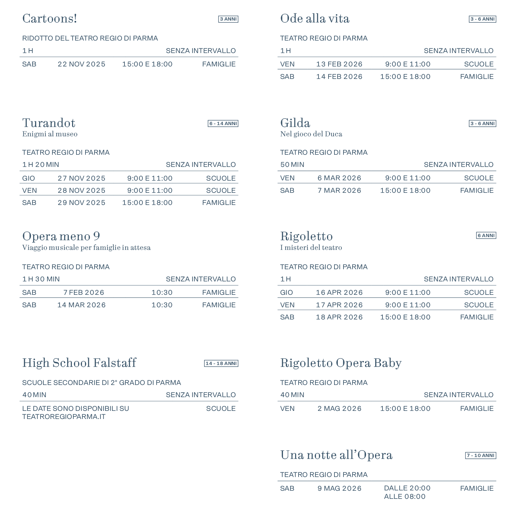 I biglietti di Regio Young per gli spettacoli per le scuole potranno essere prenotati a partire dal 27 ottobre 2025 all’indirizzo educational@teatroregioparma.it