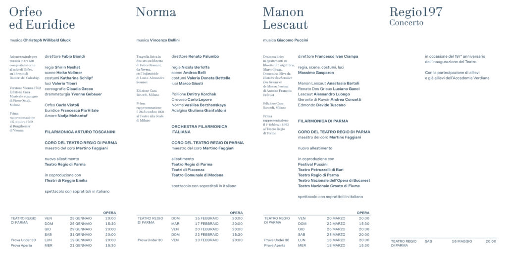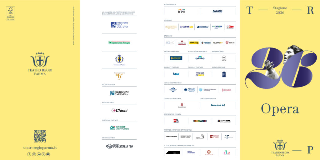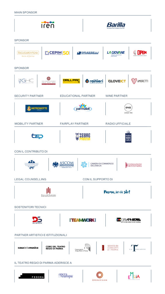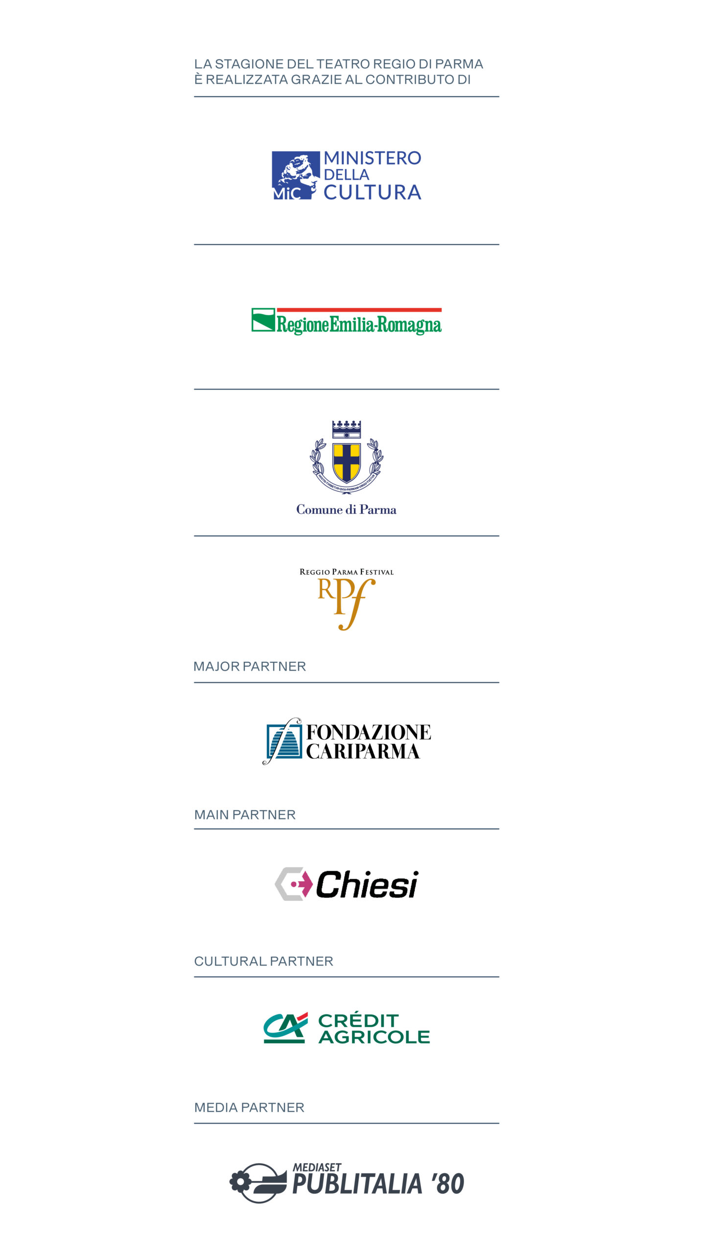 La Stagione del Teatro Regio di Parma è realizzata grazie al contributo di Ministero della Cultura, Regione Emilia-Romagna, Comune di Parma, Reggio Parma Festival. Major partner Fondazione Cariparma. Main partner Chiesi. Cultural partner Crédit Agricole. Media partner Mediaset Publitalia ’80. Main sponsor Iren, Barilla. Sponsor Agugiaro e Figna, CePIM, Grasselli, La Giovane, Opem, GHC, Poliambulatorio Dalla Rosa Prati, Drill Pac, Rainieri, GloveICT, Amoretti. Security partner Metronotte. Educational partner Parmalat. Wine partner Oinoe. Mobility partner Tep. Fair Play partner Zebre.Radio Ufficiale Radio Monte Carlo. Con il contributo di Ascom Confcommercio Parma Fondazione, Ascom Parma Confcommercio, Camera di Commercio dell’Emilia, Fondazione Monteparma. Legal counselling Villa&Partners. Con il supporto di “Parma, io ci sto!”. Sostenitori tecnici De Simoni, Teamwork, Graphital. Partner artistici e istituzionali Casa della Musica, Coro del Teatro Regio di Parma, Conservatorio “Arrigo Boito”, Società dei Concerti di Parma, La Toscanini. Il Teatro Regio di Parma aderisce a Fedora, Opera Europa, Operavision, Emilia taste, nature, culture.