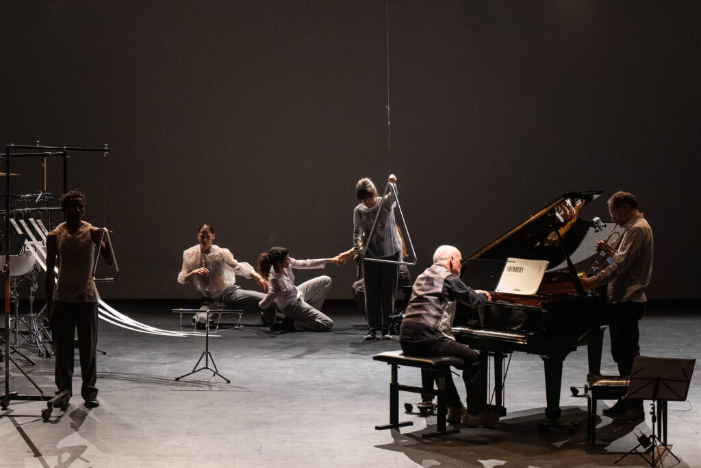 Eine musikalische Collage in einer Choreografie von Rafaële Giovanola in Zusammenarbeit mit den Tänzerinnen und Tänzern von CocoonDance: Martina De Dominicis, Léonce Noah Konan, Colas Lucot, Bojana Mitrovic, Nora Monsecour und Musikern des Ensemble Modern am Sonntag, 18.02.2024 im Frankfurt LAB in Frankfurt am Main im Rahmen der „cresc… Biennale für aktuelle Musik Frankfurt Rhein Main“. Vom Ensemble Modern tanzen Megumi Kasakawa und Matthias Rieke/ Lichtdesign, Norbert Ommer/ Sounddesign, Rainald Endraß/ Dramaturgie, Fa-Hsan Chan/ Kostüme und Alvaro Esteban/ Outside Eye