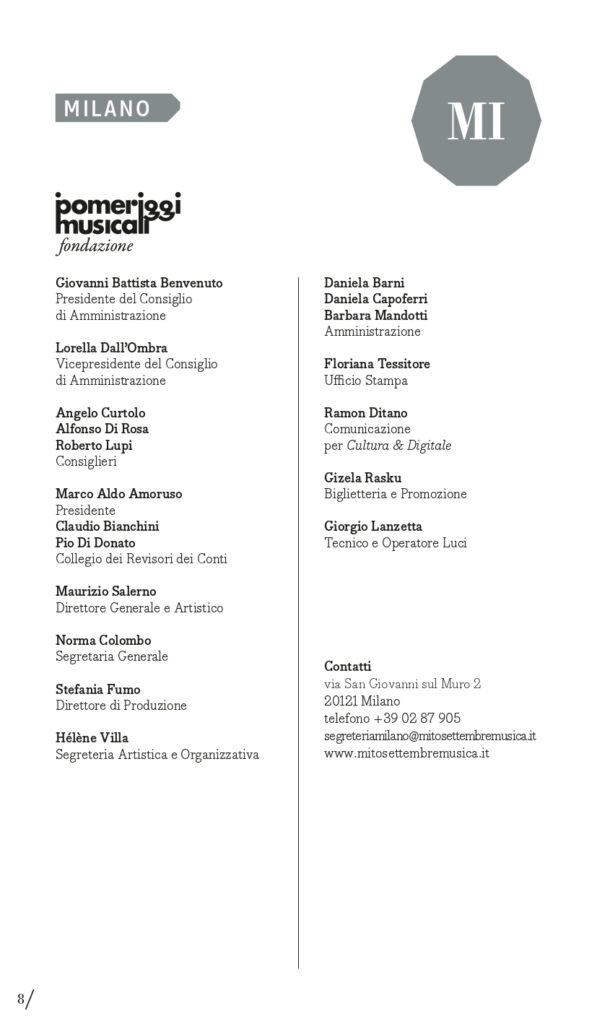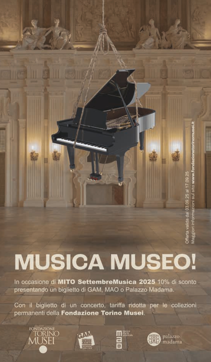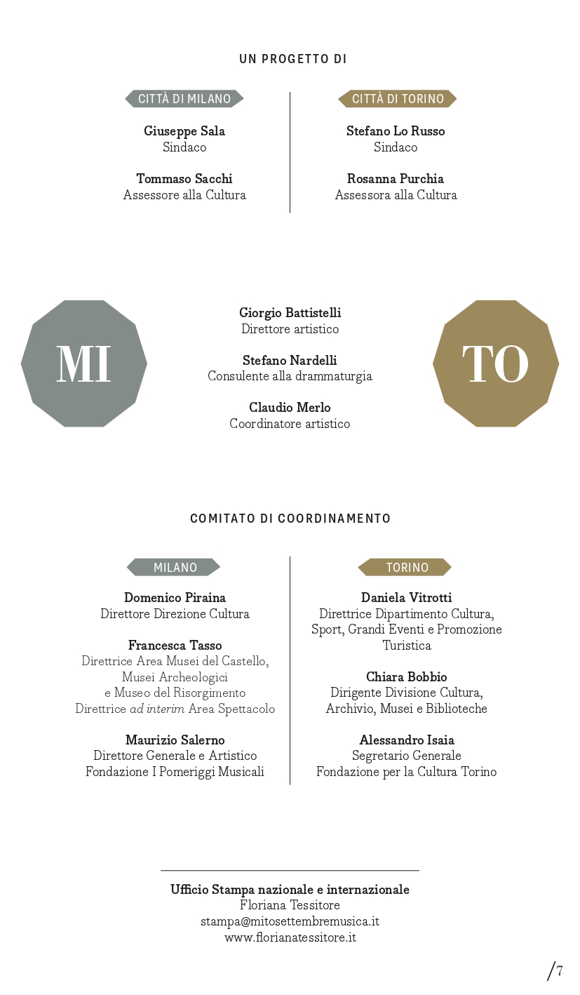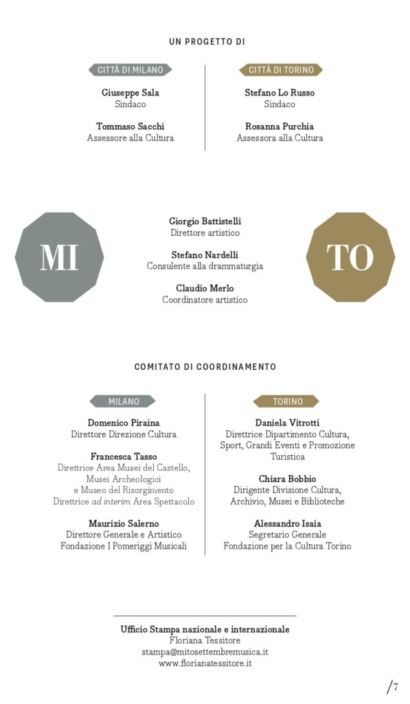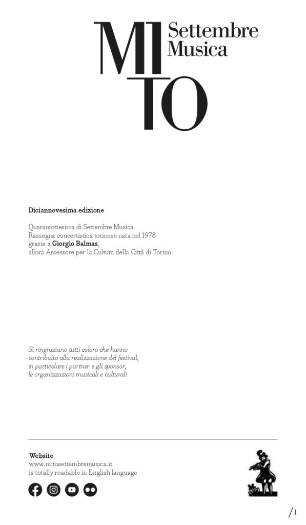 MITO SettembreMusica è un progetto delle Città di Torino e Milano, con il contributo del Ministero della Cultura, realizzato dalla Fondazione per la Cultura Torino e dalla Fondazione I Pomeriggi Musicali, con il sostegno sin dalla prima edizione del Partner Intesa Sanpaolo, della Fondazione Compagnia di San Paolo e della Fondazione CRT, degli sponsor Iren, Pirelli, Fondazione Fiera Milano, Altec, e del Charity Partner Fondazione Piemontese per la Ricerca sul Cancro.