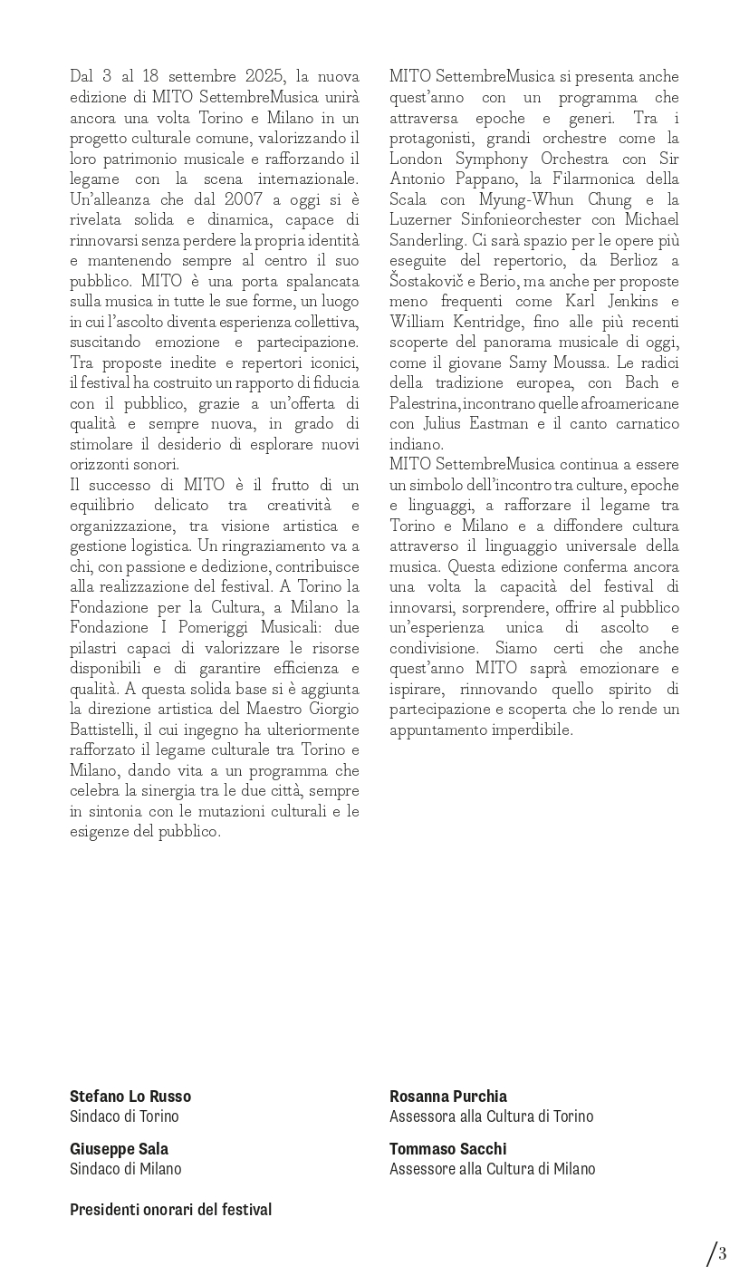 «Dal 3 al 18 settembre, la nuova edizione di MITO SettembreMusica unirà ancora una volta Torino e Milano in un progetto culturale comune, valorizzando il loro patrimonio musicale e rafforzando il legame con la scena internazionale – dicono i Sindaci della Città di Torino e Milano e presidenti onorari del festival Stefano Lo Russo e Giuseppe Sala – Anno dopo anno, il Festival continua a essere un simbolo dell’incontro tra culture, epoche e linguaggi, a rafforzare il legame tra le nostre due città e a diffondere cultura attraverso il linguaggio universale della musica. Siamo certi che anche questa edizione saprà emozionare e ispirare, rinnovando quello spirito di partecipazione e scoperta che rende MITO SettembreMusica un appuntamento imperdibile».