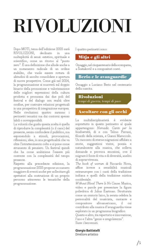 «Il tema 2025 “Rivoluzioni” – spiega il direttore artistico Giorgio Battistelli – sarà declinato in una molteplicità di sensi: estetico, spirituale e scientifico. È una definizione che allude anche a un mutamento radicale di un ordine stabilito, che vuole essere rottura di abitudini di ascolto consolidate e apertura di nuove prospettive. Come già nel 2024, la programmazione si muoverà sul doppio binario della promozione e valorizzazione delle migliori espressioni della cultura prodotta e promossa dai due poli del festival e del dialogo con realtà oltre confine, per costruire relazioni progettuali in una prospettiva di integrazione europea. La volontà che guida questa scelta è quella di riprodurre la complessità (o il caos) del presente, senza confondere il pubblico, ma esponendolo a stimoli, provocazioni, riflessioni, idee, in una progettualità che va oltre l’intrattenimento colto e si pone come strumento di pensiero. Un festival quindi che ha come ambizione l’essere più coerente con la complessità del tempo presente».