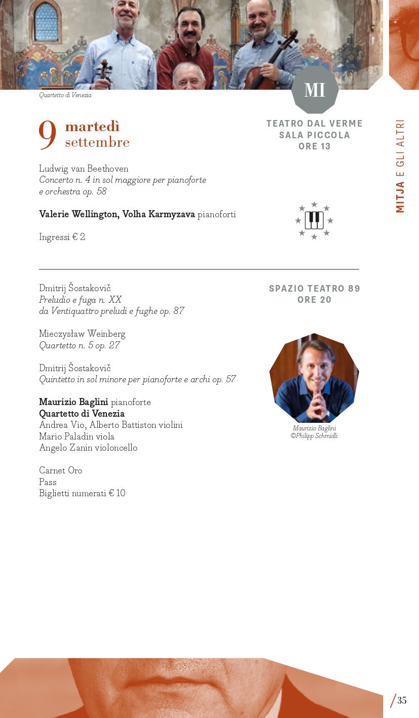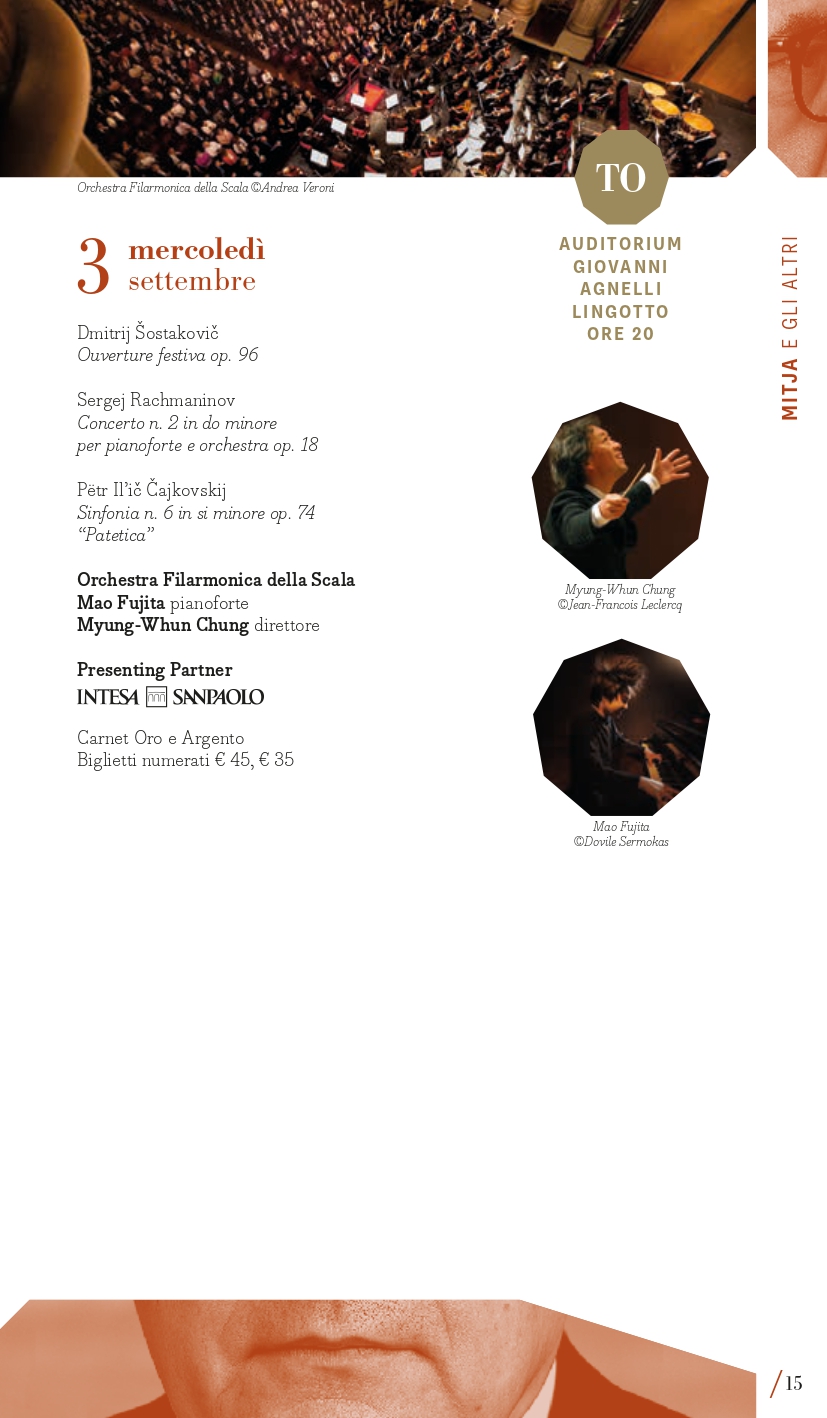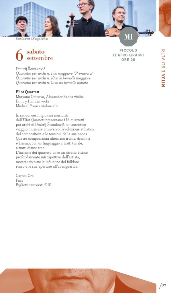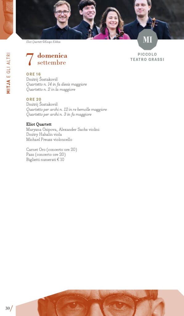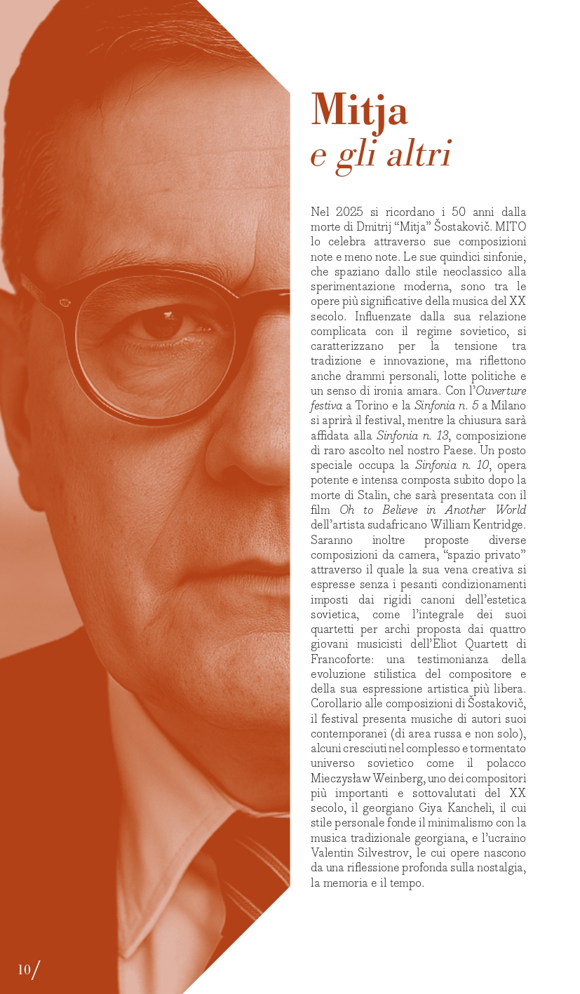 Inaugurazione a Torino (Auditorium Giovanni Agnelli del Lingotto) mercoledì 3 settembre con la Filarmonica della Scala diretta da Myung-Whun Chung e un programma che colloca l’appuntamento nel primo perimetro, “Mitja e gli altri” per ricordare i 50 anni dalla morte di Dmitrij “Mitja” Šostakovič, del quale si eseguirà in apertura l’Ouverture festiva op. 96, seguita dal Secondo Concerto per pianoforte di Rachmaninov con il pianista Mao Fujita e la “Patetica” di Čajkovskij. Il giorno successivo, giovedì 4 settembre, a Milano al Teatro alla Scala, Sir Antonio Pappano dirigerà invece la London Symphony Orchestra nel Secondo Concerto di Prokof’ev con la star sud-coreana Seong-Jin Cho, (in locandina anche la Suite da Candide di Bernstein e la Terza Sinfonia di Copland). Entrambe le serate d’apertura si realizzano grazie al Presenting Partner Intesa Sanpaolo, che collabora anche per gli ormai tradizionali concerti al Santuario di San Giuseppe a Milano (giovedì 11 settembre, con il celebre fisarmonicista Samuele Telari che eseguirà le Variazioni Goldberg di Johann Sebastian Bach) e all’Auditorium del grattacielo Intesa Sanpaolo di Torino (lunedì 15 settembre, Eliot Quartett impegnato nell’integrale dei Quartetti di Šostakovič). La London Symphony Orchestra con il suo direttore principale saranno poi anche a Torino (Auditorium Giovanni Agnelli del Lingotto) venerdì 5 settembre con un programma differente che comprende la Sinfonia n. 9 di Šostakovič, il Secondo Concerto di Chopin con Seong-Jin Cho, già vincitore del Concorso Chopin, il poema sinfonico Juventus di Victor de Sabata e l’ouverture dalla Semiramide di Rossini. L’omaggio a Šostakovič segna anche l’ultimo concerto a Torino mercoledì 17 settembre con la Sinfonia n. 13 affidata ai complessi del Teatro Regio diretti da Enrico Calesso (Auditorium Giovanni Agnelli del Lingotto). Un posto speciale occupa poi la Sinfonia n. 10, una delle sue opere più potenti e intense, composta subito dopo la morte di Stalin, che sarà eseguita mercoledì 10 settembre a Milano (Teatro Dal Verme) dalla Luzerner Sinfonieorchester guidata da Michael Sanderling con la proiezione del film Oh to Believe in Another World dell’artista sudafricano William Kentridge. Verranno quindi proposte diverse composizioni da camera di Šostakovič, considerate come “spazio privato” attraverso il quale la sua vena creativa si espresse senza i pesanti condizionamenti imposti dai rigidi canoni dell’estetica del regime sovietico. I quattro giovani musicisti dell’Eliot Quartett di Francoforte saranno così impegnati, tra le due città, nell’integrale dei suoi 15 quartetti per archi (6, 7, 13, 14, 15 settembre). Il pianista Maurizio Baglini e il Quartetto di Venezia saranno impegnati in altre pagine cameristiche di “Mitja” martedì 9 settembre a Milano (Spazio Teatro 89) così come a Torino domenica 14 settembre (Conservatorio Verdi) l’Ars Trio con i percussionisti dell’Ars Ludi. Corollario alle composizioni di Dmitrij Šostakovič, il festival presenta una serie di concerti dedicati a musiche di suoi contemporanei di area sovietica e non solo, come il polacco Mieczysław Weinberg, uno dei compositori più sottovalutati del XX secolo, il georgiano Giya Kancheli, il cui stile personale fonde il minimalismo con la musica tradizionale, oppure l’ucraino Valentin Silvestrov, le cui opere nascono da una riflessione profonda sulla nostalgia, la memoria e il tempo, riuniti in un concerto a Torino (Teatro Vittoria) venerdì 12 e a Milano sabato 13 settembre (Teatro Dal Verme) con Manuel Zurria (flauti) e Oscar Pizzo (pianoforte).