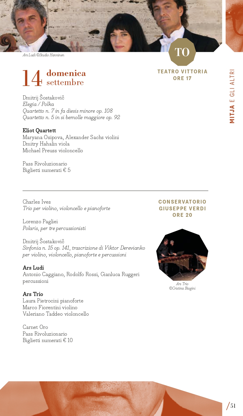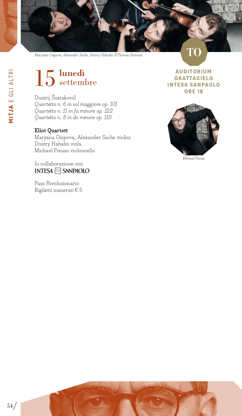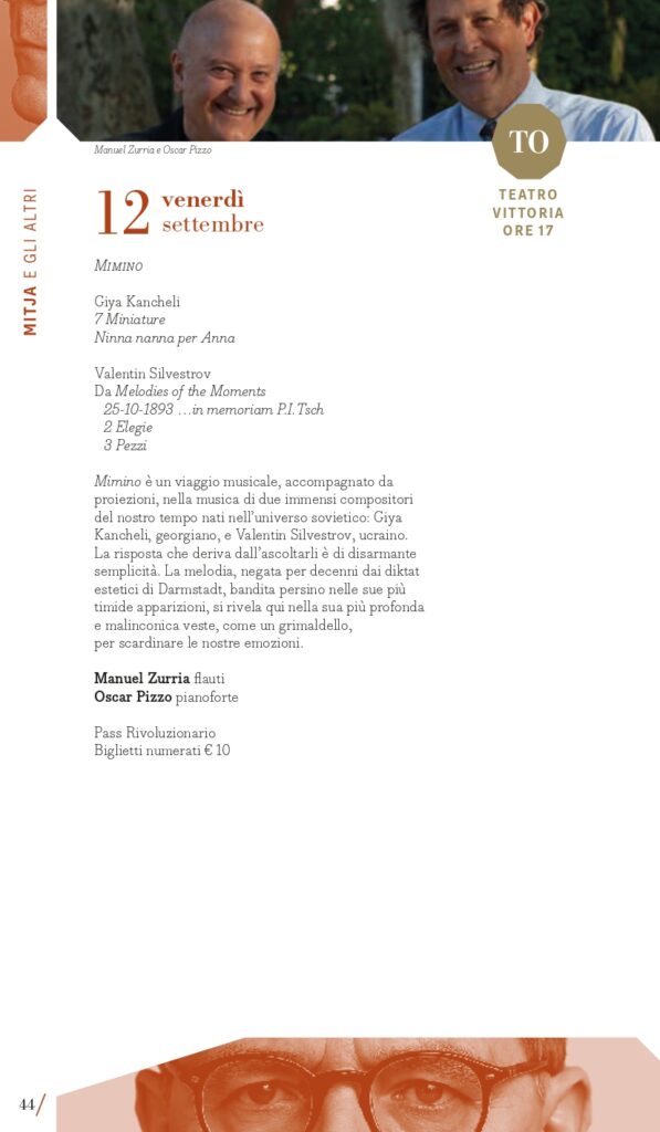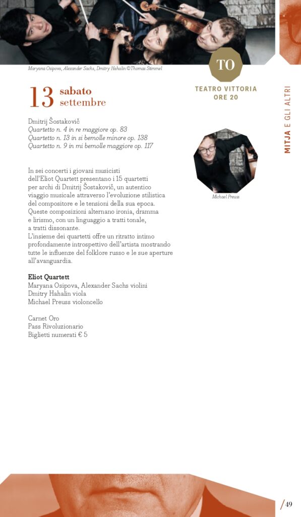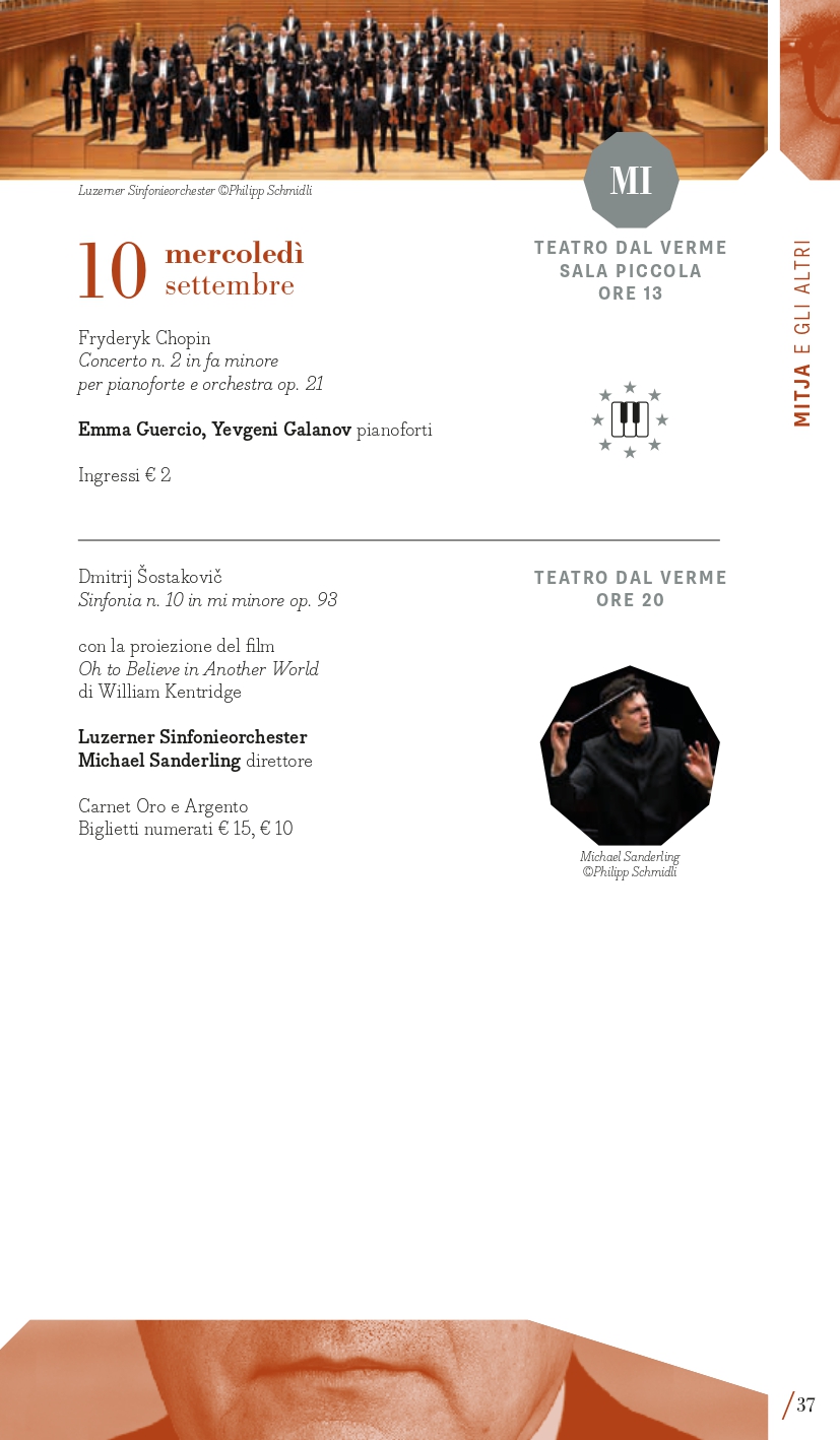 Inaugurazione a Torino (Auditorium Giovanni Agnelli del Lingotto) mercoledì 3 settembre con la Filarmonica della Scala diretta da Myung-Whun Chung e un programma che colloca l’appuntamento nel primo perimetro, “Mitja e gli altri” per ricordare i 50 anni dalla morte di Dmitrij “Mitja” Šostakovič, del quale si eseguirà in apertura l’Ouverture festiva op. 96, seguita dal Secondo Concerto per pianoforte di Rachmaninov con il pianista Mao Fujita e la “Patetica” di Čajkovskij. Il giorno successivo, giovedì 4 settembre, a Milano al Teatro alla Scala, Sir Antonio Pappano dirigerà invece la London Symphony Orchestra nel Secondo Concerto di Prokof’ev con la star sud-coreana Seong-Jin Cho, (in locandina anche la Suite da Candide di Bernstein e la Terza Sinfonia di Copland). Entrambe le serate d’apertura si realizzano grazie al Presenting Partner Intesa Sanpaolo, che collabora anche per gli ormai tradizionali concerti al Santuario di San Giuseppe a Milano (giovedì 11 settembre, con il celebre fisarmonicista Samuele Telari che eseguirà le Variazioni Goldberg di Johann Sebastian Bach) e all’Auditorium del grattacielo Intesa Sanpaolo di Torino (lunedì 15 settembre, Eliot Quartett impegnato nell’integrale dei Quartetti di Šostakovič). La London Symphony Orchestra con il suo direttore principale saranno poi anche a Torino (Auditorium Giovanni Agnelli del Lingotto) venerdì 5 settembre con un programma differente che comprende la Sinfonia n. 9 di Šostakovič, il Secondo Concerto di Chopin con Seong-Jin Cho, già vincitore del Concorso Chopin, il poema sinfonico Juventus di Victor de Sabata e l’ouverture dalla Semiramide di Rossini. L’omaggio a Šostakovič segna anche l’ultimo concerto a Torino mercoledì 17 settembre con la Sinfonia n. 13 affidata ai complessi del Teatro Regio diretti da Enrico Calesso (Auditorium Giovanni Agnelli del Lingotto). Un posto speciale occupa poi la Sinfonia n. 10, una delle sue opere più potenti e intense, composta subito dopo la morte di Stalin, che sarà eseguita mercoledì 10 settembre a Milano (Teatro Dal Verme) dalla Luzerner Sinfonieorchester guidata da Michael Sanderling con la proiezione del film Oh to Believe in Another World dell’artista sudafricano William Kentridge. Verranno quindi proposte diverse composizioni da camera di Šostakovič, considerate come “spazio privato” attraverso il quale la sua vena creativa si espresse senza i pesanti condizionamenti imposti dai rigidi canoni dell’estetica del regime sovietico. I quattro giovani musicisti dell’Eliot Quartett di Francoforte saranno così impegnati, tra le due città, nell’integrale dei suoi 15 quartetti per archi (6, 7, 13, 14, 15 settembre). Il pianista Maurizio Baglini e il Quartetto di Venezia saranno impegnati in altre pagine cameristiche di “Mitja” martedì 9 settembre a Milano (Spazio Teatro 89) così come a Torino domenica 14 settembre (Conservatorio Verdi) l’Ars Trio con i percussionisti dell’Ars Ludi. Corollario alle composizioni di Dmitrij Šostakovič, il festival presenta una serie di concerti dedicati a musiche di suoi contemporanei di area sovietica e non solo, come il polacco Mieczysław Weinberg, uno dei compositori più sottovalutati del XX secolo, il georgiano Giya Kancheli, il cui stile personale fonde il minimalismo con la musica tradizionale, oppure l’ucraino Valentin Silvestrov, le cui opere nascono da una riflessione profonda sulla nostalgia, la memoria e il tempo, riuniti in un concerto a Torino (Teatro Vittoria) venerdì 12 e a Milano sabato 13 settembre (Teatro Dal Verme) con Manuel Zurria (flauti) e Oscar Pizzo (pianoforte).