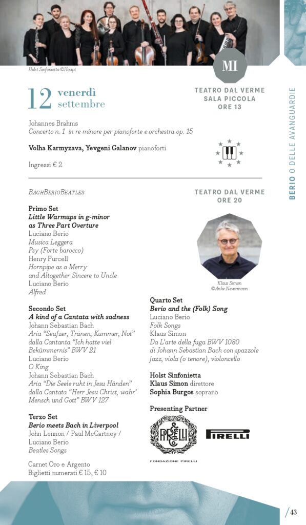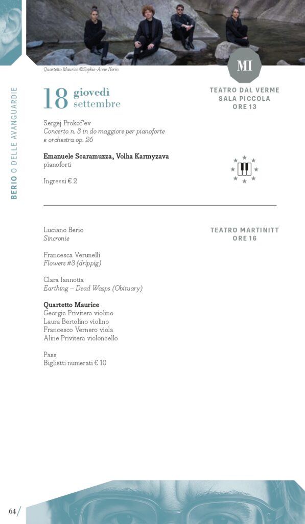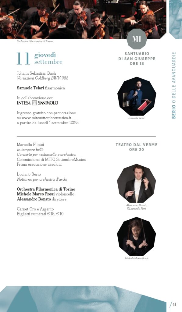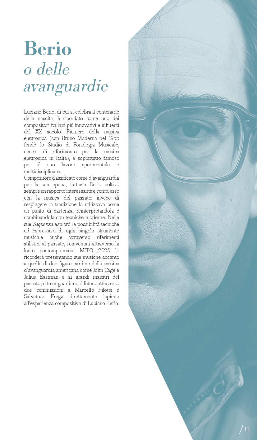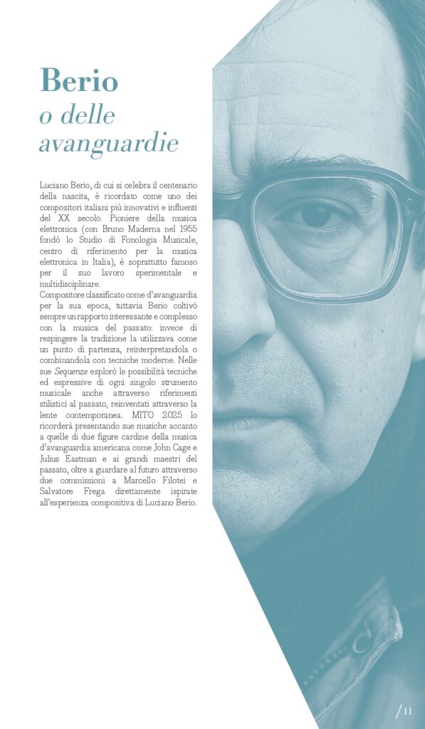 A Luciano Berio, nel centenario della nascita, è dedicato il secondo perimetro tematico del Festival: “Berio e le avanguardie”. Classificato come d’avanguardia per la sua epoca, il compositore ligure coltivò sempre un rapporto dialettico con la musica del passato che spesso usava come un punto di partenza per le sue composizioni. È il caso delle sue Sequenze con cui esplorare le possibilità tecniche ed espressive di molti strumenti, anche attraverso riferimenti stilistici al passato, reinventati attraverso la sua lente contemporanea: a Milano lunedì 15 settembre e a Torino martedì 16 settembre si potranno ascoltare ad esempio la VIII per violino e la IV per pianoforte con i vincitori del Premio Mormone. A Milano ci saranno due proposte di accostamento di pagine di Berio con altre di Bach: il pianista Davide Cabassi, nella Sala della Balla del Museo degli strumenti musicali del Castello Sforzesco di Milano, giovedì 11 settembre, eseguirà la Petite Suite e Wasserklavier con alcuni Preludi e fughe dal Clavicembalo ben temperato; invece venerdì 12 settembre (Teatro Dal Verme) la Holst Sinfonietta diretta da Klaus Simon con il soprano Sophia Burgos presenteranno il programma intitolato BachBerioBeatles, un concerto di cui Pirelli e Fondazione Pirelli sono Presenting Partner. In dialogo con il proprio tempo, Luciano Berio intrattenne un rapporto ricco e complesso con le avanguardie musicali, e in quest’ottica MITO 2025 lo ricorda anche con concerti che presenteranno sue musiche accanto a quelle di due figure cardine della musica d’avanguardia americana come John Cage (Sonate e Interludi a Milano martedì 16 settembre con la pianista Costanza Principe) e Julius Eastman, al quale è dedicato Without Blood There Is No Cause – The body of Julius Eastman, spettacolo di musica, video e parole firmato dal regista Fabio Cherstich con la drammaturgia musicale di Oscar Pizzo, i video di Francesco Sileo (inserito nel perimetro “Ascoltare con gli occhi”); si tratta di un oratorio laico che comprende Turtle Dreams di Meredith Monk, prima opera a cui Eastman partecipò come vocalist, e presenta un collage di composizioni e immagini che esplorano i temi cari all’autore: la condizione delle minoranze nere e queer nell’America conservatrice, il canto popolare afroamericano come risposta alla musica colta bianca, l’improvvisazione come strumento di liberazione e catarsi (a Torino, alle Officine Caos, martedì 16 settembre e a Milano, Teatro Out Off, mercoledì 17 settembre). È dedicato a pagine per voce e pianoforte di Hans Werner Henze il concerto del tenore Marcello Nardis con il pianista Diego Mingolla domenica 7 settembre al Teatro Vittoria di Torino dove, mercoledì 17 settembre, il Quartetto Maurice con la regia del suono di Carlo Laurenzi propongono Sincronie di Berio con due pagine di Clara Iannotta e Jonathan Harvey. Due le nuove commissioni del festival, di Marcello Filotei In tempore belli per violoncello e orchestra affidata a Marco Rossi con Alessandro Bonato sul podio della Filarmonica di Torino (Milano, Teatro Dal Verme, giovedì 11 settembre) e di Salvatore Frega GNOSIS per violino e orchestra (Torino, Conservatorio Verdi, giovedì 11 settembre) con I Pomeriggi Musicali diretti da Alessandro Cadario, direttamente ispirate all’esperienza compositiva di Berio.