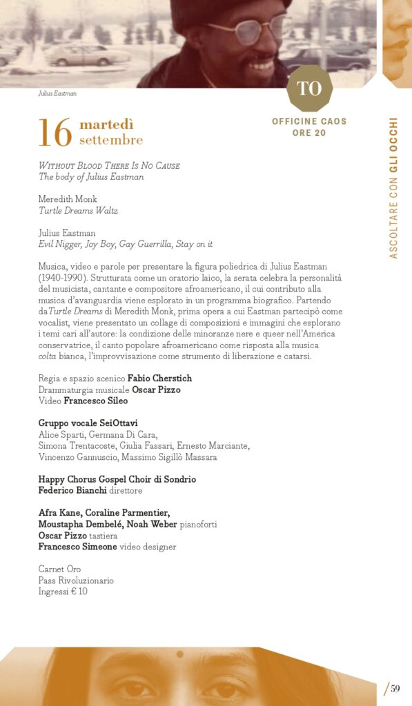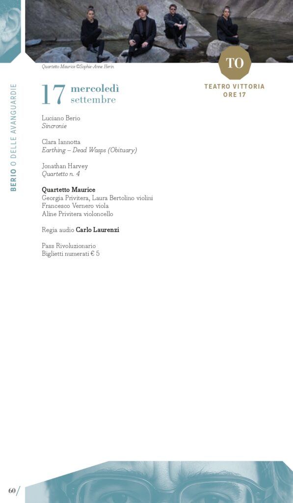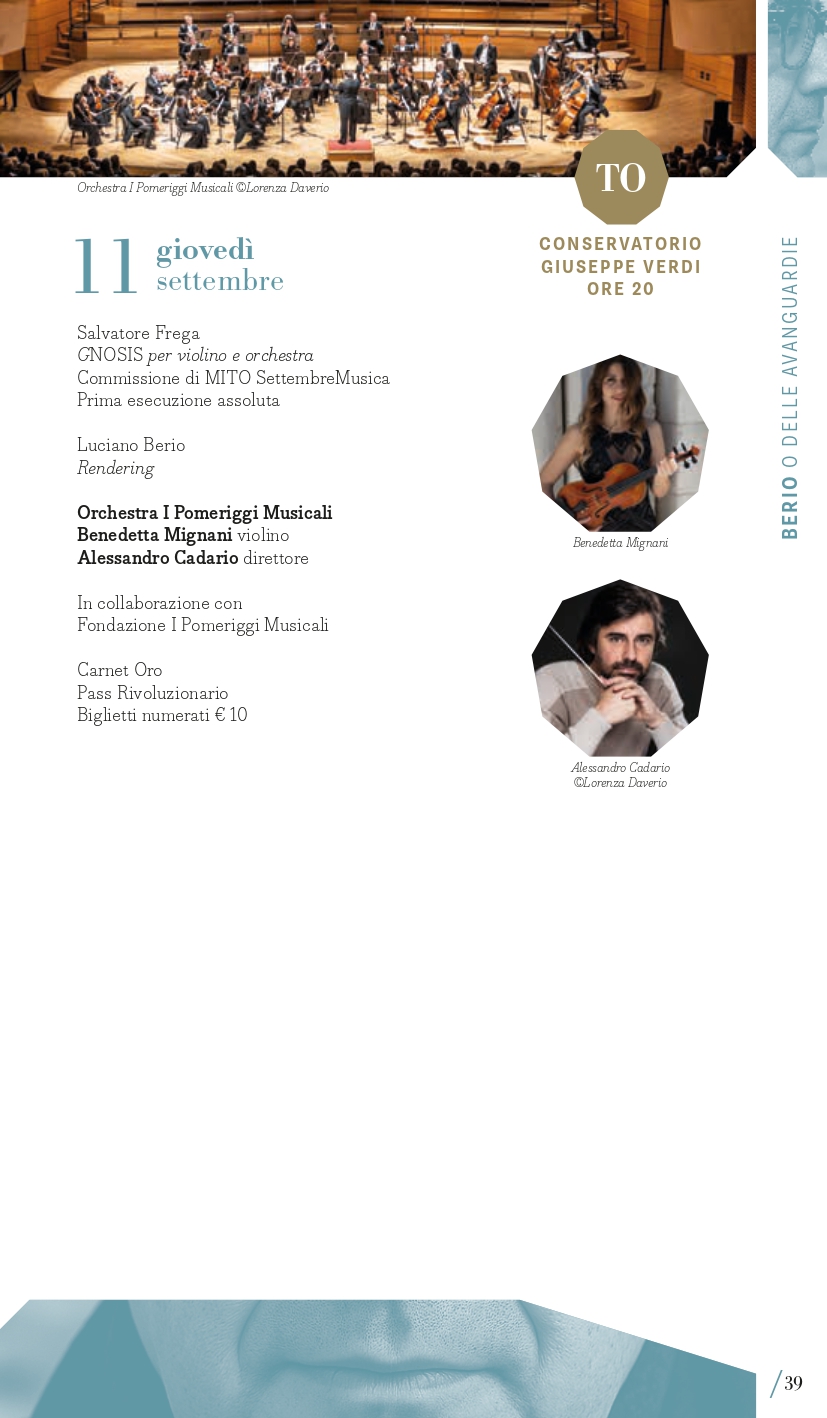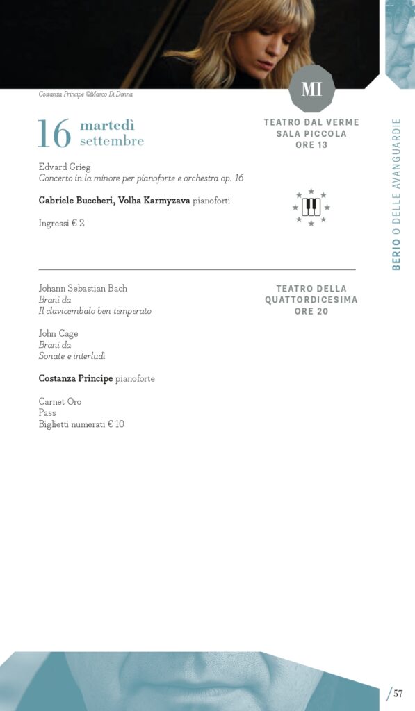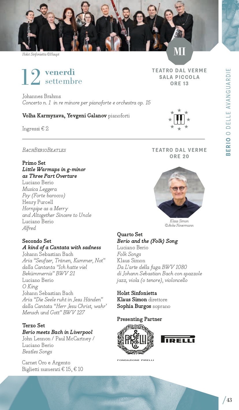 A Luciano Berio, nel centenario della nascita, è dedicato il secondo perimetro tematico del Festival: “Berio e le avanguardie”. Classificato come d’avanguardia per la sua epoca, il compositore ligure coltivò sempre un rapporto dialettico con la musica del passato che spesso usava come un punto di partenza per le sue composizioni. È il caso delle sue Sequenze con cui esplorare le possibilità tecniche ed espressive di molti strumenti, anche attraverso riferimenti stilistici al passato, reinventati attraverso la sua lente contemporanea: a Milano lunedì 15 settembre e a Torino martedì 16 settembre si potranno ascoltare ad esempio la VIII per violino e la IV per pianoforte con i vincitori del Premio Mormone. A Milano ci saranno due proposte di accostamento di pagine di Berio con altre di Bach: il pianista Davide Cabassi, nella Sala della Balla del Museo degli strumenti musicali del Castello Sforzesco di Milano, giovedì 11 settembre, eseguirà la Petite Suite e Wasserklavier con alcuni Preludi e fughe dal Clavicembalo ben temperato; invece venerdì 12 settembre (Teatro Dal Verme) la Holst Sinfonietta diretta da Klaus Simon con il soprano Sophia Burgos presenteranno il programma intitolato BachBerioBeatles, un concerto di cui Pirelli e Fondazione Pirelli sono Presenting Partner. In dialogo con il proprio tempo, Luciano Berio intrattenne un rapporto ricco e complesso con le avanguardie musicali, e in quest’ottica MITO 2025 lo ricorda anche con concerti che presenteranno sue musiche accanto a quelle di due figure cardine della musica d’avanguardia americana come John Cage (Sonate e Interludi a Milano martedì 16 settembre con la pianista Costanza Principe) e Julius Eastman, al quale è dedicato Without Blood There Is No Cause – The body of Julius Eastman, spettacolo di musica, video e parole firmato dal regista Fabio Cherstich con la drammaturgia musicale di Oscar Pizzo, i video di Francesco Sileo (inserito nel perimetro “Ascoltare con gli occhi”); si tratta di un oratorio laico che comprende Turtle Dreams di Meredith Monk, prima opera a cui Eastman partecipò come vocalist, e presenta un collage di composizioni e immagini che esplorano i temi cari all’autore: la condizione delle minoranze nere e queer nell’America conservatrice, il canto popolare afroamericano come risposta alla musica colta bianca, l’improvvisazione come strumento di liberazione e catarsi (a Torino, alle Officine Caos, martedì 16 settembre e a Milano, Teatro Out Off, mercoledì 17 settembre). È dedicato a pagine per voce e pianoforte di Hans Werner Henze il concerto del tenore Marcello Nardis con il pianista Diego Mingolla domenica 7 settembre al Teatro Vittoria di Torino dove, mercoledì 17 settembre, il Quartetto Maurice con la regia del suono di Carlo Laurenzi propongono Sincronie di Berio con due pagine di Clara Iannotta e Jonathan Harvey. Due le nuove commissioni del festival, di Marcello Filotei In tempore belli per violoncello e orchestra affidata a Marco Rossi con Alessandro Bonato sul podio della Filarmonica di Torino (Milano, Teatro Dal Verme, giovedì 11 settembre) e di Salvatore Frega GNOSIS per violino e orchestra (Torino, Conservatorio Verdi, giovedì 11 settembre) con I Pomeriggi Musicali diretti da Alessandro Cadario, direttamente ispirate all’esperienza compositiva di Berio.