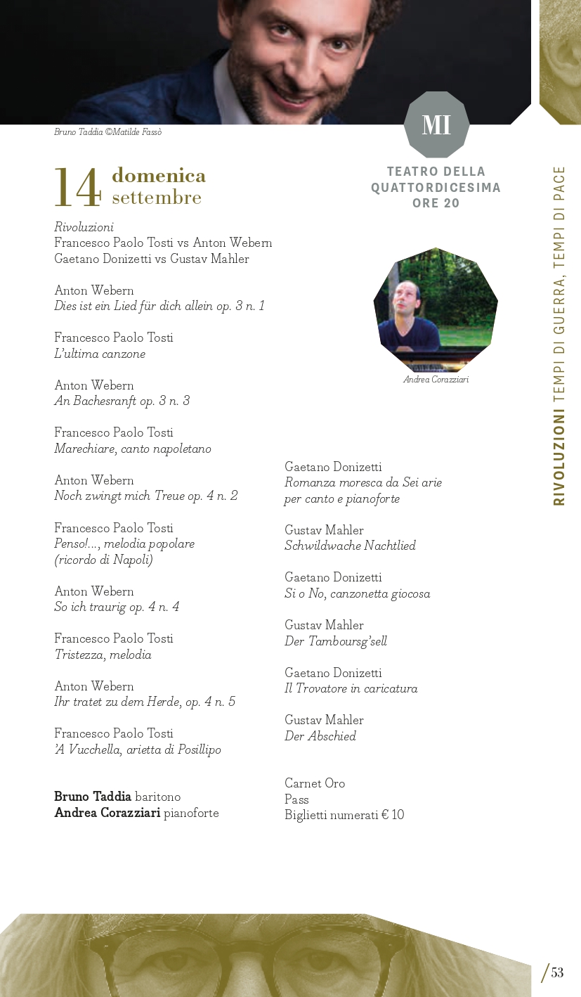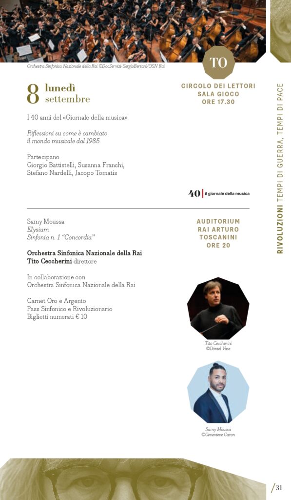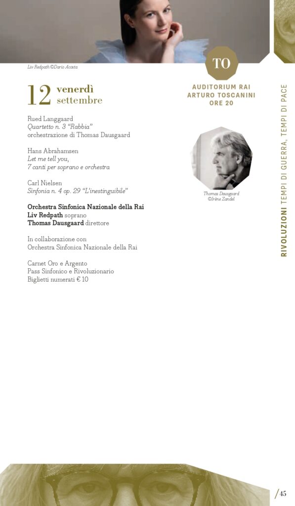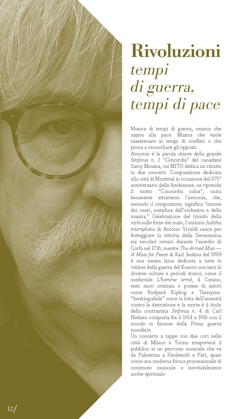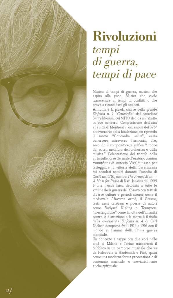 Terzo perimetro tematico, quanto mai attuale e in intersezione con il primo, “Rivoluzioni – tempi di guerra, tempi di pace”. Musica di tempi di guerra, musica che aspira alla pace. Musica che vuole rasserenare in tempi di conflitti. O forse musica che prova a riconciliare gli opposti. MITO SettembreMusica 2025 torna a ospitare una serie di concerti di musica sacra – che negli anni ne hanno più volte caratterizzato la programmazione – o che intendono ristabilire un equilibrio, un’armonia dell’uomo con il cosmo. Armonia è la parola chiave della grande Sinfonia n. 1 “Concordia” del compositore canadese Samy Moussa, cui sono dedicati due appuntamenti con programmi diversi: venerdì 5 settembre a Milano (Auditorium) con l’Orchestra Sinfonica di Milano diretta dallo stesso compositore (con la Sinfonia n. 2 Ahania’s Lament di Moussa e la Quinta di Šostakovič che fa da ponte con l’altro perimetro) poi lunedì 8 settembre a Torino (Auditorium Rai) con l’Orchestra Sinfonica Nazionale della Rai diretta da Tito Ceccherini (per Elysium e Sinfonia “Concordia”). Tra le altre pagine che animano i concerti che Giorgio Battistelli ha collocato in questo perimetro ci sono: l’oratorio Juditha Triumphans di Vivaldi (Torino, Chiesa di San Filippo, sabato 6 settembre con Orchestra e Coro dell’Accademia del Santo Spirito), nato per celebrare il trionfo della virtù sulle forze del male, e The Armed Man. A Mass for Peace di Karl Jenkins (Torino, Conservatorio Verdi, mercoledì 10 settembre, Orchestra del Teatro Regio e Cori Valdese e dell’Istituto Musicale “Corelli” di Pinerolo”), opera scritta nel 1999 come messa laica dedicata a tutte le vittime della guerra del Kosovo con testi di diverse culture e periodi storici, come il medievale L’homme armé, il Corano, testi sacri cristiani, e poesie di autori come Rudyard Kipling e Tennyson. “Inestinguibile” come la lotta dell’umanità contro la distruzione e la morte, è il titolo della contrastata Sinfonia n. 4 di Carl Nielsen (composta fra il 1914 e 1916 tra i boati della Prima Guerra mondiale) affidata venerdì 12 settembre a Torino (Auditorium Rai) all’Orchestra Sinfonica Nazionale della Rai diretta da Thomas Dausgaard. Un concerto a tappe (sabato 13 settembre) nelle città di Milano con il Coro Sinfonico di Milano e a Torino con il Coro dell’Accademia Maghini trasporterà il pubblico in un percorso musicale attraverso composizioni corali da Giovanni Pierluigi da Palestrina (nei 500 anni dalla nascita) a Bach fino a Paul Hindemith e Arvo Pärt, quasi come una moderna forma processionale di contenuto strettamente musicale ma inevitabilmente anche spirituale. Protagonista è sempre la voce, a Milano domenica 14 settembre (Teatro della Quattordicesima) nel recital del baritono Bruno Taddia con Andrea Corazziari al pianoforte dal titolo “Rivoluzioni: Francesco Paolo Tosti vs Anton Webern / Gaetano Donizetti vs Gustav Mahler”.