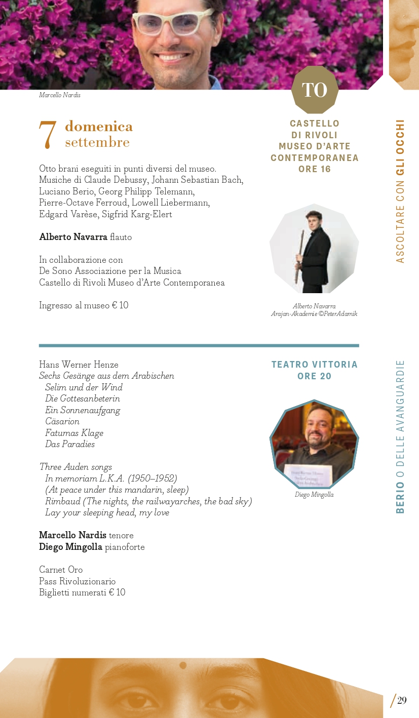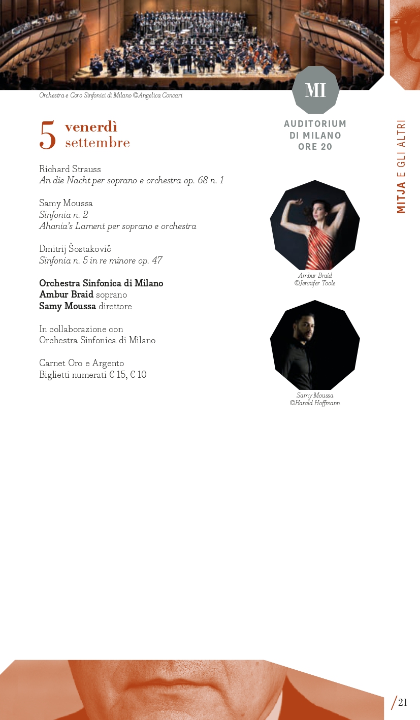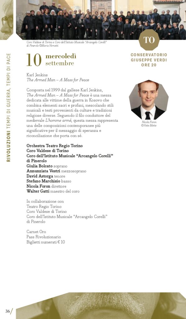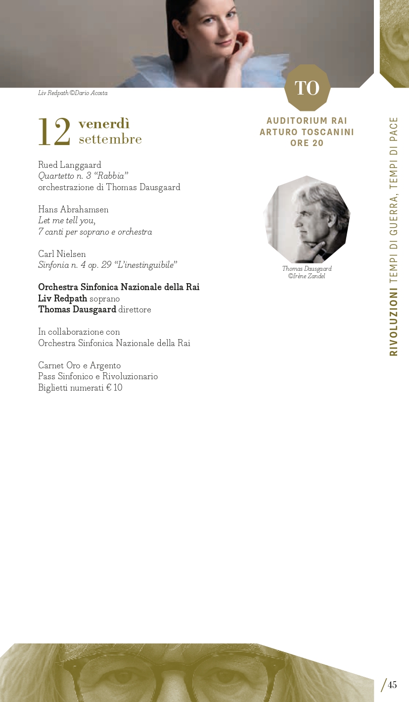 Terzo perimetro tematico, quanto mai attuale e in intersezione con il primo, “Rivoluzioni – tempi di guerra, tempi di pace”. Musica di tempi di guerra, musica che aspira alla pace. Musica che vuole rasserenare in tempi di conflitti. O forse musica che prova a riconciliare gli opposti. MITO SettembreMusica 2025 torna a ospitare una serie di concerti di musica sacra – che negli anni ne hanno più volte caratterizzato la programmazione – o che intendono ristabilire un equilibrio, un’armonia dell’uomo con il cosmo. Armonia è la parola chiave della grande Sinfonia n. 1 “Concordia” del compositore canadese Samy Moussa, cui sono dedicati due appuntamenti con programmi diversi: venerdì 5 settembre a Milano (Auditorium) con l’Orchestra Sinfonica di Milano diretta dallo stesso compositore (con la Sinfonia n. 2 Ahania’s Lament di Moussa e la Quinta di Šostakovič che fa da ponte con l’altro perimetro) poi lunedì 8 settembre a Torino (Auditorium Rai) con l’Orchestra Sinfonica Nazionale della Rai diretta da Tito Ceccherini (per Elysium e Sinfonia “Concordia”). Tra le altre pagine che animano i concerti che Giorgio Battistelli ha collocato in questo perimetro ci sono: l’oratorio Juditha Triumphans di Vivaldi (Torino, Chiesa di San Filippo, sabato 6 settembre con Orchestra e Coro dell’Accademia del Santo Spirito), nato per celebrare il trionfo della virtù sulle forze del male, e The Armed Man. A Mass for Peace di Karl Jenkins (Torino, Conservatorio Verdi, mercoledì 10 settembre, Orchestra del Teatro Regio e Cori Valdese e dell’Istituto Musicale “Corelli” di Pinerolo”), opera scritta nel 1999 come messa laica dedicata a tutte le vittime della guerra del Kosovo con testi di diverse culture e periodi storici, come il medievale L’homme armé, il Corano, testi sacri cristiani, e poesie di autori come Rudyard Kipling e Tennyson. “Inestinguibile” come la lotta dell’umanità contro la distruzione e la morte, è il titolo della contrastata Sinfonia n. 4 di Carl Nielsen (composta fra il 1914 e 1916 tra i boati della Prima Guerra mondiale) affidata venerdì 12 settembre a Torino (Auditorium Rai) all’Orchestra Sinfonica Nazionale della Rai diretta da Thomas Dausgaard. Un concerto a tappe (sabato 13 settembre) nelle città di Milano con il Coro Sinfonico di Milano e a Torino con il Coro dell’Accademia Maghini trasporterà il pubblico in un percorso musicale attraverso composizioni corali da Giovanni Pierluigi da Palestrina (nei 500 anni dalla nascita) a Bach fino a Paul Hindemith e Arvo Pärt, quasi come una moderna forma processionale di contenuto strettamente musicale ma inevitabilmente anche spirituale. Protagonista è sempre la voce, a Milano domenica 14 settembre (Teatro della Quattordicesima) nel recital del baritono Bruno Taddia con Andrea Corazziari al pianoforte dal titolo “Rivoluzioni: Francesco Paolo Tosti vs Anton Webern / Gaetano Donizetti vs Gustav Mahler”.