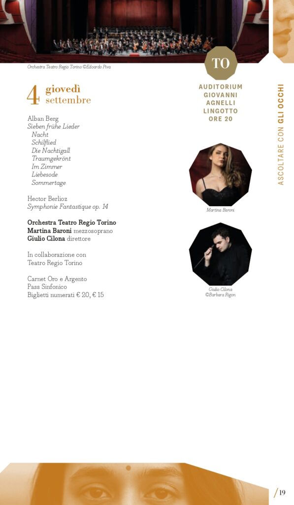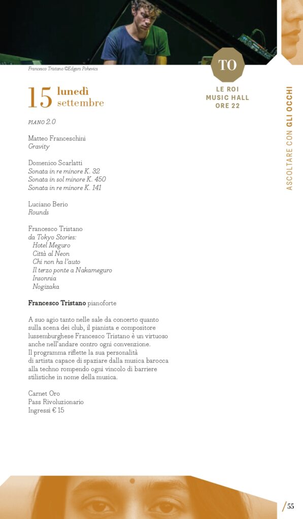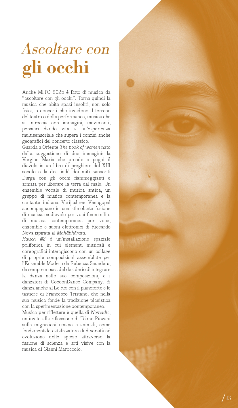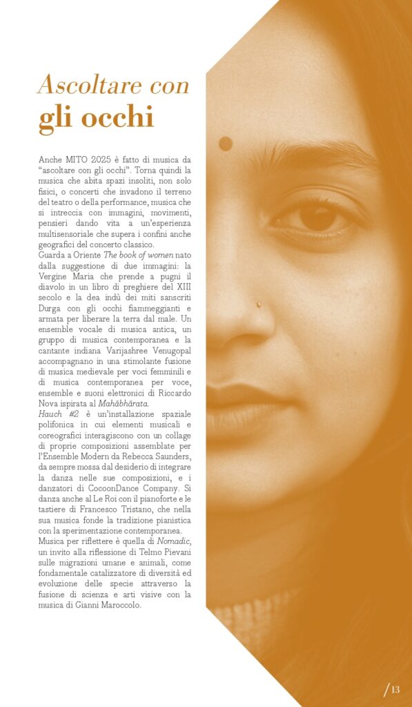 “Ascoltare con gli occhi” è il perimetro che racchiude le proposte multidisciplinari: musica che si vede e che non si ascolta solo da seduti; musica che abita spazi insoliti o concerti che invadono il terreno del teatro o della performance; musica fatta di suoni che si intrecciano con immagini, movimenti, pensieri dando vita a un’esperienza multisensoriale e che supera i confini anche geografici del concerto classico. Paradigma della musica a programma da sentire immaginando scenari è la Sinfonia fantastica di Berlioz in programma giovedì 4 settembre (Torino, Auditorium Lingotto) con l’Orchestra del Regio diretta da Giulio Cilona. Si muove tra le sale del Museo d’arte Contemporanea al Castello di Rivoli, domenica 7 settembre, il concerto del flautista Alberto Navarra in collaborazione con De Sono Associazione per la Musica. Guarda a Oriente lunedì 8 settembre a Milano (Teatro Martinitt) e martedì 9 settembre a Torino (Conservatorio Giuseppe Verdi) The Book of Women di Riccardo Nova che, per esplorare il tema del potere femminile e ispirandosi al Mahābhārata, mette insieme un ensemble vocale di musica antica, un gruppo di musica d’oggi e la cantante indiana Varijashree Venugopal fondendo musica medievale e contemporanea. Hauch #2 – Musik für Tanz è invece un’installazione spaziale polifonica in cui elementi musicali e coreografici interagiscono con un collage di proprie composizioni assemblate per l’Ensemble Modern da Rebecca Saunders (da sempre mossa dal desiderio di integrare la danza nelle sue composizioni) e i danzatori di CocoonDance Company che saranno in scena a Milano, al Teatro Dal Verme, giovedì 18 settembre. A Le Roi Music Hall di Torino lunedì 15 settembre è in programma il concerto Piano 2.0: Francesco Tristano, virtuoso a proprio agio nelle più prestigiose sale del mondo e anche in un club come lo spazio torinese, rompe ogni barriera temporale presentando alcune sue composizioni accanto a pagine di Matteo Franceschini, Domenico Scarlatti e Luciano Berio, per una nuova intersezione tra perimetri in nome della musica. Musica per riflettere è quella di Nomadic. Canto per la biodiversità di e con Telmo Pievani che esplorerà il tema delle migrazioni, sia umane che animali, come fondamentale catalizzatore di diversità ed evoluzione delle specie attraverso la fusione di scienza e arte visive con la musica di Gianni Maroccolo, sabato 6 settembre a Torino (Casa Teatro Ragazzi e Giovani).