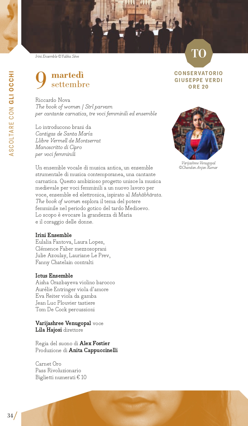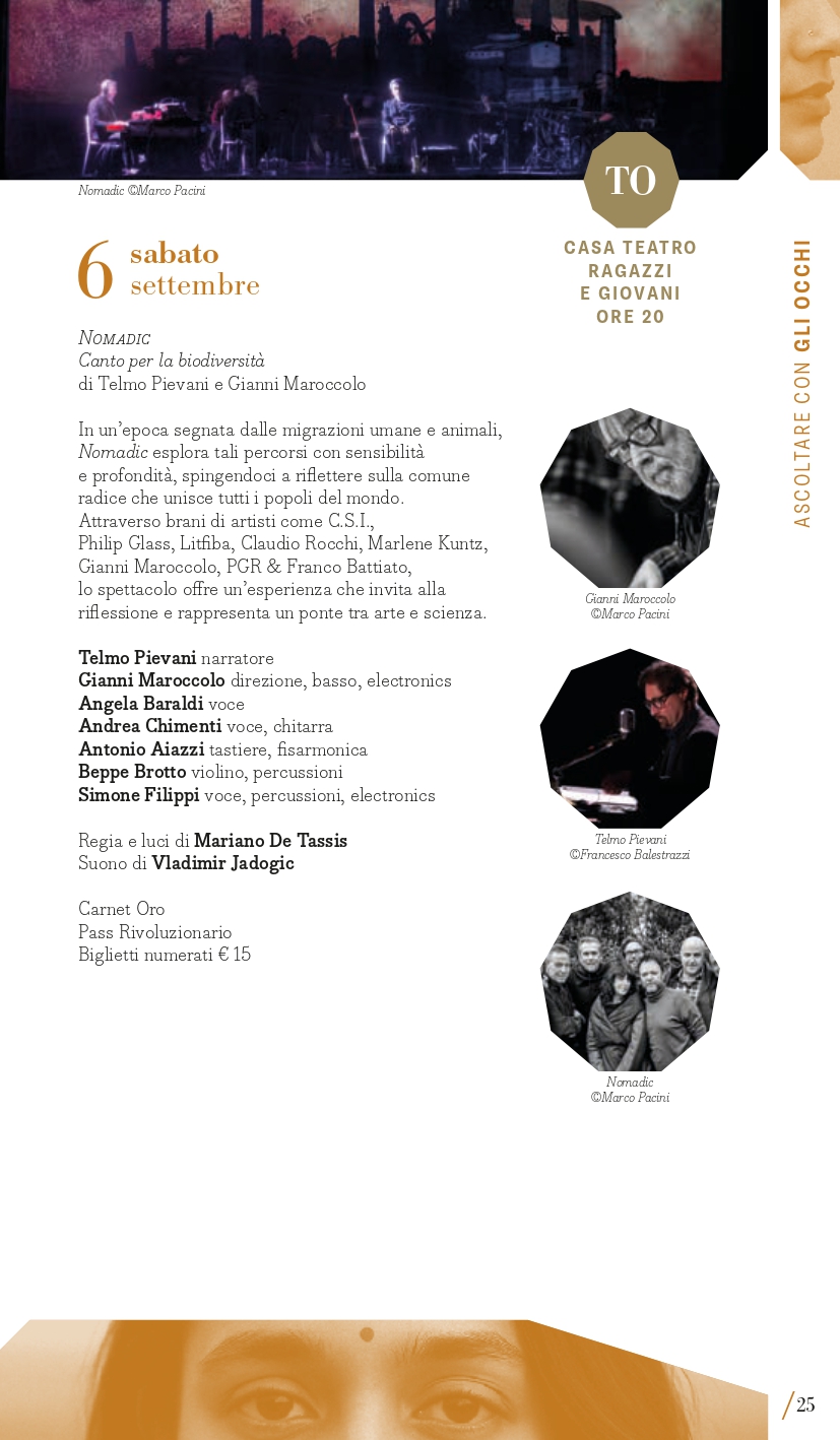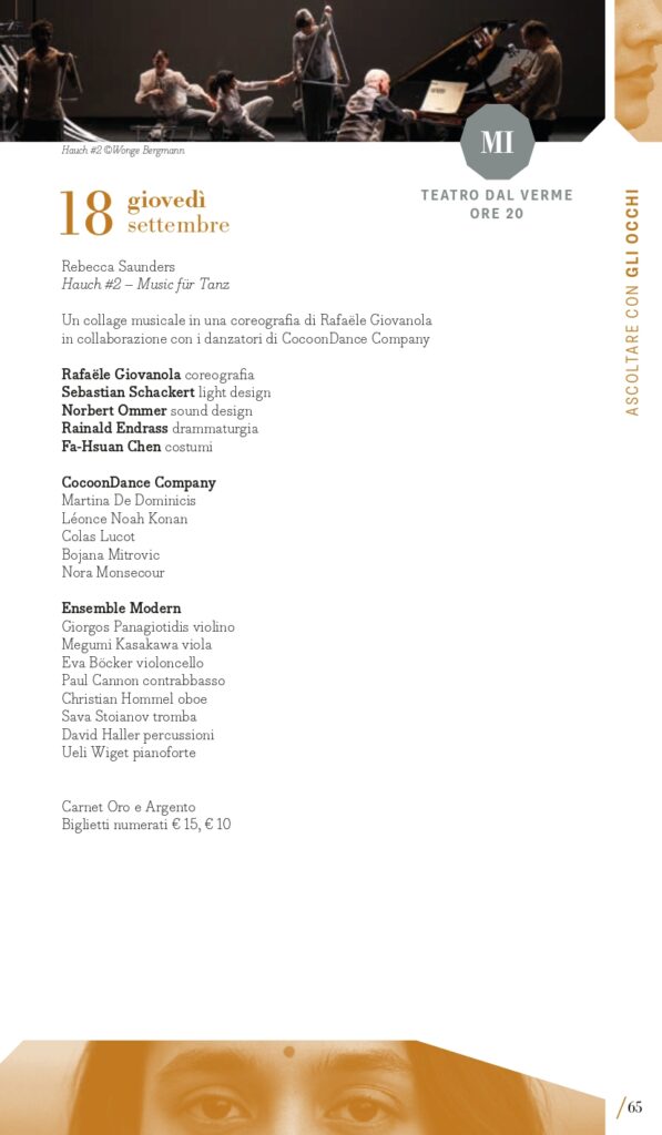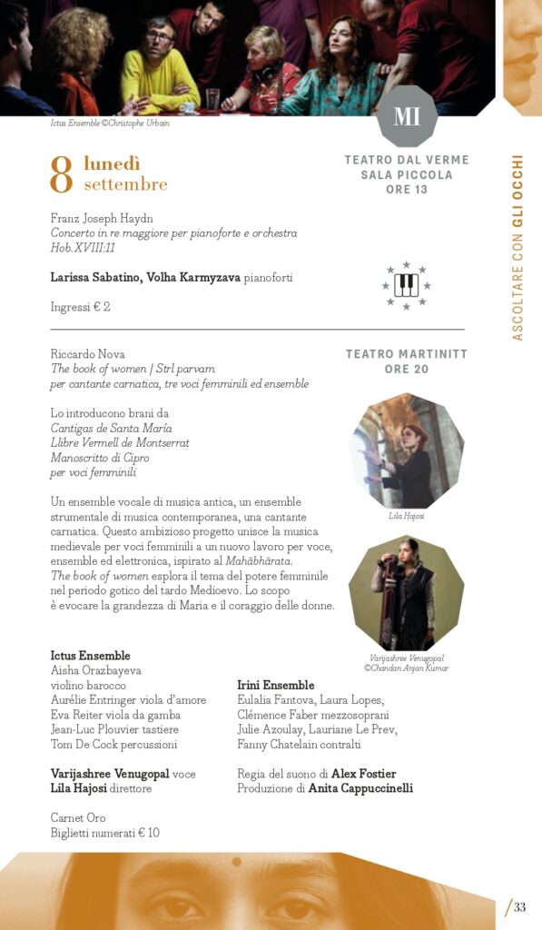 “Ascoltare con gli occhi” è il perimetro che racchiude le proposte multidisciplinari: musica che si vede e che non si ascolta solo da seduti; musica che abita spazi insoliti o concerti che invadono il terreno del teatro o della performance; musica fatta di suoni che si intrecciano con immagini, movimenti, pensieri dando vita a un’esperienza multisensoriale e che supera i confini anche geografici del concerto classico. Paradigma della musica a programma da sentire immaginando scenari è la Sinfonia fantastica di Berlioz in programma giovedì 4 settembre (Torino, Auditorium Lingotto) con l’Orchestra del Regio diretta da Giulio Cilona. Si muove tra le sale del Museo d’arte Contemporanea al Castello di Rivoli, domenica 7 settembre, il concerto del flautista Alberto Navarra in collaborazione con De Sono Associazione per la Musica. Guarda a Oriente lunedì 8 settembre a Milano (Teatro Martinitt) e martedì 9 settembre a Torino (Conservatorio Giuseppe Verdi) The Book of Women di Riccardo Nova che, per esplorare il tema del potere femminile e ispirandosi al Mahābhārata, mette insieme un ensemble vocale di musica antica, un gruppo di musica d’oggi e la cantante indiana Varijashree Venugopal fondendo musica medievale e contemporanea. Hauch #2 – Musik für Tanz è invece un’installazione spaziale polifonica in cui elementi musicali e coreografici interagiscono con un collage di proprie composizioni assemblate per l’Ensemble Modern da Rebecca Saunders (da sempre mossa dal desiderio di integrare la danza nelle sue composizioni) e i danzatori di CocoonDance Company che saranno in scena a Milano, al Teatro Dal Verme, giovedì 18 settembre. A Le Roi Music Hall di Torino lunedì 15 settembre è in programma il concerto Piano 2.0: Francesco Tristano, virtuoso a proprio agio nelle più prestigiose sale del mondo e anche in un club come lo spazio torinese, rompe ogni barriera temporale presentando alcune sue composizioni accanto a pagine di Matteo Franceschini, Domenico Scarlatti e Luciano Berio, per una nuova intersezione tra perimetri in nome della musica. Musica per riflettere è quella di Nomadic. Canto per la biodiversità di e con Telmo Pievani che esplorerà il tema delle migrazioni, sia umane che animali, come fondamentale catalizzatore di diversità ed evoluzione delle specie attraverso la fusione di scienza e arte visive con la musica di Gianni Maroccolo, sabato 6 settembre a Torino (Casa Teatro Ragazzi e Giovani).