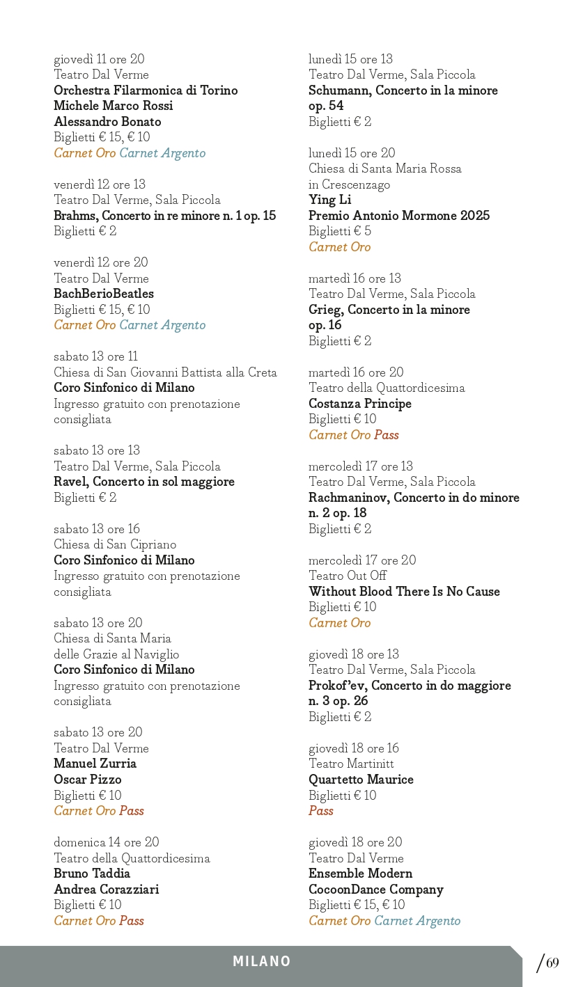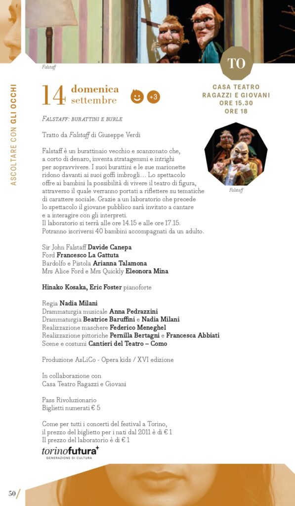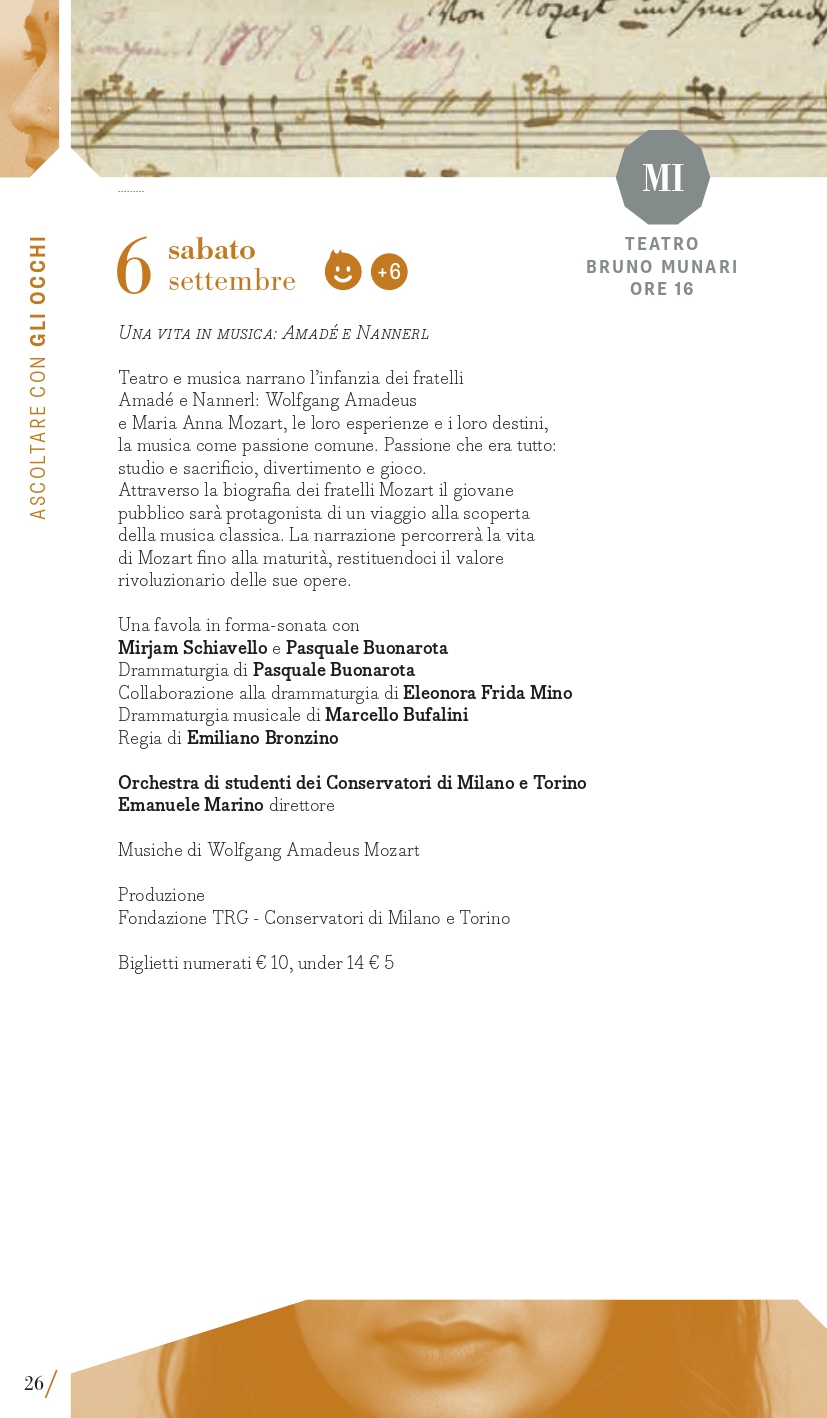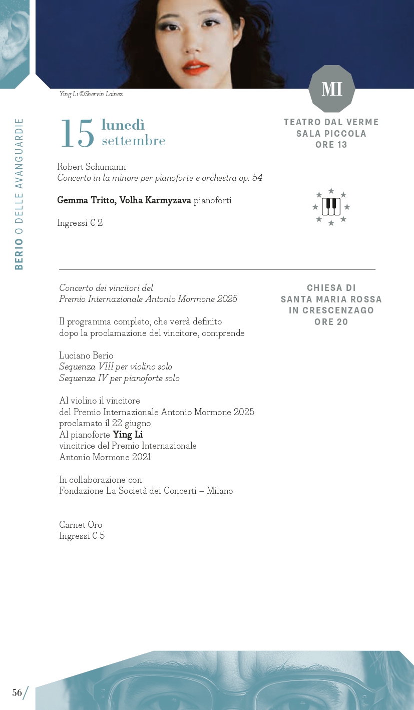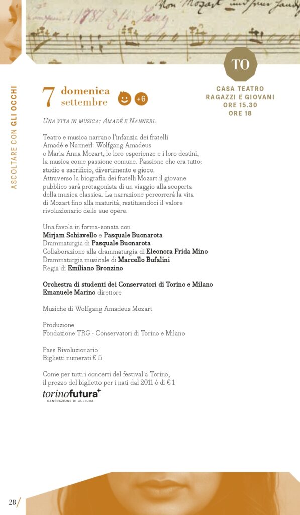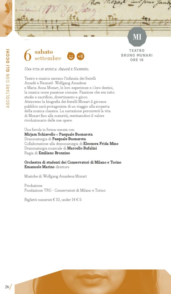 MITO SettembreMusica 2025 non si dimentica dei giovani esecutori e dei giovanissimi spettatori. Ai primi sono dedicati alcuni appuntamenti tra cui il ciclo pianistico Milano Mito d’Europa in cui, dall’8 al 18 settembre (tranne il 14) alle ore 13, nella Sala Piccola del Teatro Dal Verme, è in programma una sorta di Storia “tascabile” del concerto per pianoforte e orchestra in dieci appuntamenti, affidati a due interpreti entrambi alla tastiera, che affronteranno l’esecuzione di concerti iconici dalle forme classiche di Haydn e Beethoven alle inquietudini del primo Novecento di Rachmaninov e Prokof’ev. Ne sono protagonisti giovani pianisti di varia provenienza ma tutti allievi di Davide Cabassi, che stanno progressivamente imponendosi per bravura e carisma al centro della scena concertistica attuale. A Torino invece spazio al progetto I Conservatori in Piemonte, nato nel 2021 con l’obiettivo di traghettare giovani talenti emergenti della musica dalla scuola al pubblico. Grazie a una convenzione con le Direzioni dei quattro Conservatori della Regione, alcuni allievi saranno protagonisti dei concerti di venerdì 5 e giovedì 11 settembre. Obiettivo Orchestra è formata da giovani musicisti che frequentano i corsi della Scuola di Alto Perfezionamento Musicale di Saluzzo sotto la guida di uno dei grandi maestri della scuola direttoriale italiana, Donato Renzetti; con lui saranno in concerto a Torino sabato 6 settembre (Teatro Alfieri). Per gli spettatori dai 6 anni in su, sabato 6 (Milano, Teatro Bruno Munari) e domenica 7 settembre (Torino, Casa Teatro Ragazzi e Giovani) andrà in scena la favola Una vita in musica: Amadé e Nannerl, un viaggio alla scoperta della musica classica attraverso la vita dei due fratelli Mozart con Mirjam Schiavello e Pasquale Buonarota, autore anche della drammaturgia, e l’Orchestra di studenti dei Conservatori di Torino e Milano diretta da Emanuele Marino. Per i piccolissimi, dai 3 anni in su, domenica 14 settembre (Torino, Casa Teatro Ragazzi e Giovani) Falstaff: burattini e burle tratto dall’opera di Verdi, una produzione AsLiCo – Opera Kids.