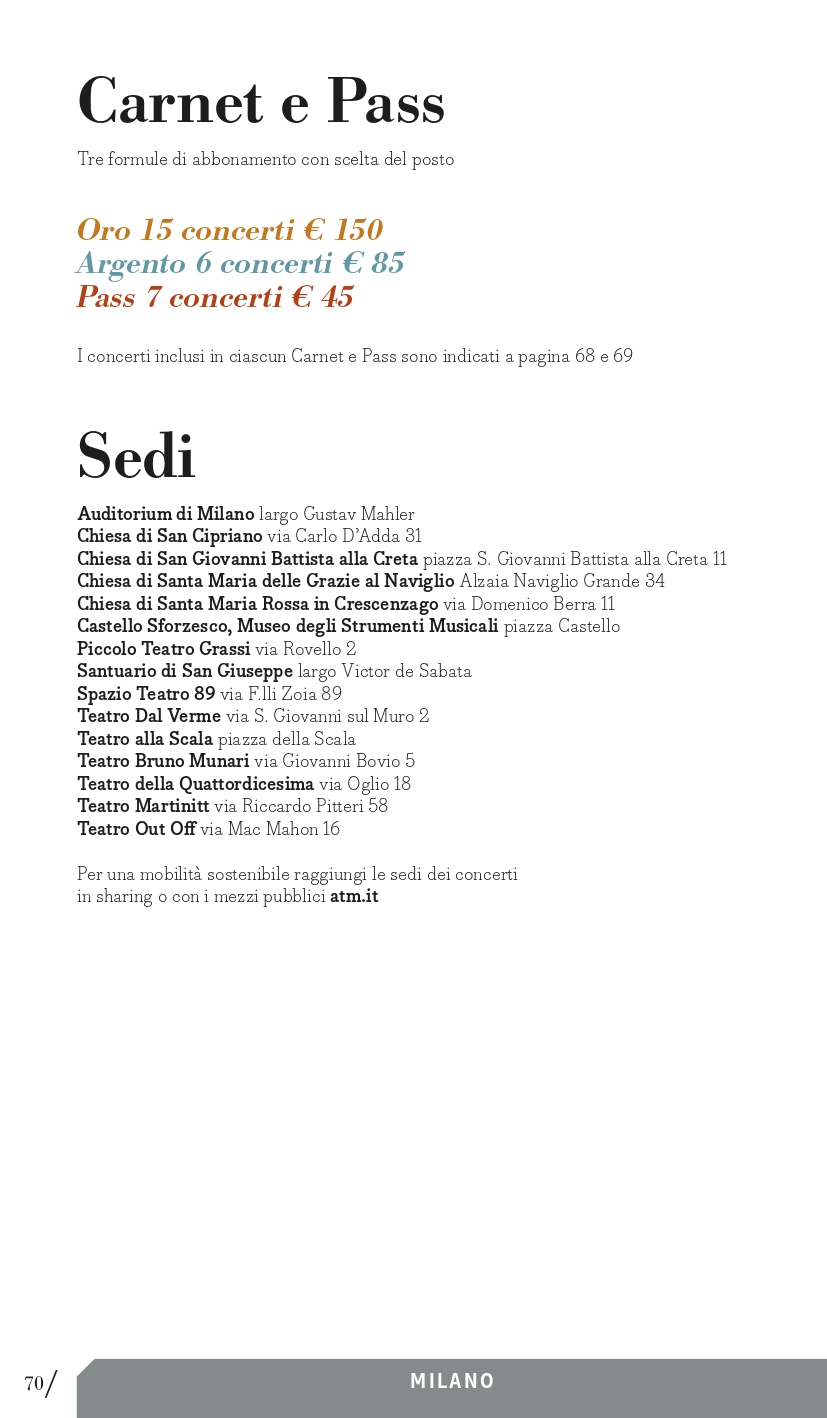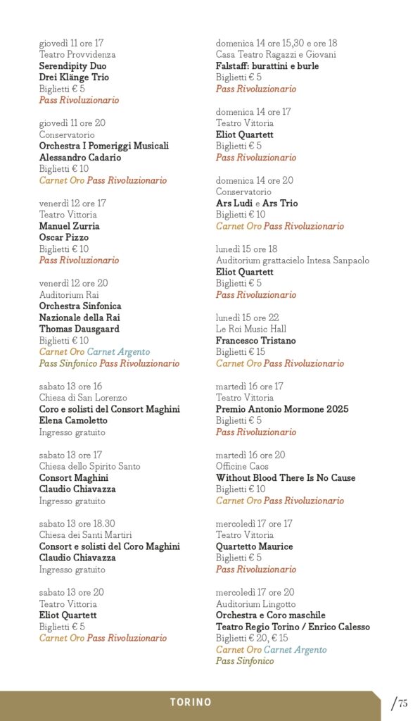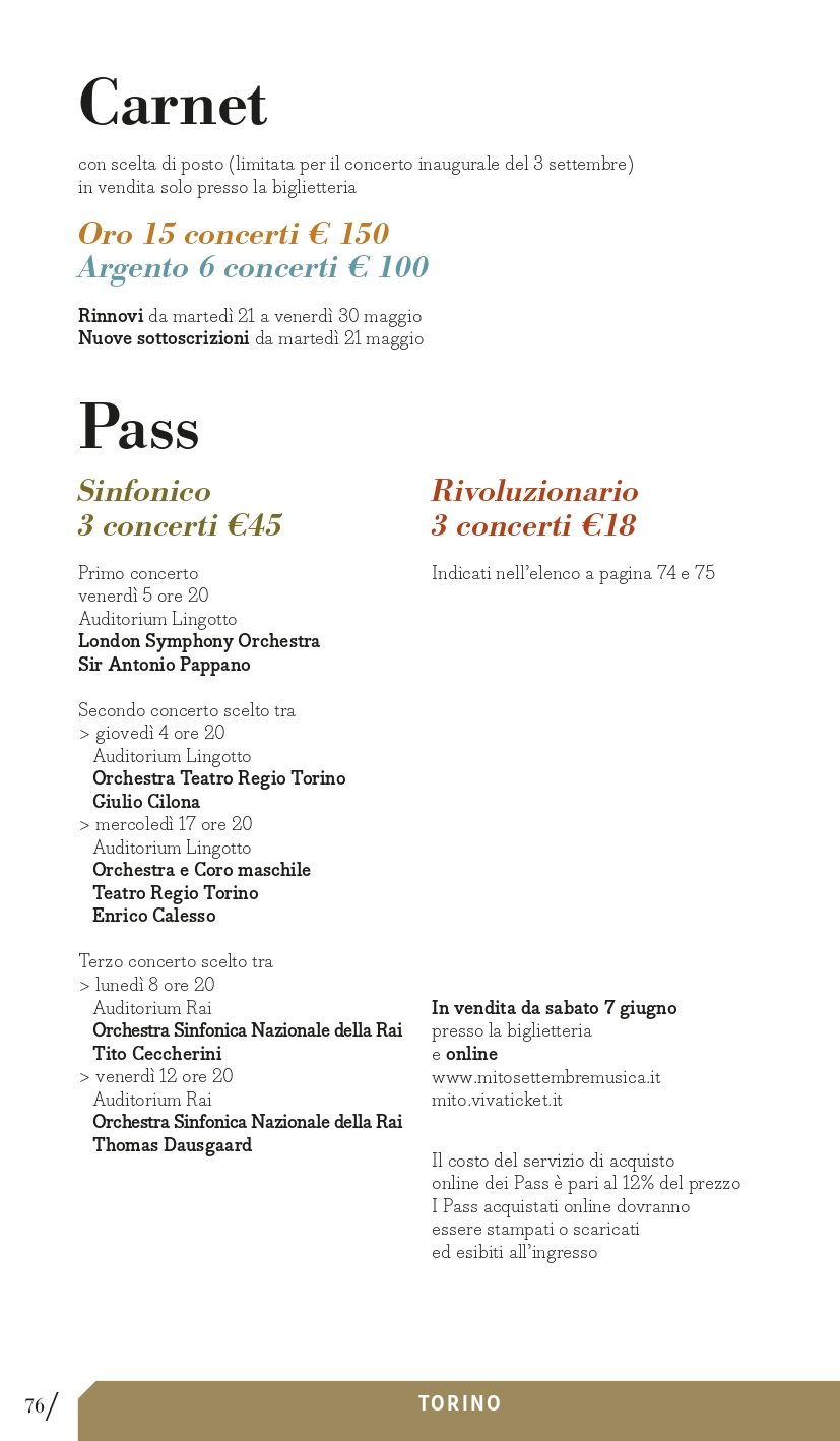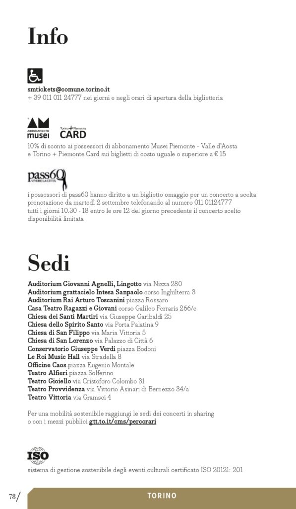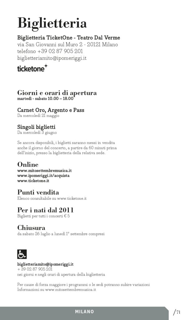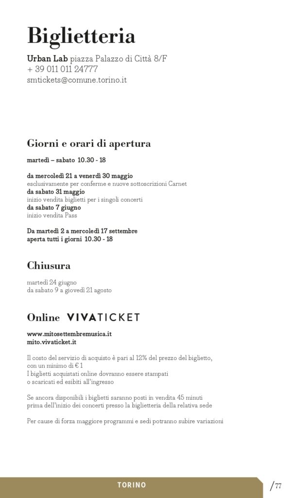 Se ancora disponibili, i biglietti saranno messi in vendita anche il giorno del concerto, a partire da 45 minuti prima dell’inizio presso la biglietteria della relativa sede.