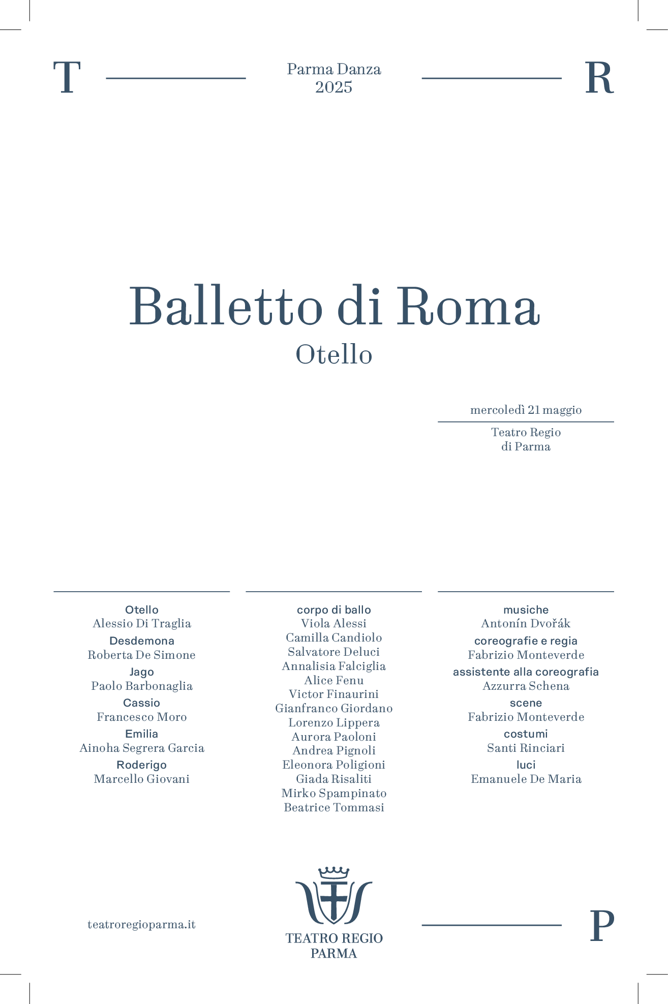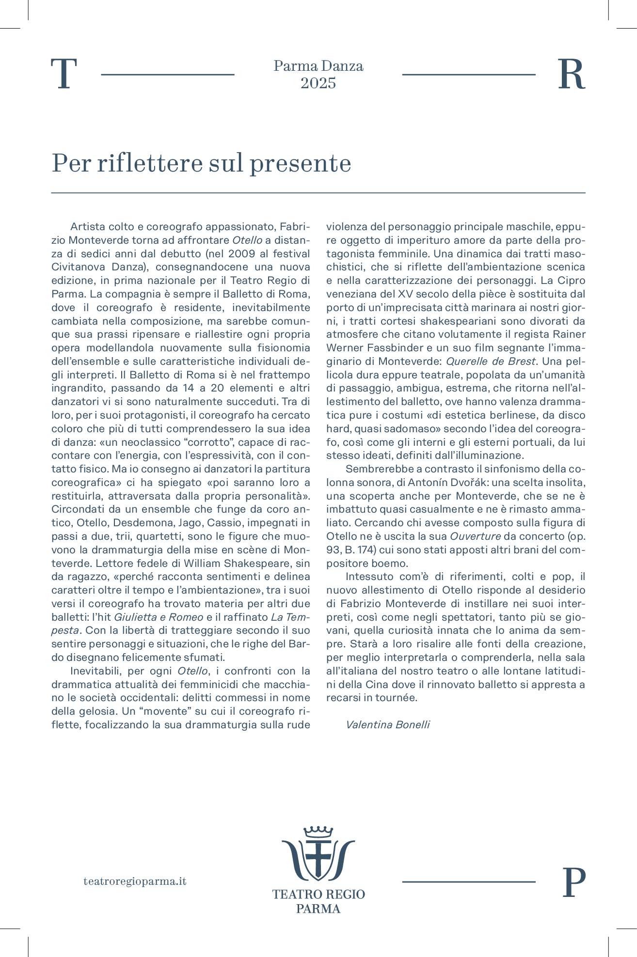 “Artista colto e coreografo appassionato – scrive Valentina Bonelli, Fabrizio Monteverde torna ad affrontare Otello a distanza di sedici anni dal debutto (nel 2009 al festival Civitanova Danza), consegnandocene una nuova edizione, in prima nazionale per il Teatro Regio di Parma. La compagnia è sempre il Balletto di Roma, dove il coreografo è residente, inevitabilmente cambiata nella composizione, ma sarebbe comunque sua prassi ripensare e riallestire ogni propria opera modellandola nuovamente sulla fisionomia dell’ensemble e sulle caratteristiche individuali degli interpreti. Il Balletto di Roma si è nel frattempo ingrandito, passando da 14 a 20 elementi e altri danzatori vi si sono naturalmente succeduti. Tra di loro, per i suoi protagonisti, il coreografo ha cercato coloro che più di tutti comprendessero la sua idea di danza: «un neoclassico “corrotto”, capace di raccontare con l’energia, con l’espressività, con il contatto fisico. Ma io consegno ai danzatori la partitura coreografica» ci ha spiegato «poi saranno loro a restituirla, attraversata dalla propria personalità». Circondati da un ensemble che funge da coro antico, Otello, Desdemona, Jago, Cassio, impegnati in passi a due, trii, quartetti, sono le figure che muovono la drammaturgia della mise en scène di Monteverde. Lettore fedele di William Shakespeare, sin da ragazzo, «perché racconta sentimenti e delinea caratteri oltre il tempo e l’ambientazione», tra i suoi versi il coreografo ha trovato materia per altri due balletti: l’hit Giulietta e Romeo e il raffinato La Tempesta. Con la libertà di tratteggiare secondo il suo sentire personaggi e situazioni, che le righe del Bardo disegnano felicemente sfumati. Inevitabili, per ogni Otello, i confronti con la drammatica attualità dei femminicidi che macchiano le società occidentali: delitti commessi in nome della gelosia. Un “movente” su cui il coreografo riflette, focalizzando la sua drammaturgia sulla rude violenza del personaggio principale maschile, eppure oggetto di imperituro amore da parte della protagonista femminile. Una dinamica dai tratti masochistici, che si riflette nell’ambientazione scenica e nella caratterizzazione dei personaggi. La Cipro veneziana del XV secolo della pièce è sostituita dal porto di un’imprecisata città marinara ai nostri giorni, i tratti cortesi shakespeariani sono divorati da atmosfere che citano volutamente il regista Rainer Werner Fassbinder e un suo film segnante l’immaginario di Monteverde: Querelle de Brest. Una pellicola dura eppure teatrale, popolata da un’umanità di passaggio, ambigua, estrema, che ritorna nell’allestimento del balletto, ove hanno valenza drammatica pure i costumi «di estetica berlinese, da disco hard, quasi sadomaso» secondo l’idea del coreografo, così come gli interni e gli esterni portuali, da lui stesso ideati, definiti dall’illuminazione”.