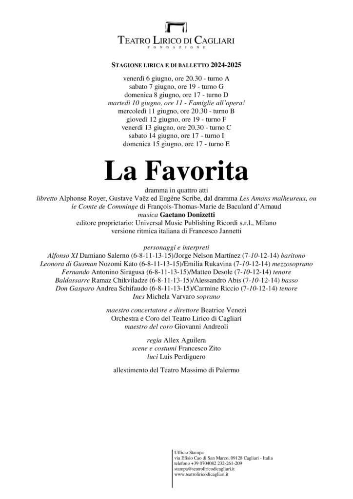 Venerdì 6 giugno alle 20.30 (turno A) la Stagione lirica e di balletto 2024-2025 del Teatro Lirico di Cagliari riprende con l’ottavo appuntamento; un titolo davvero imperdibile, la cui ultima esecuzione a Cagliari risale alla stessa Stagione 1910 al Teatro Civico della precedente Wally (115 anni fa!), se si esclude un’unica rappresentazione all’aperto nell’agosto 1932 all’Eden Park: La Favorita, dramma in quattro atti su libretto di Alphonse Royer, Gustave Vaёz ed Eugène Scribe, tratto dal dramma Les Amans malheureux, ou le Comte de Comminge di François-Thomas-Marie de Baculard d’Arnaud, e musica di Gaetano Donizetti.