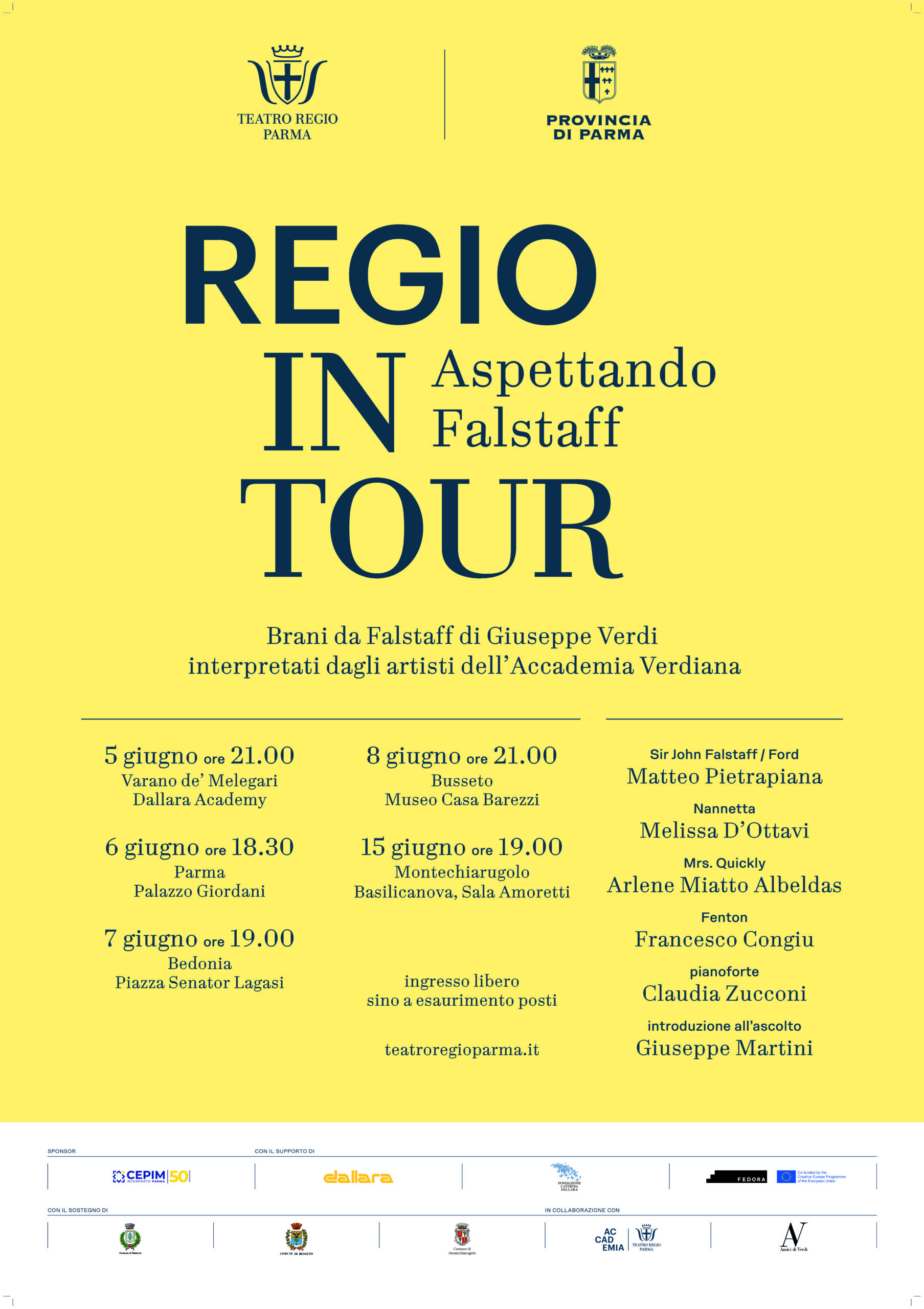 “Portare la musica lirica nei Comuni della Provincia, stimolare la scoperta del nostro territorio e dei luoghi di interesse storico-artistico, creare preziose occasioni per valorizzare il talento di giovani artisti formatisi all’Accademia Verdiana. Su questo triplice obiettivo Regio in Tour rinnova la propria missione e grazie alla coprogettazione con la Provincia di Parma, al sostegno di CEPIM, delle autonomie locali e alla forte sinergia con partner pubblici e privati di rilievo, presenta quest’anno Aspettando Falstaff, cinque concerti a ingresso libero dedicati a Falstaff, che debutterà in ottobre al Teatro Regio di Parma durante il Festival Verdi. Un’occasione di conoscenza e incontro che ci auguriamo vogliano cogliere non solo gli appassionati, ma tutti coloro che grazie all’introduzione all’ascolto di Giuseppe Martini, vorranno divertirsi scoprendo l’opera, le sue storie e i suoi valori sempre attuali”.