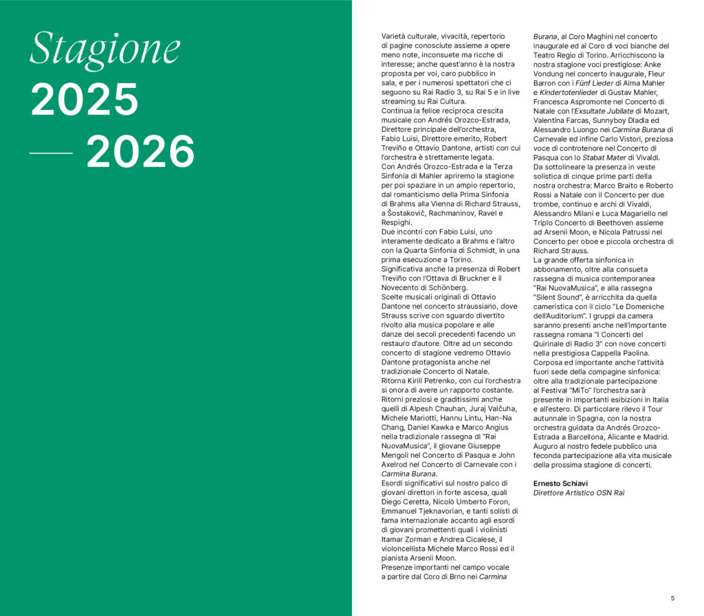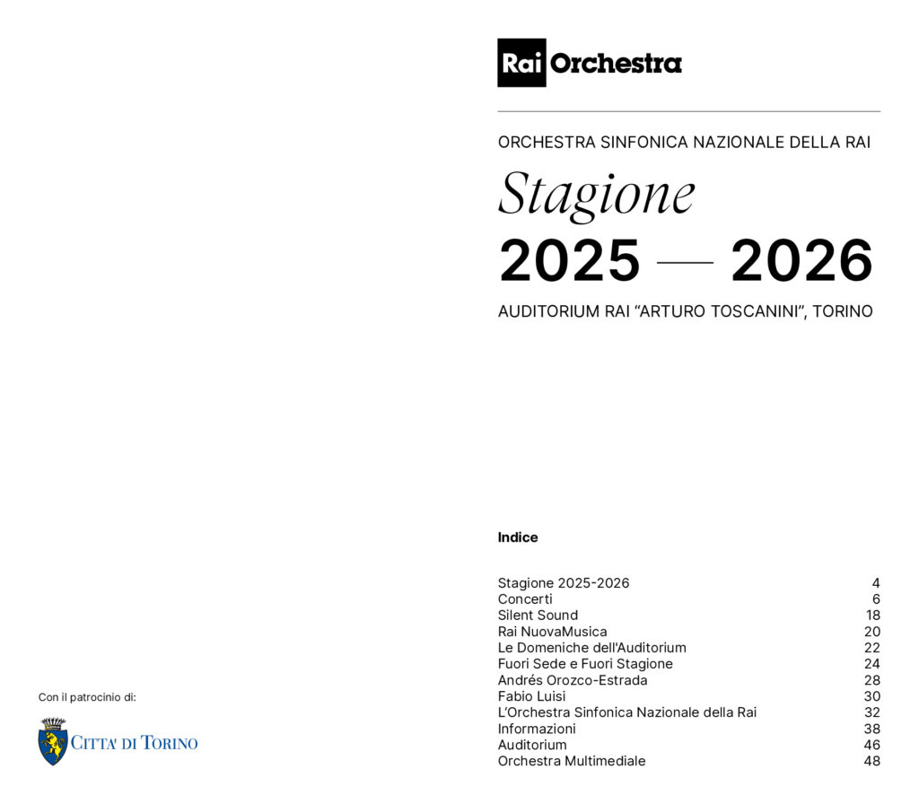 Sono alcune delle proposte della Stagione Sinfonica 2025/2026 dell’Orchestra Sinfonica Nazionale della Rai, che si dipana da ottobre a giugno con 22 concerti in doppia serata all’Auditorium Rai “Arturo Toscanini” di Torino. A questi si aggiungono il ciclo “Silent Sound” dedicato al cinema muto, i concerti di Natale, Carnevale, Pasqua, le serate di Rai NuovaMusica, la musica da camera delle “Domeniche dell’Auditorium”, i concerti del Quirinale alla Cappella Paolina, il ritorno alla Scala per Milano Musica e una grande tournée in Spagna che toccherà le città di Barcellona, Alicante e Madrid. Un cartellone in grado di unire, dice il Direttore artistico Ernesto Schiavi, «varietà culturale, vivacità, repertorio di pagine conosciute assieme a opere meno note, inconsuete ma ricche di interesse». Tutti gli appuntamenti sono trasmessi da Radio3, in live streaming gratuito sul portale di Rai Cultura e molti sono proposti anche in TV su Rai5.