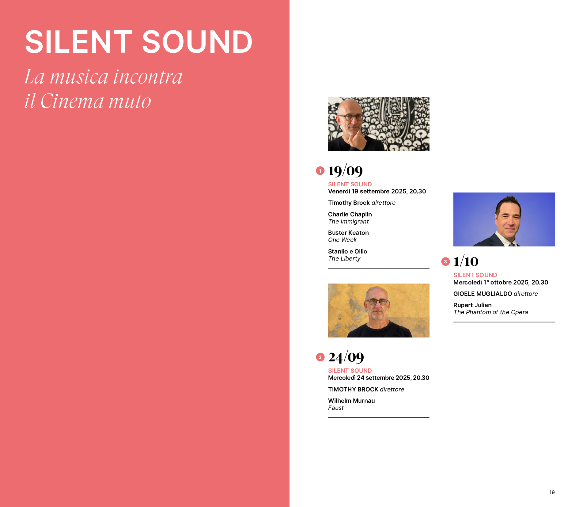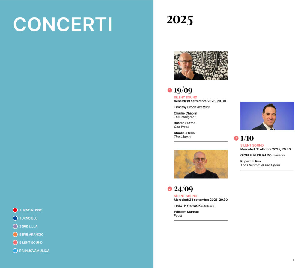 La stagione 2025/2026 dell’OSN Rai è preceduta, dal 19 settembre al 1° ottobre, da tre appuntamenti dedicati al cinema muto, intitolati “Silent Sound”, che prevedono la proiezione di film con colonna sonora eseguita dal vivo. Protagonista sul podio dei primi due concerti, in programma il 19 e il 24 settembre, il compositore e direttore d’orchestra Timothy Brock. Nel primo appuntamento sono proposti The Immigrant di Charlie Chaplin, One Week di Buster Keaton e Liberty di Stanlio e Ollio. Il 24 settembre la serata è dedicata al Faust di Murnau, capolavoro del cinema espressionista tedesco. Il 1° ottobre, invece, è la volta di The Phantom of the Opera di Rupert Julian, altra pietra miliare del cinema muto. In questa terza occasione, a salire sul podio è Gioele Muglialdo.