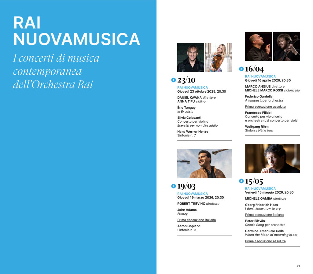Torna Rai NuovaMusica, con quattro appuntamenti dedicati al repertorio novecentesco e contemporaneo distribuiti come di consueto nel corso della stagione. Il primo, il 23 ottobre, segna il ritorno sul podio di Daniel Kawka con Anna Tifu violinista solista e musiche di Silvia Colasanti, Éric Tanguy e Hans Werner Henze. Il secondo, il 19 marzo, è affidato a Robert Treviño. Il terzo, 16 aprile, vede tornare alla guida dell’OSN Rai anche Marco Angius, che dirige il Concerto per violoncello e orchestra di Francesco Filidei – solista Michele Marco Rossi, al suo debutto con la Rai – e la prima assoluta di A tempest di Federico Gardella. Il quarto e ultimo appuntamento di Rai NuovaMusica, in programma il 15 maggio, è affidato invece a Michele Gamba, che propone la prima esecuzione italiana I don’t know how to cry di Georg Friedrich Haas e la prima assoluta di When the moon of mourning is set di Carmine-Emanuele Cella. Quest’ultimo concerto è replicato il 18 maggio al Teatro alla Scala nell’ambito di Milano Musica.