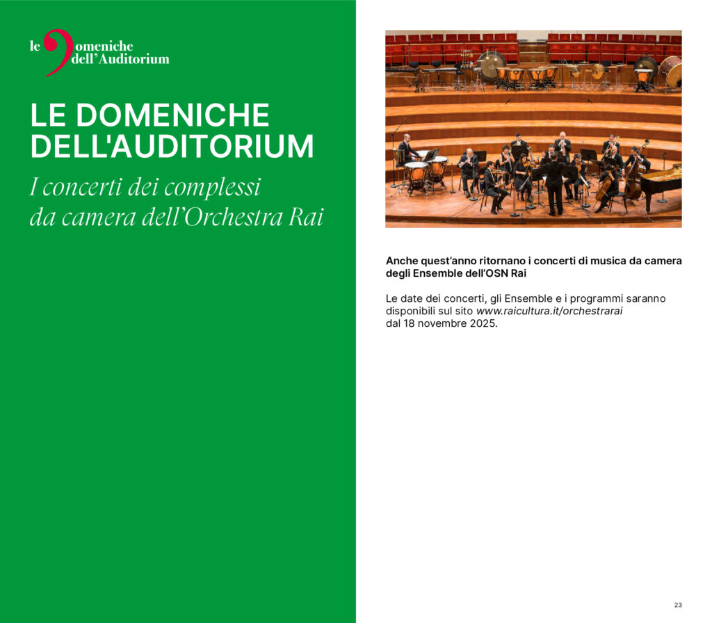 La stagione sinfonica è affiancata, da gennaio a giugno 2026, da un’ampia scelta di concerti cameristici in programma la domenica mattina alle 10.30, raccolti sotto la consueta etichetta “Le domeniche dell’Auditorium”. I gruppi da camera saranno presenti anche nell’importante rassegna romana “I Concerti del Quirinale” di Radio3 con nove mattinate nella prestigiosa Cappella Paolina.