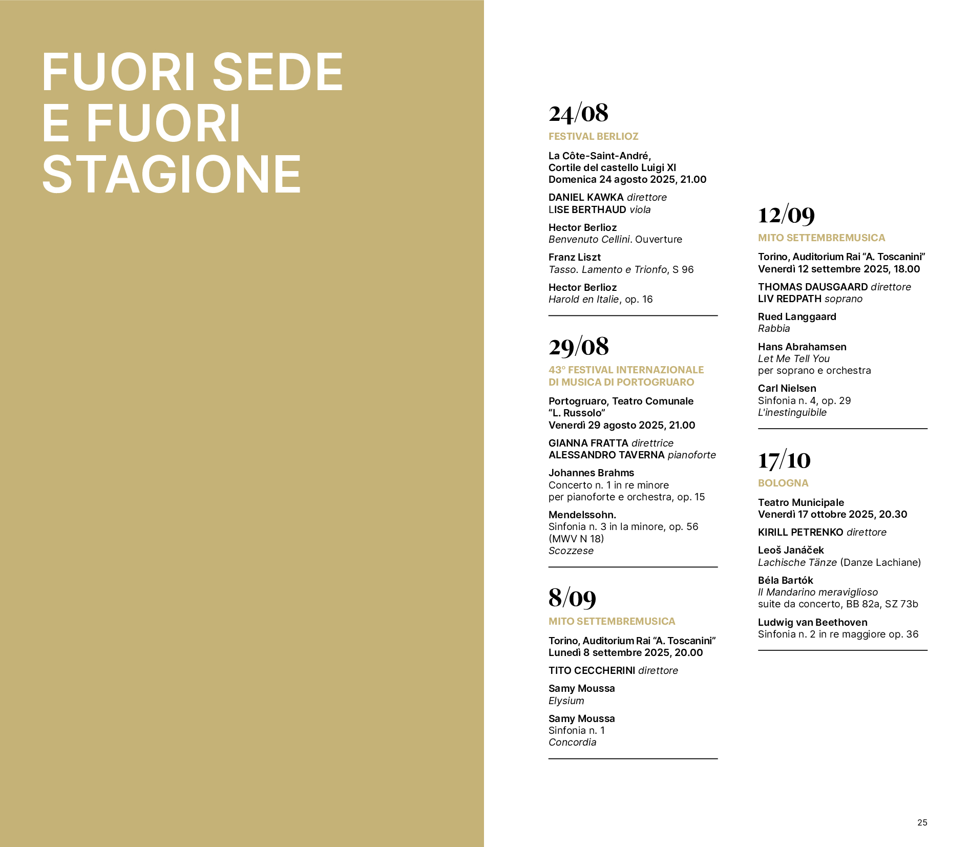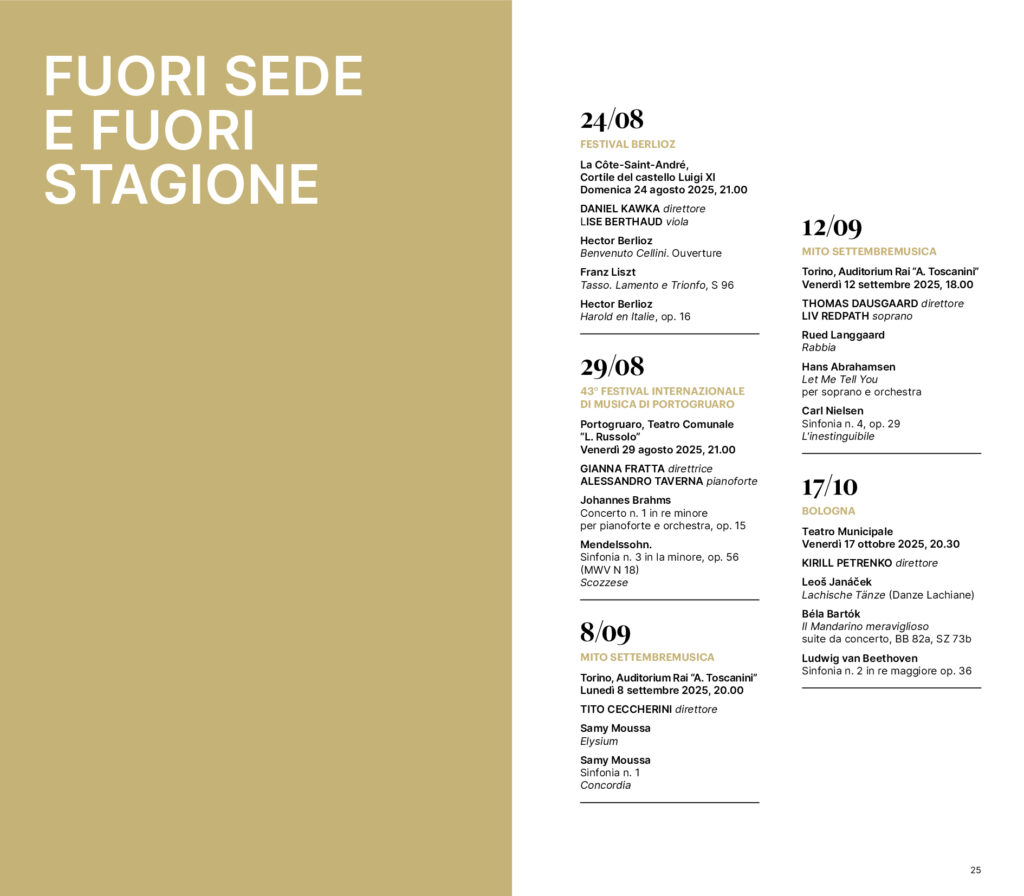 L’OSN Rai e il suo Direttore principale Andrés Orozco-Estrada saranno protagonisti di una importante tournée in Spagna, che toccherà, con quattro concerti dal 3 al 6 novembre 2025, le città di Barcellona, Alicante e Madrid. Due i programmi: nel primo Orozco-Estrada dirigerà brani di Respighi, Bartók, Ravel e il Concerto per viola e orchestra di Walton con Antoine Tamestit solista. Nel secondo, invece, il Direttore principale affiancherà la Symphonie fantastique di Berlioz al Concerto K 218 di Mozart, con violinista Michael Barenboim. La compagine Rai sarà inoltre protagonista di un concerto al Festival Berlioz di La Côte-Saint-André, in Francia, domenica 24 agosto 2025 nel cortile del Castello ‘Luigi XI’. A salire sul podio Daniel Kawka, che dirigerà l’Harold en Italie di Berlioz e Tasso. Lamento e trionfo di Liszt. Sempre in agosto, venerdì 29, l’OSN Rai sarà impegnata al Festival Internazionale di Musica di Portogruaro, diretta da Gianna Fratta e con Alessandro Taverna al pianoforte. A settembre, come di consueto, l’OSN Rai tornerà protagonista del cartellone MITO SettembreMusica, con due concerti che vedranno sul podio dell’Auditorium Rai di Torino Tito Ceccherini (8 settembre), per una serata interamente dedicata al compositore canadese Samy Moussa, e Thomas Dausgaard (12 settembre), che dirigerà la Sinfonia n. 4 di Nielsen e Let me tell you di Hans Abrahamsen con voce solista Liv Redpath. Diretta da Kirill Petrenko, l’Orchestra Rai sarà poi a Bologna il 17 ottobre per il Bologna Festival. Il 13 dicembre sarà la volta del tradizionale Concerto di Natale nella Basilica di San Francesco ad Assisi, che sarà, come di consueto, trasmesso su Rai1 il 25 dicembre. Infine, il 18 maggio 2026 l’OSN Rai tornerà al Teatro alla Scala nell’ambito di Milano Musica, diretta da Michele Gamba.